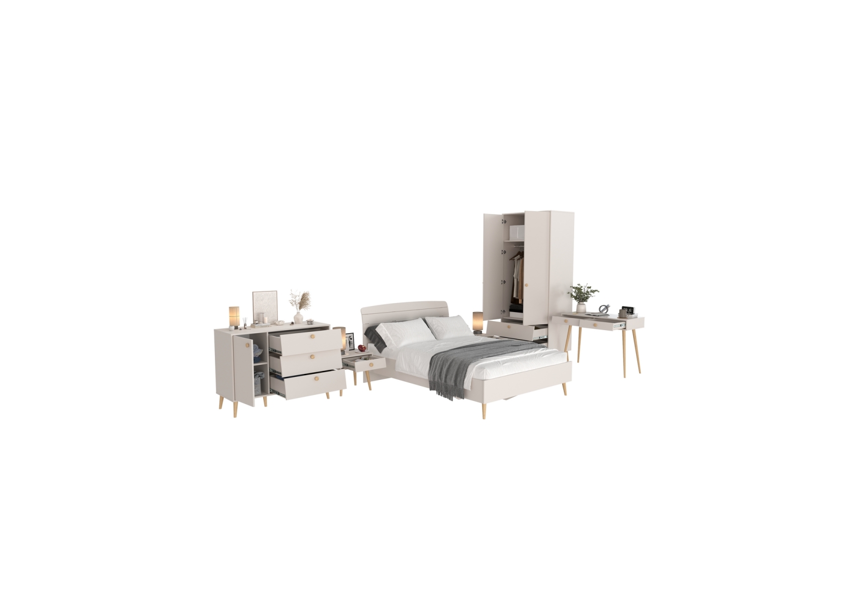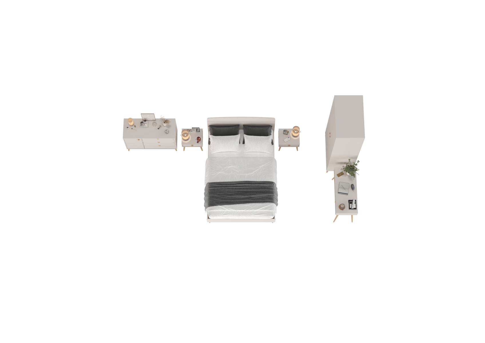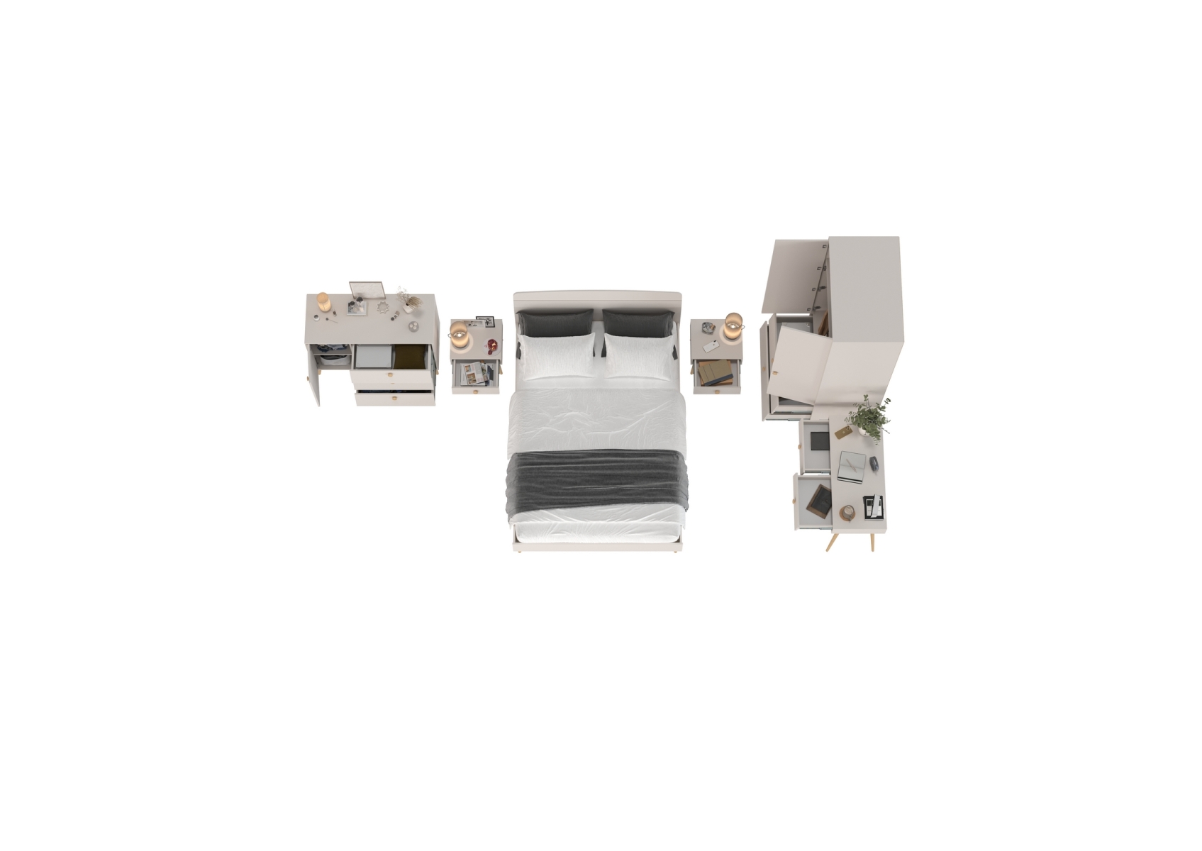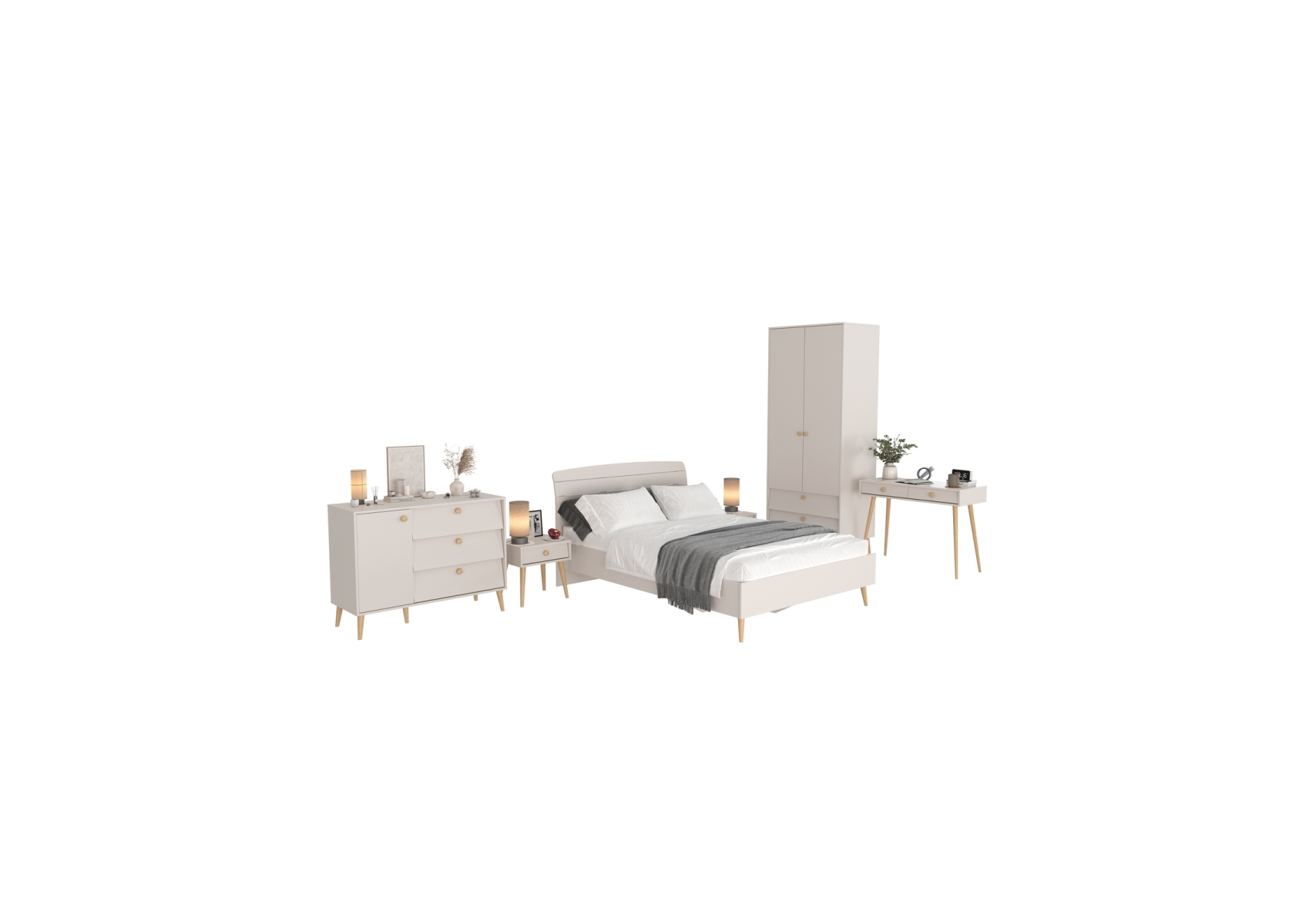 Спальный гарнитур Афина с кроватью 1400. Цвет - кашемир серый. Количество мебели - 6 шт. Комплектация включает включает кровать 1400 Афина 4-22911, две тумбы прикроватные Афина 4-09901, туалетный столик Афина 4-25904, комод с дверкой и тремя ящиками Афина 4-44901 и шкаф 2-х дверный Афина 4-75901.