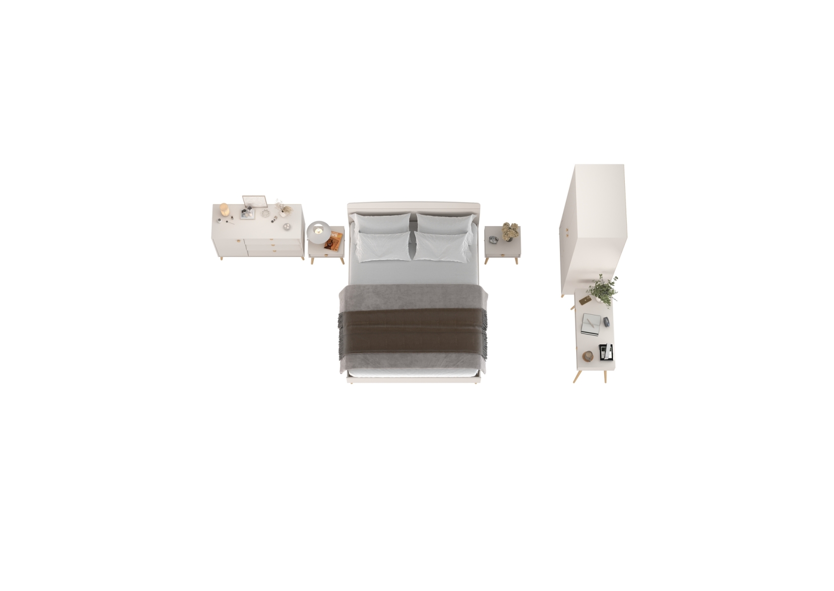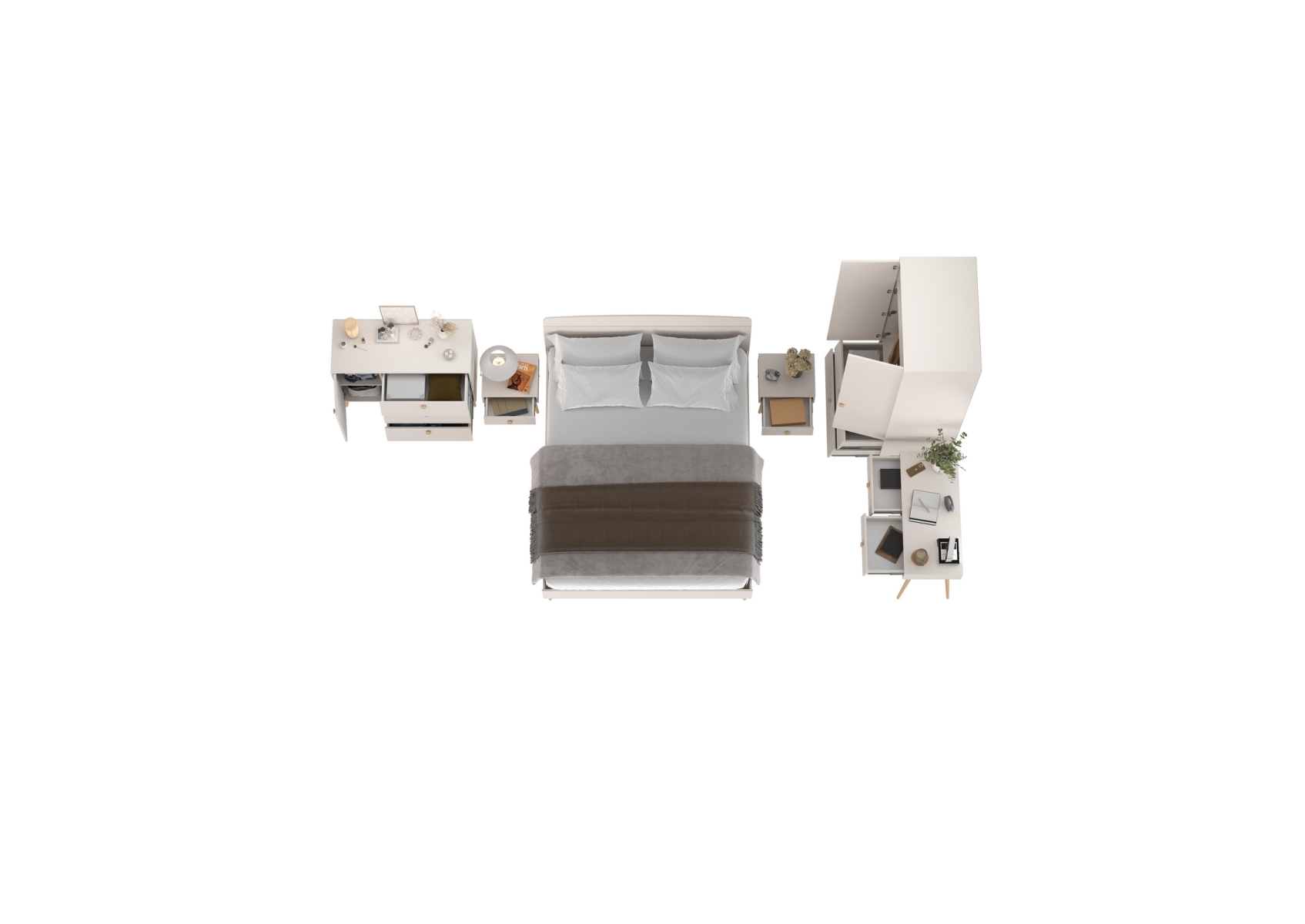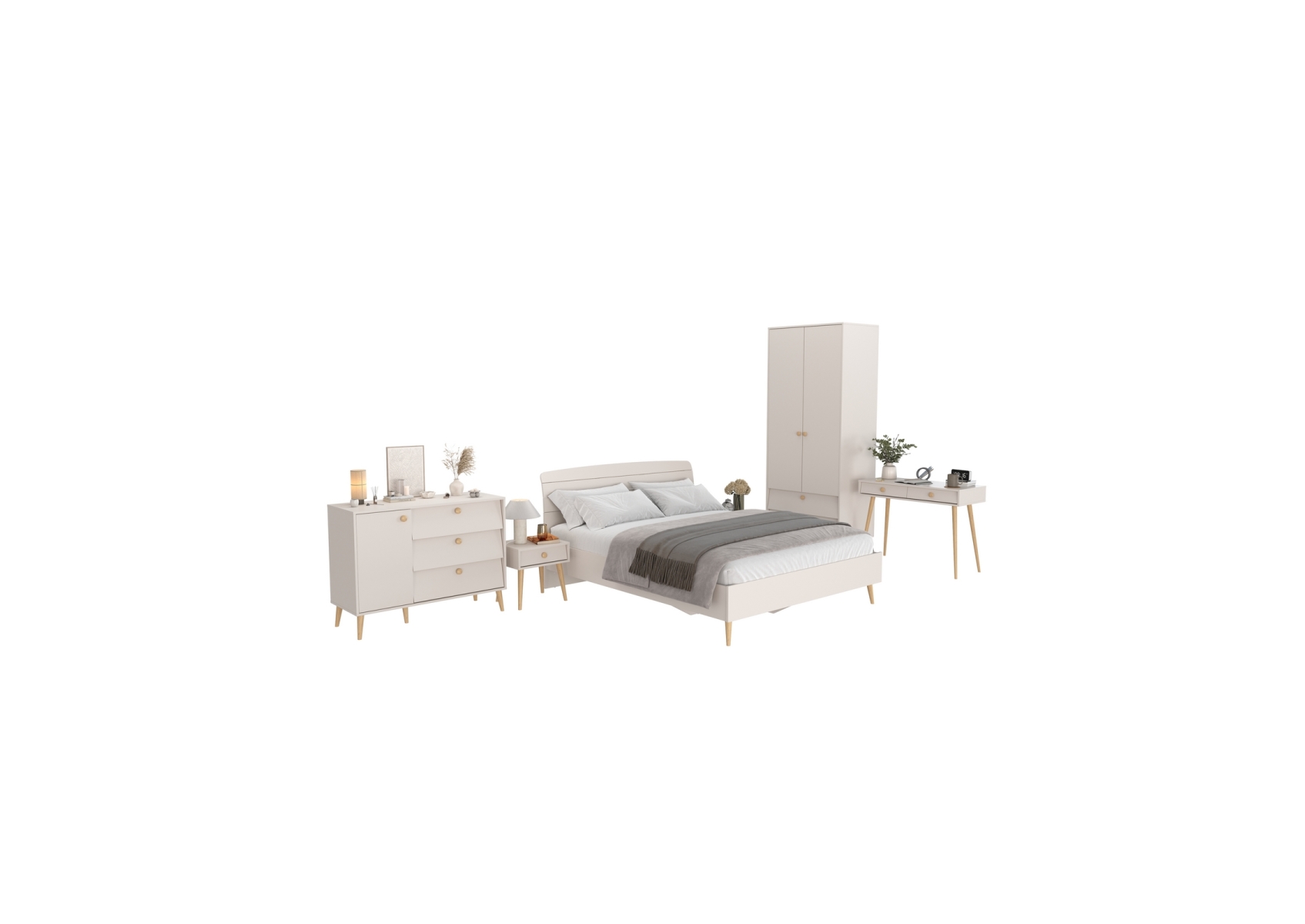 Спальный гарнитур Афина с кроватью 1600. Цвет - кашемир серый. Количество мебели - 6 шт. Комплектация включает кровать 1600 Афина 4-22901, две тумбы прикроватные Афина 4-09901, туалетный столик Афина 4-25904, комод с дверкой и тремя ящиками Афина 4-44901 и шкаф 2-х дверный Афина 4-75901.