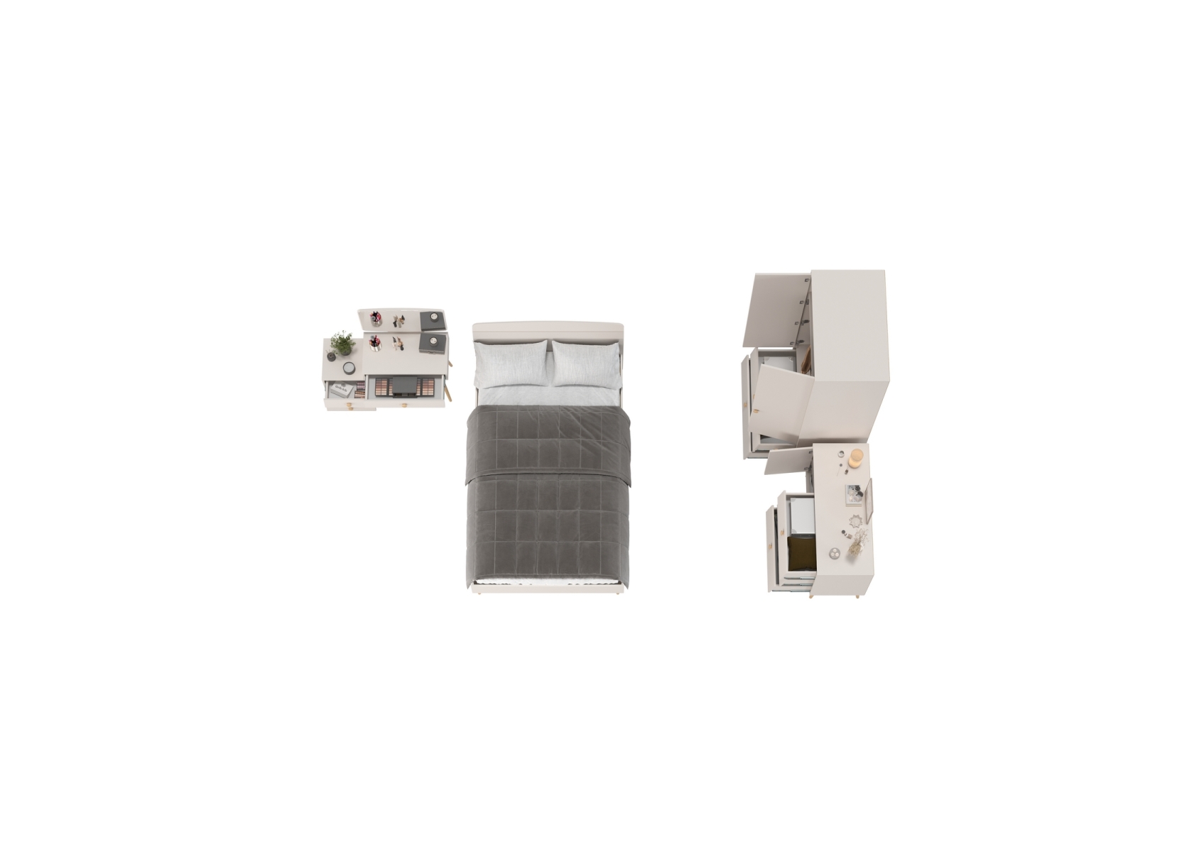 Кровать 1200 Афина с комодом и туалетным столиком и шкафом для одежды. Цвет - кашемир серый. Количество мебели - 4 шт. Комплектация включает кровать 1200 Афина 4-22905, трюмо с зеркалом Афина 4-25901, комод с дверкой и тремя ящиками Афина 4-44901 и шкаф 2-х дверный Афина 4-75901.