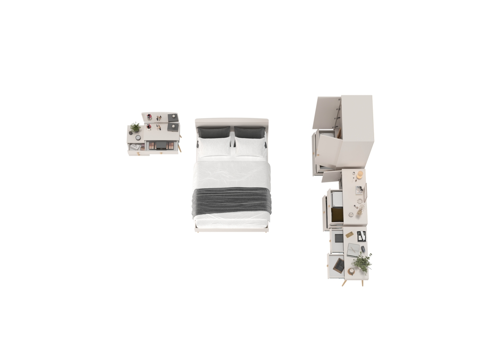 Спальня Афина с кроватью со спальным местом 1400х2000. Цвет - кашемир серый. Количество мебели - 5 шт. Комплектация включает кровать 1400 Афина 4-22911, туалетный столик Афина 4-25904, трюмо с зеркалом Афина 4-25901, комод с дверкой и тремя ящиками Афина 4-44901 и шкаф 2-х дверный Афина 4-75901.