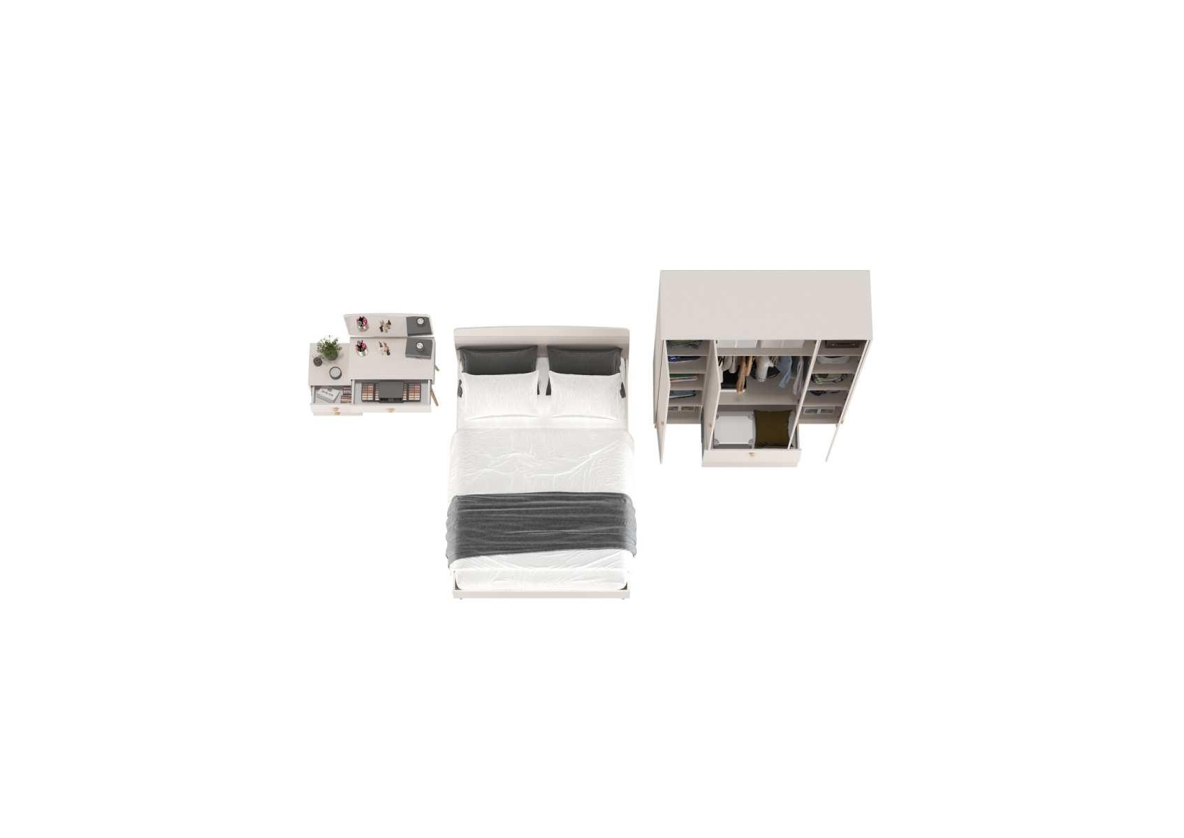 4-х дверный шкаф-комод с кроватью 1400 Афина и трюмо с зеркалом. Цвет - кашемир серый. Количество мебели - 3 шт. Комплектация включает кровать 1400 Афина 4-22911, трюмо с зеркалом Афина 4-25901 и шкаф 4-х дверный Афина 4-75930.