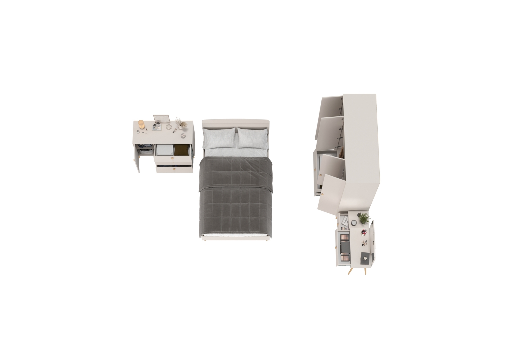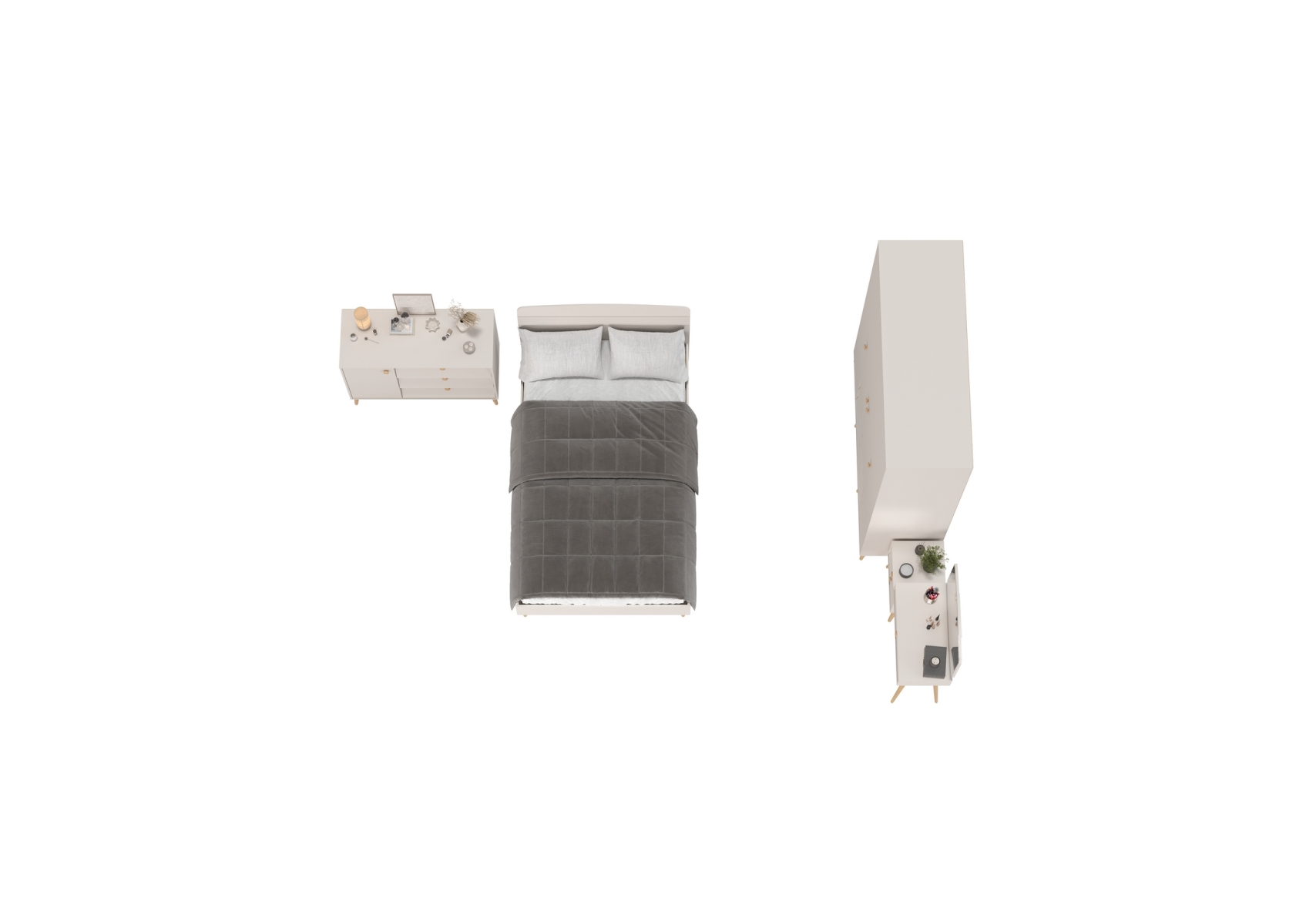 Кровать 1200 с четырёх-дверным шкафом с трюмо и комодом Афина. Цвет - кашемир серый. Количество мебели - 4 шт. Комплектация включает кровать 1200 Афина 4-22905, трюмо с зеркалом Афина 4-25901, комод с дверкой и тремя ящиками Афина 4-44901 и шкаф 4-х дверный Афина 4-75930.