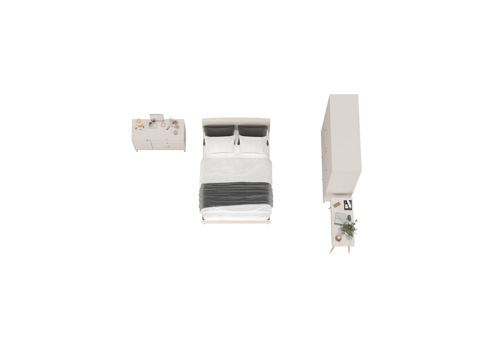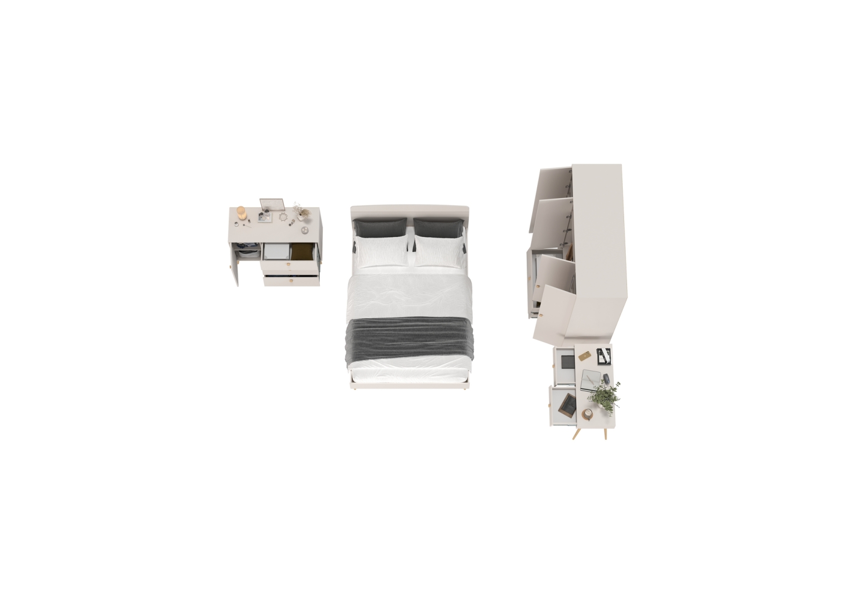 Столик на ножках с кроватью Афина 1400 со шкафом 4-ре двери и комодом с ящиками. Цвет - кашемир серый. Количество мебели - 4 шт. Комплектация включает кровать 1400 Афина 4-22911, туалетный столик Афина 4-25904, комод с дверкой и тремя ящиками Афина 4-44901 и шкаф 4-х дверный Афина 4-75930.