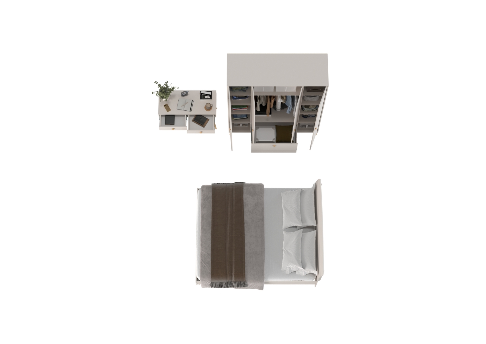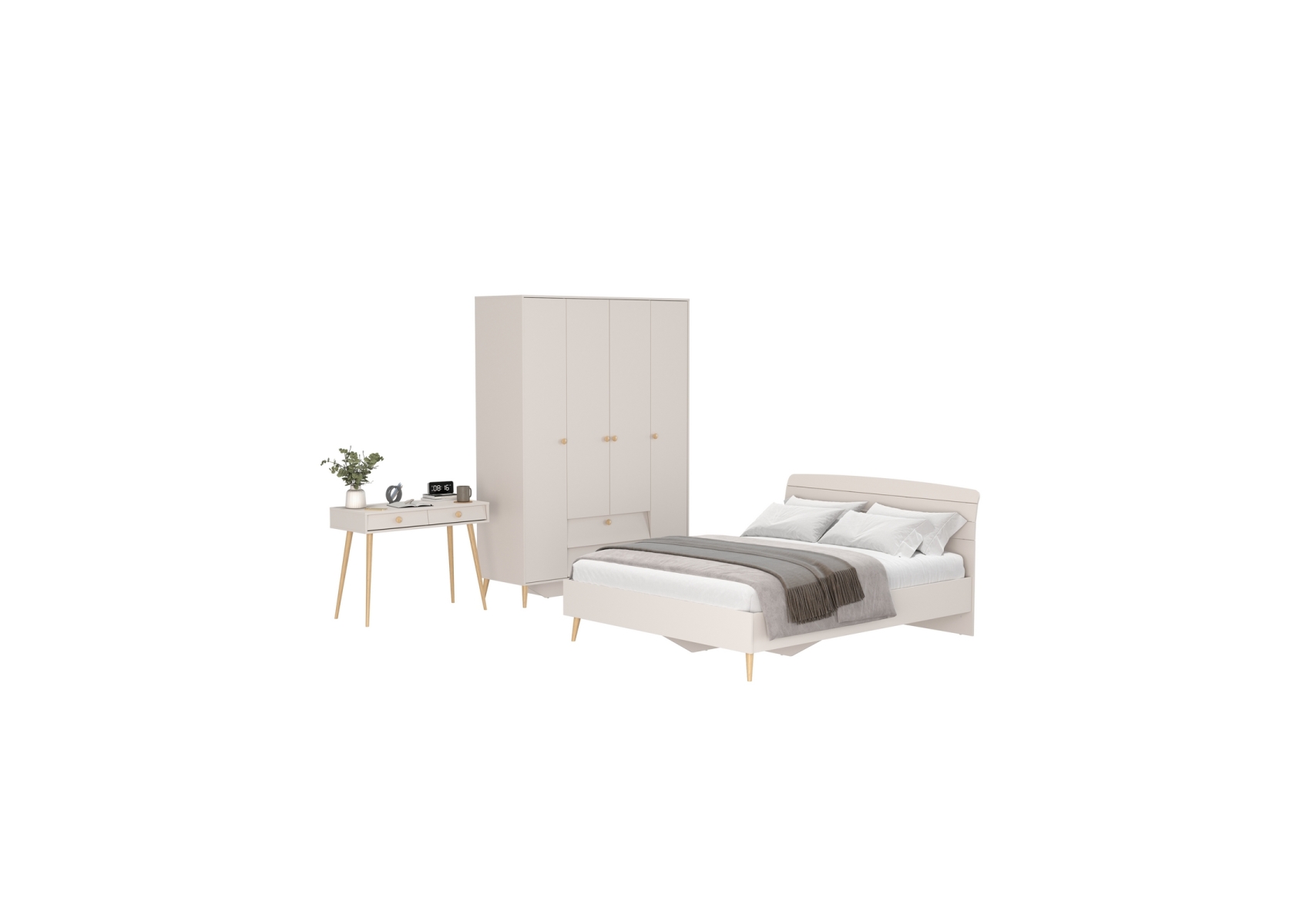 Столик прикроватный с кроватью 1600 Афина со шкаф-комодом 4-ре двери два ящика. Цвет - кашемир серый. Количество мебели - 3 шт. Комплектация включает кровать 1600 Афина 4-22901, туалетный столик Афина 4-25904 и шкаф 4-х дверный Афина 4-75930.