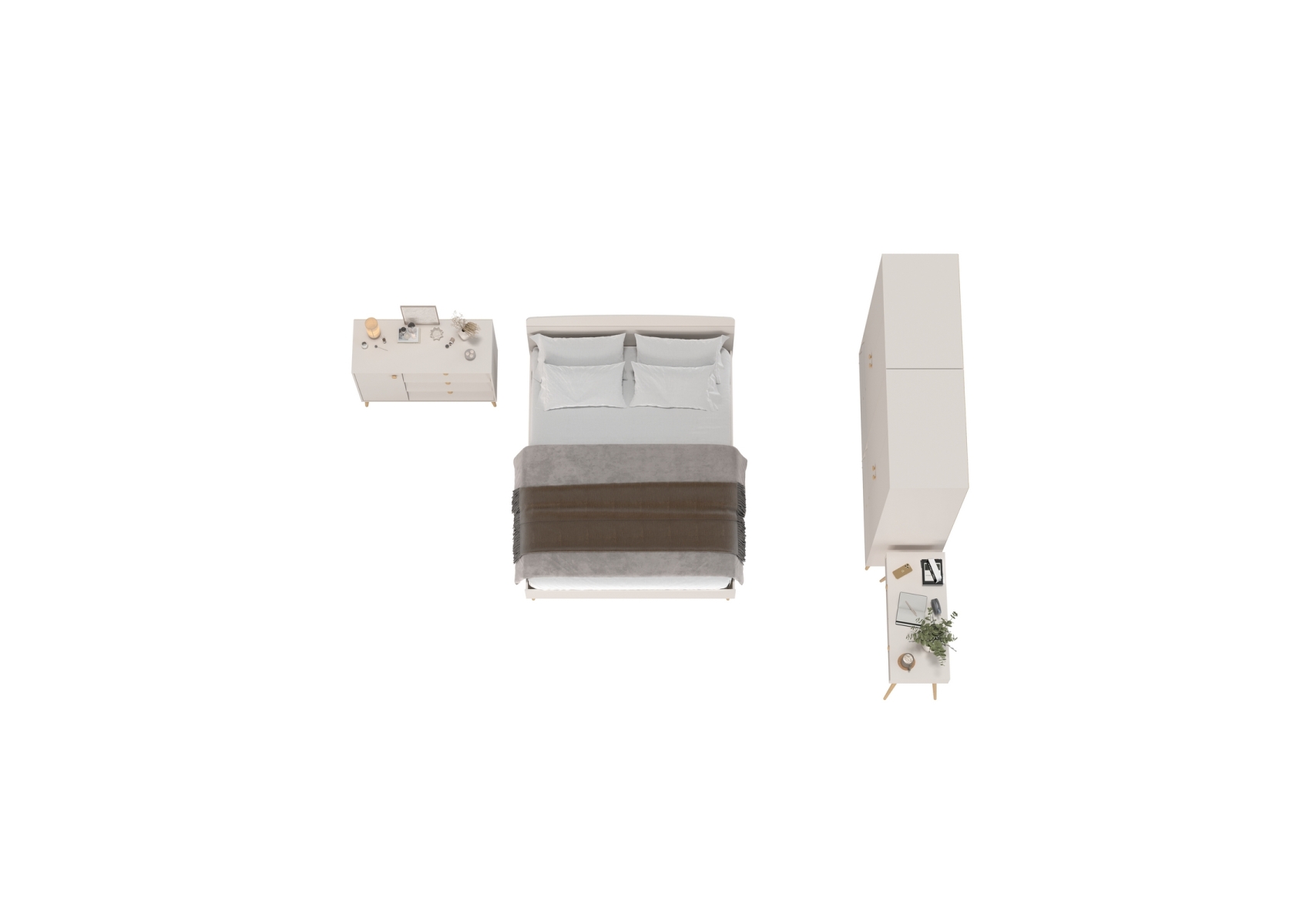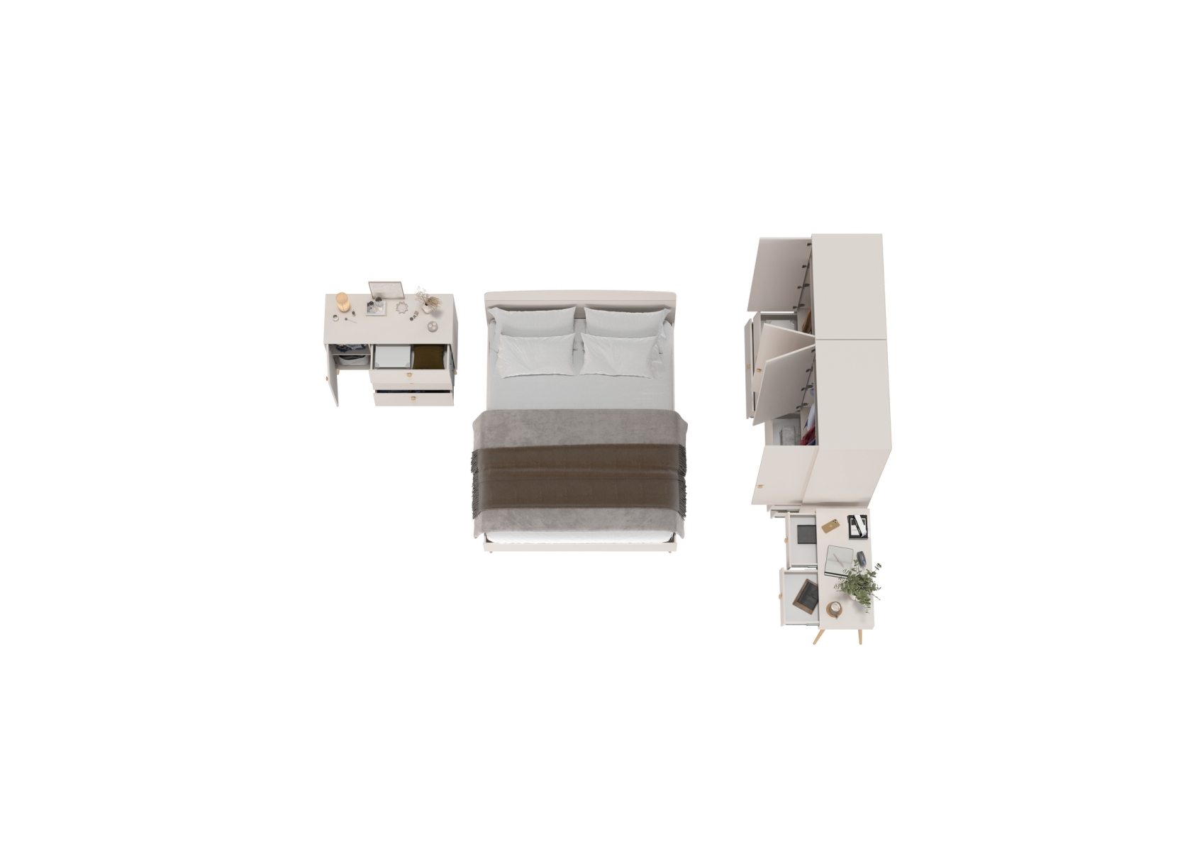 Афина Спальня со спальным местом 1600. Цвет - кашемир серый. Количество мебели - 5 шт. Комплектация включает кровать 1600 Афина 4-22901, туалетный столик Афина 4-25904, комод с дверкой и тремя ящиками Афина 4-44901 и два шкафа 2-х дверных Афина 4-75901.