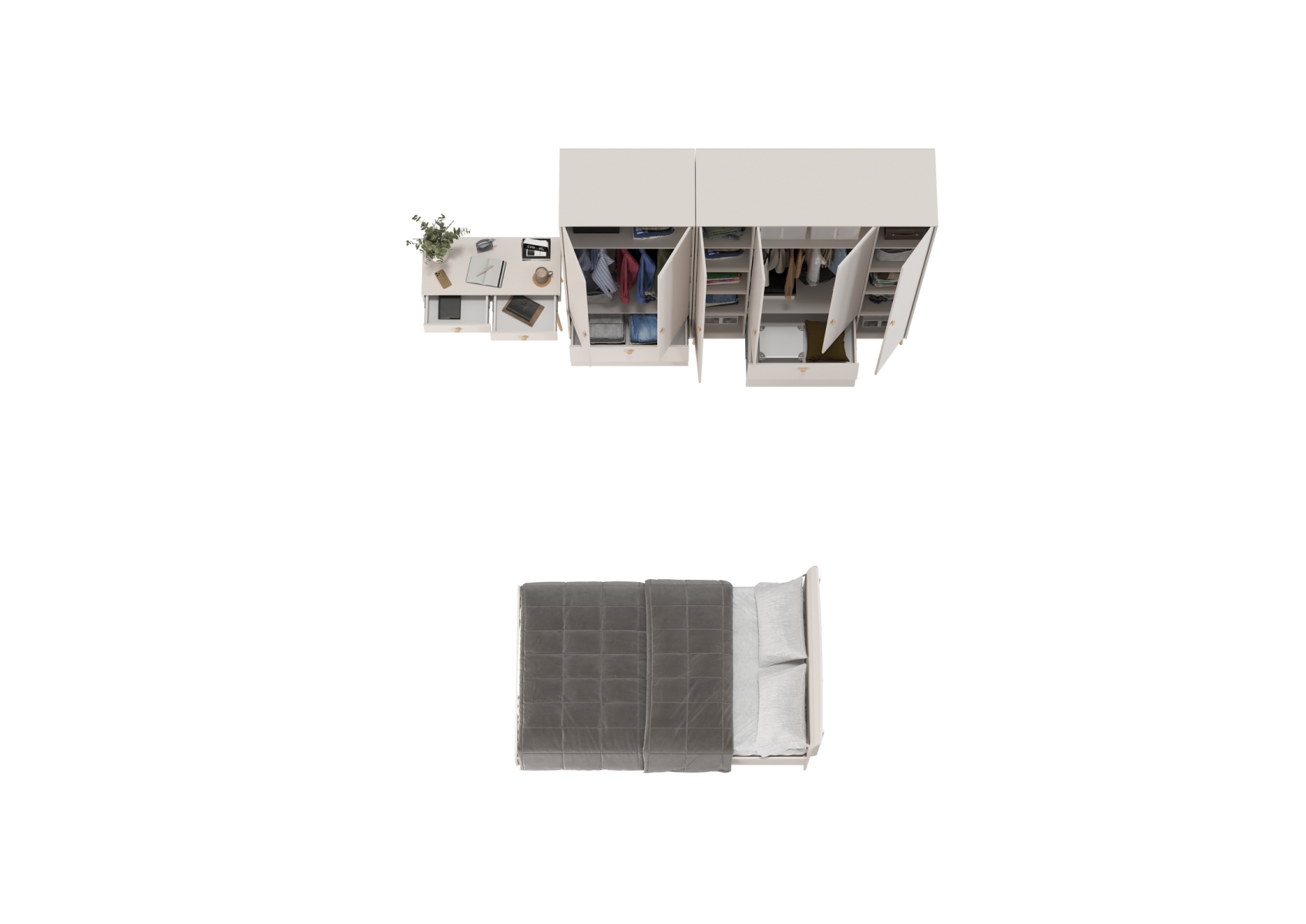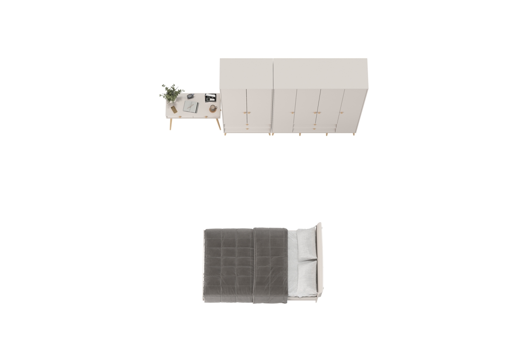 Два платяных шкафа для одежды со столиком и кроватью Афина 1200. Цвет - кашемир серый. Количество мебели - 4 шт. Комплектация включает кровать 1200 Афина 4-22905, туалетный столик Афина 4-25904, шкаф 2-х дверный Афина 4-75901 и шкаф 4-х дверный Афина 4-75930.