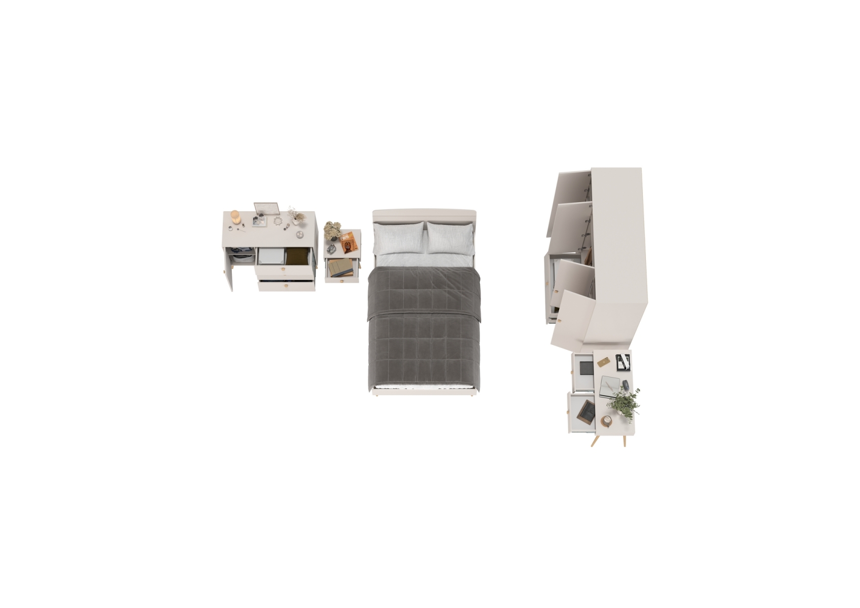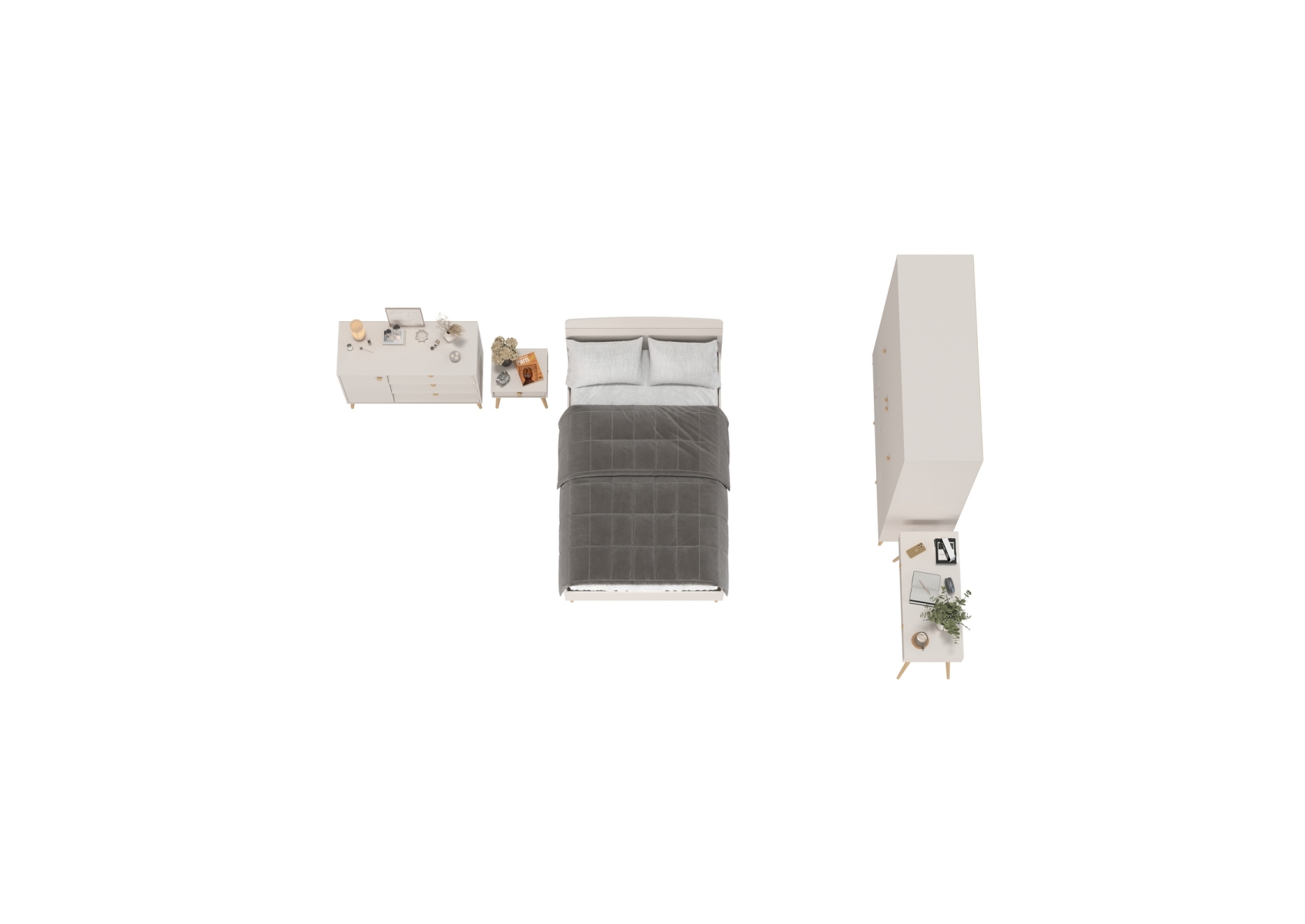 Набор мебели из пяти предметов в спальню Афина с кроватью на 1200. Цвет - кашемир серый. Количество мебели - 5 шт. Комплектация включает кровать 1200 Афина 4-22905, тумбу прикроватную Афина 4-09901, туалетный столик Афина 4-25904, комод с дверкой и тремя ящиками Афина 4-44901 и шкаф 4-х дверный Афина 4-75930.