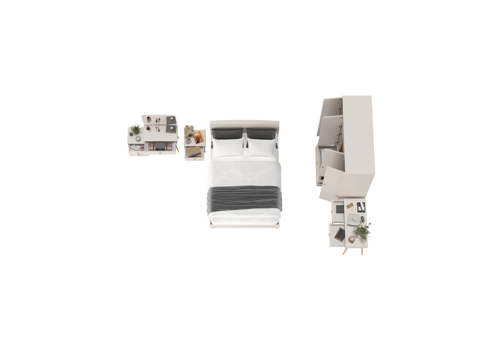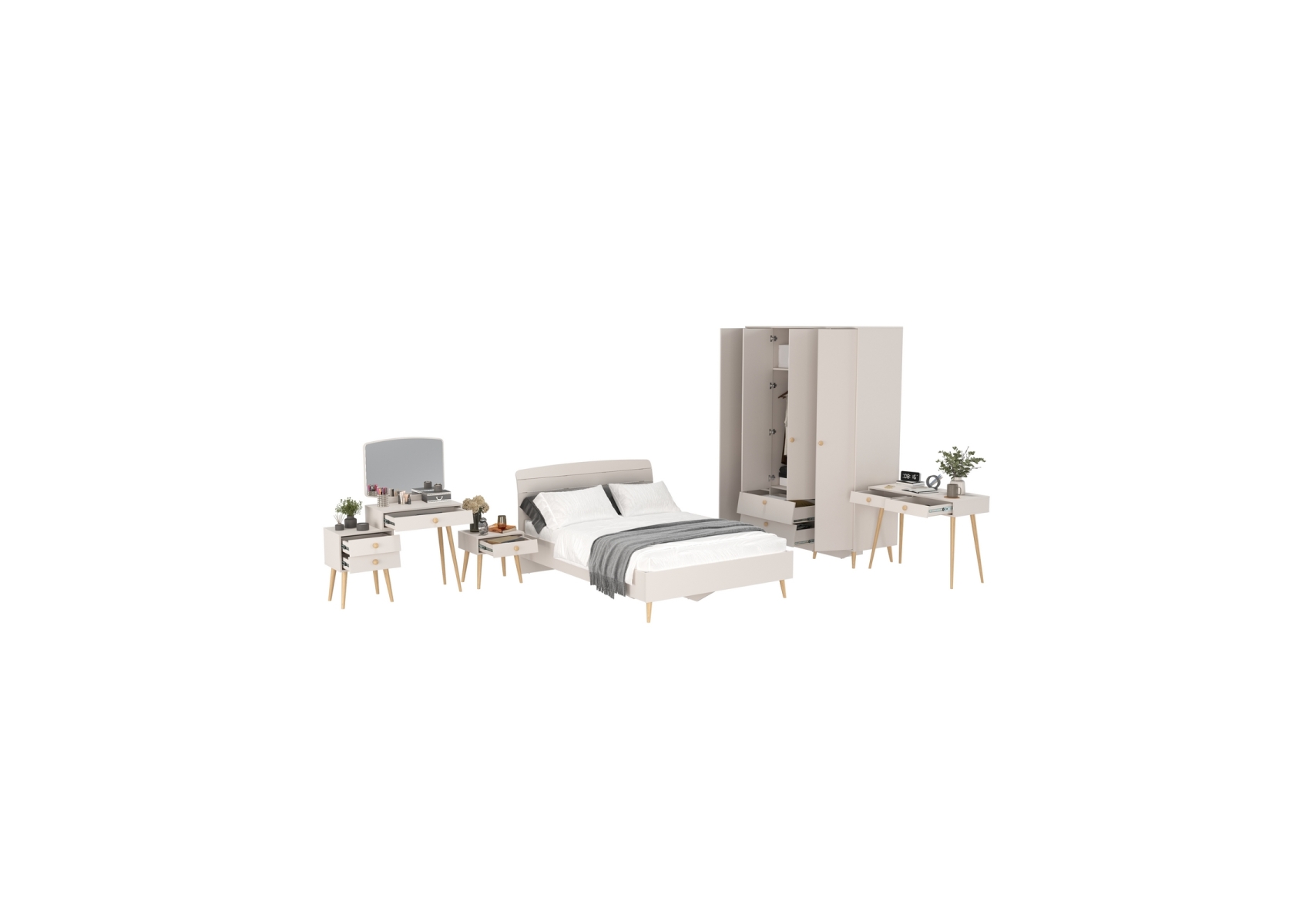 Спальня Афина в цвете кашемир серый спальное место 1400х2000 мм. Цвет - кашемир серый. Количество мебели - 5 шт. Комплектация включает кровать 1400 Афина 4-22911, тумбу прикроватную Афина 4-09901, туалетный столик Афина 4-25904, трюмо с зеркалом Афина 4-25901 и шкаф 4-х дверный Афина 4-75930.