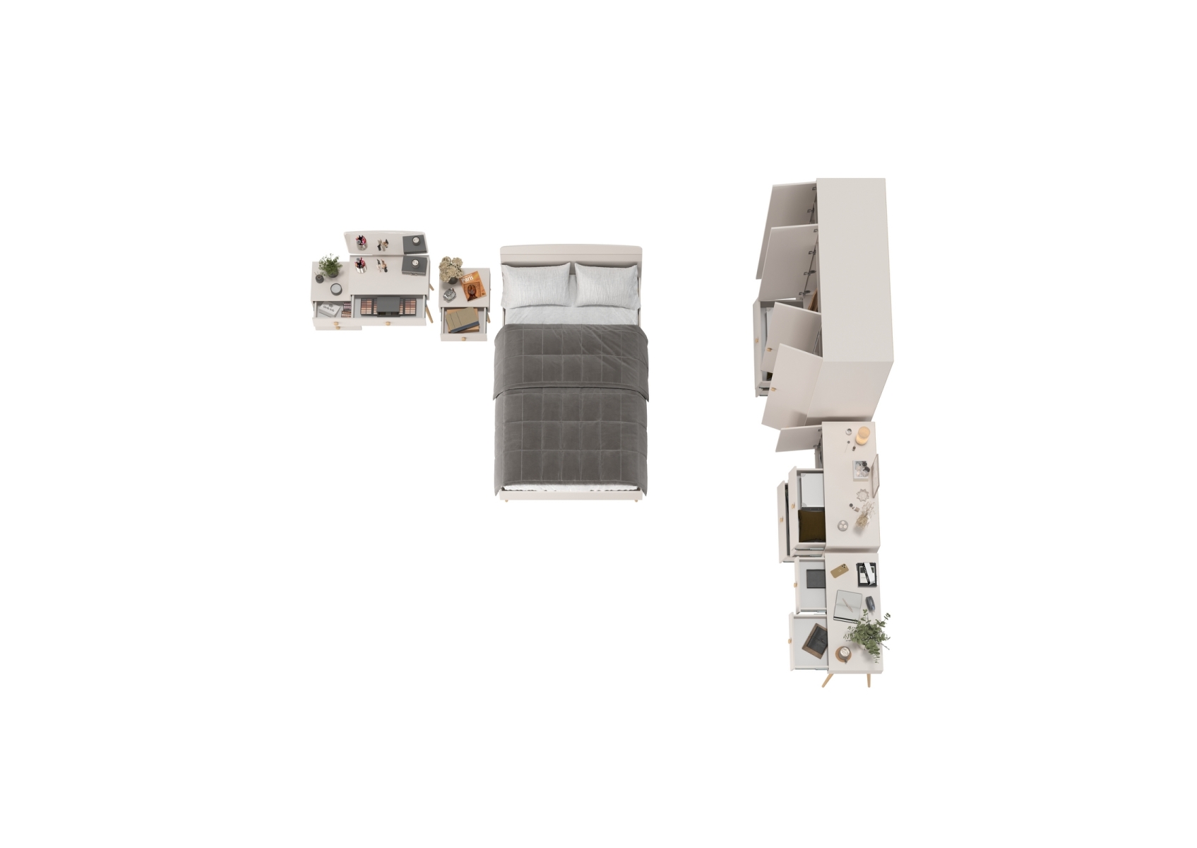 Спальный гарнитур из ДСП Афина кровать 1200. Цвет - кашемир серый. Количество мебели - 6 шт. Комплектация включает кровать 1200 Афина 4-22905, тумбу прикроватную Афина 4-09901, туалетный столик Афина 4-25904, трюмо с зеркалом Афина 4-25901, комод с дверкой и тремя ящиками Афина 4-44901 и шкаф 4-х дверный Афина 4-75930.