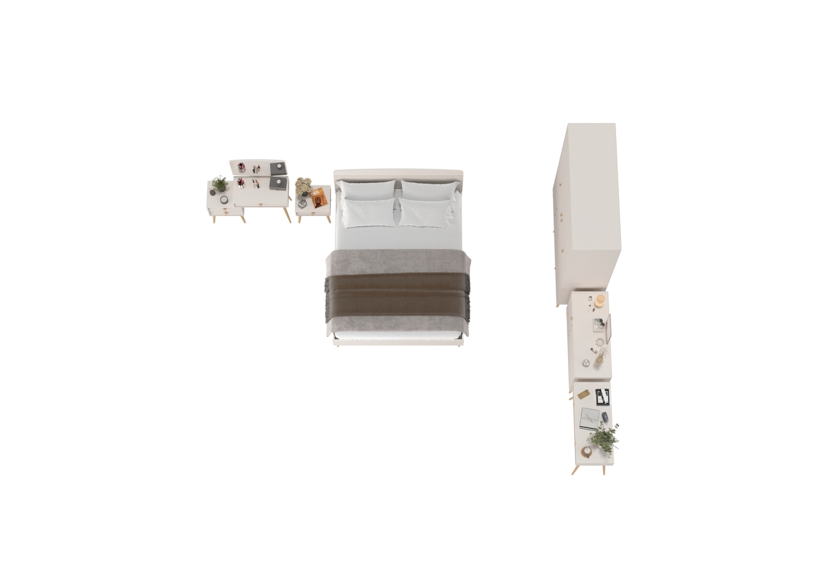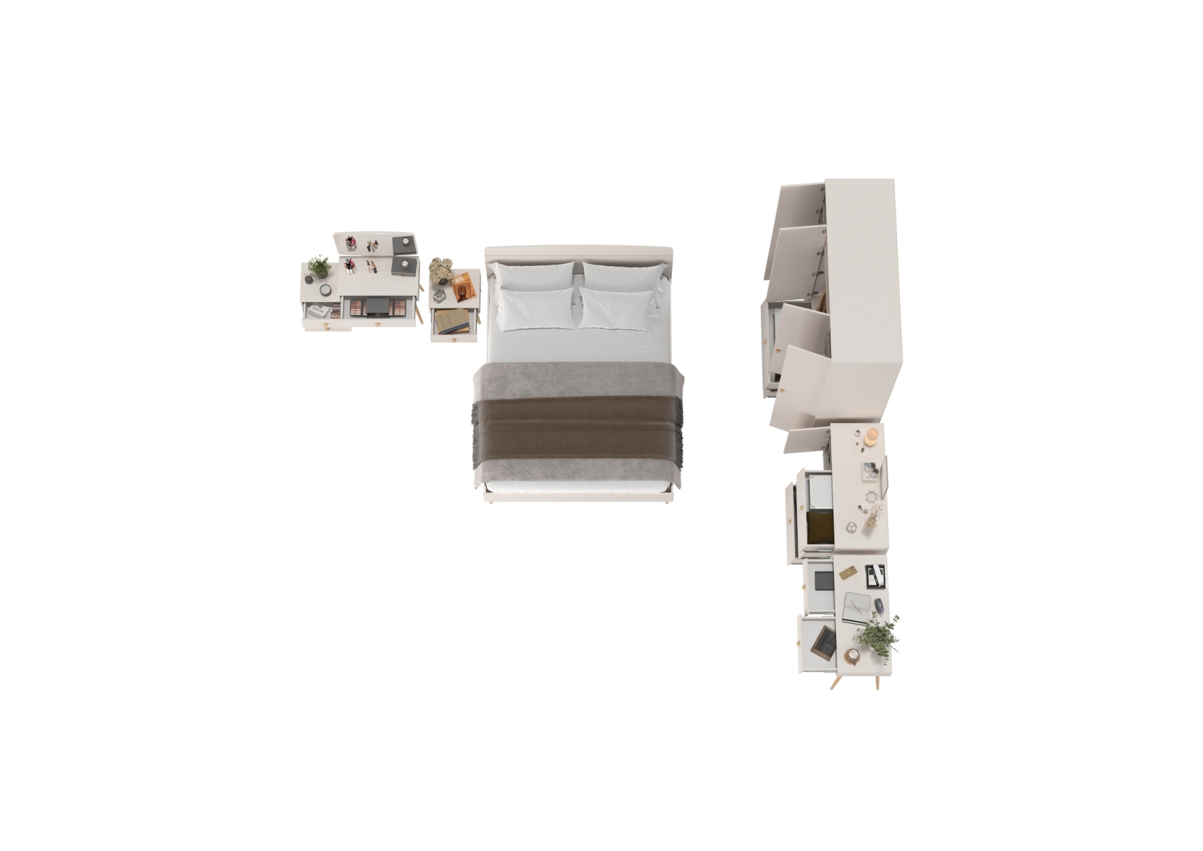Спальный гарнитур из ДСП Афина кровать 1600. Цвет - кашемир серый. Количество мебели - 6 шт.Комплектация включает кровать 1600 Афина 4-22901, тумбу прикроватную Афина 4-09901, туалетный столик Афина 4-25904, трюмо с зеркалом Афина 4-25901, комод с дверкой и тремя ящиками Афина 4-44901 и шкаф 4-х дверный Афина 4-75930.