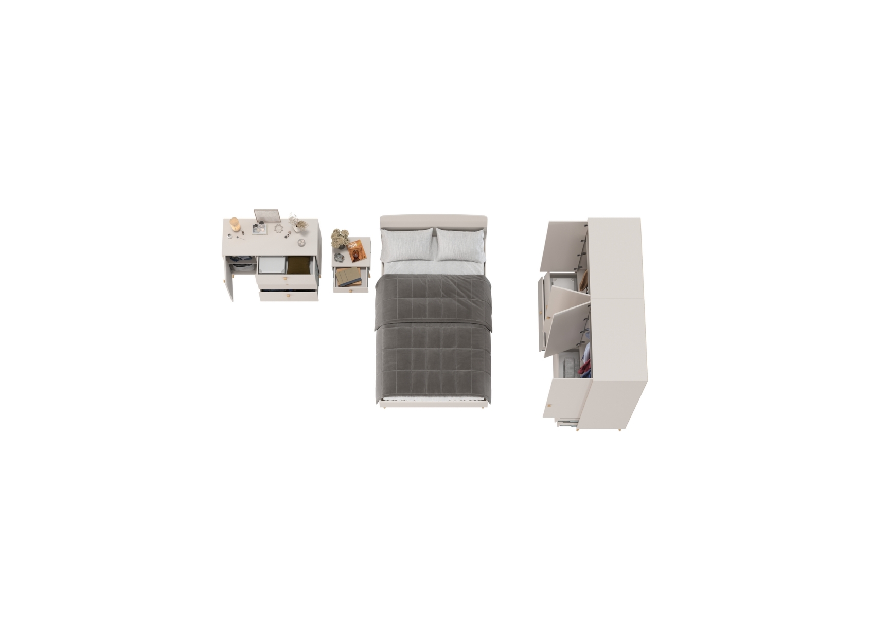 Шкафы двухдверные с кроватью 1200 Афина с тумбочкой на ножках и комодом. Цвет - кашемир серый. Количество мебели - 5 шт. Комплектация включает кровать 1200 Афина 4-22905, тумбу прикроватную Афина 4-09901, комод с дверкой и тремя ящиками Афина 4-44901 и два шкафа 2-х дверных Афина 4-75901.