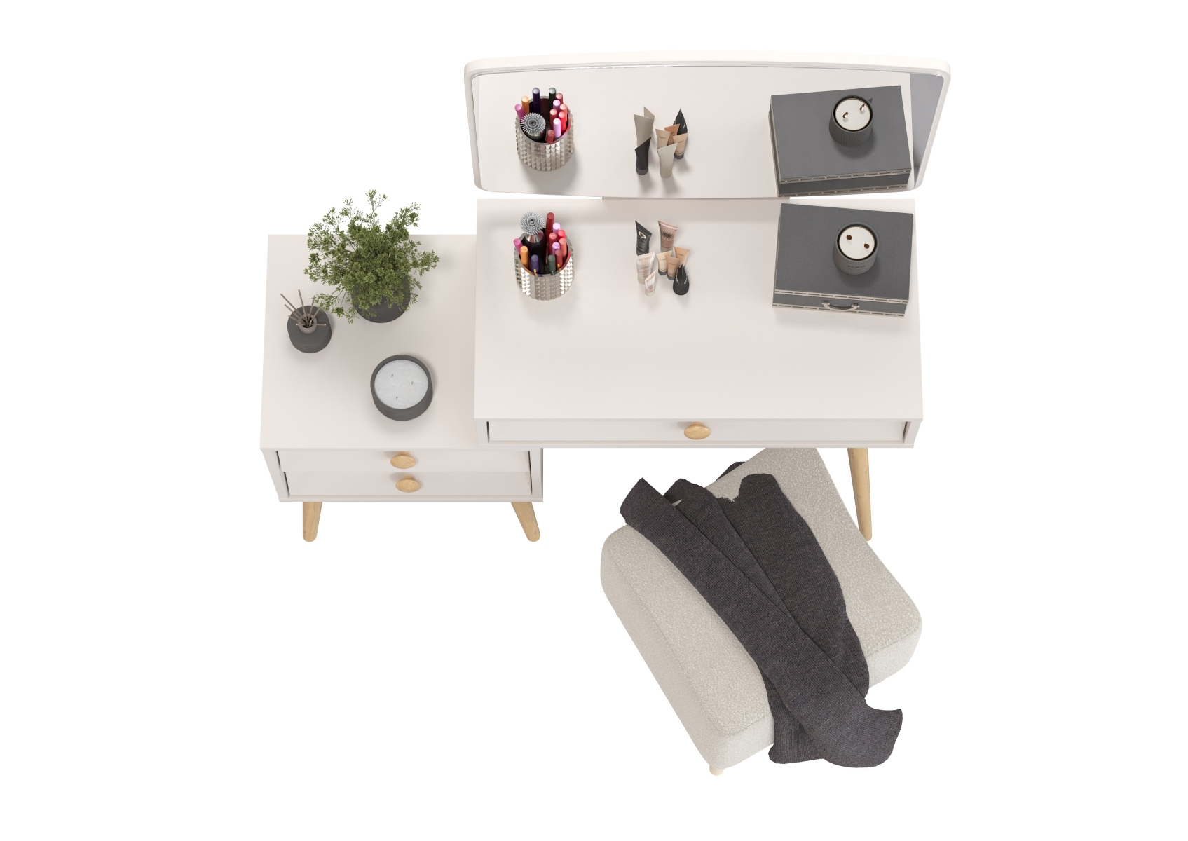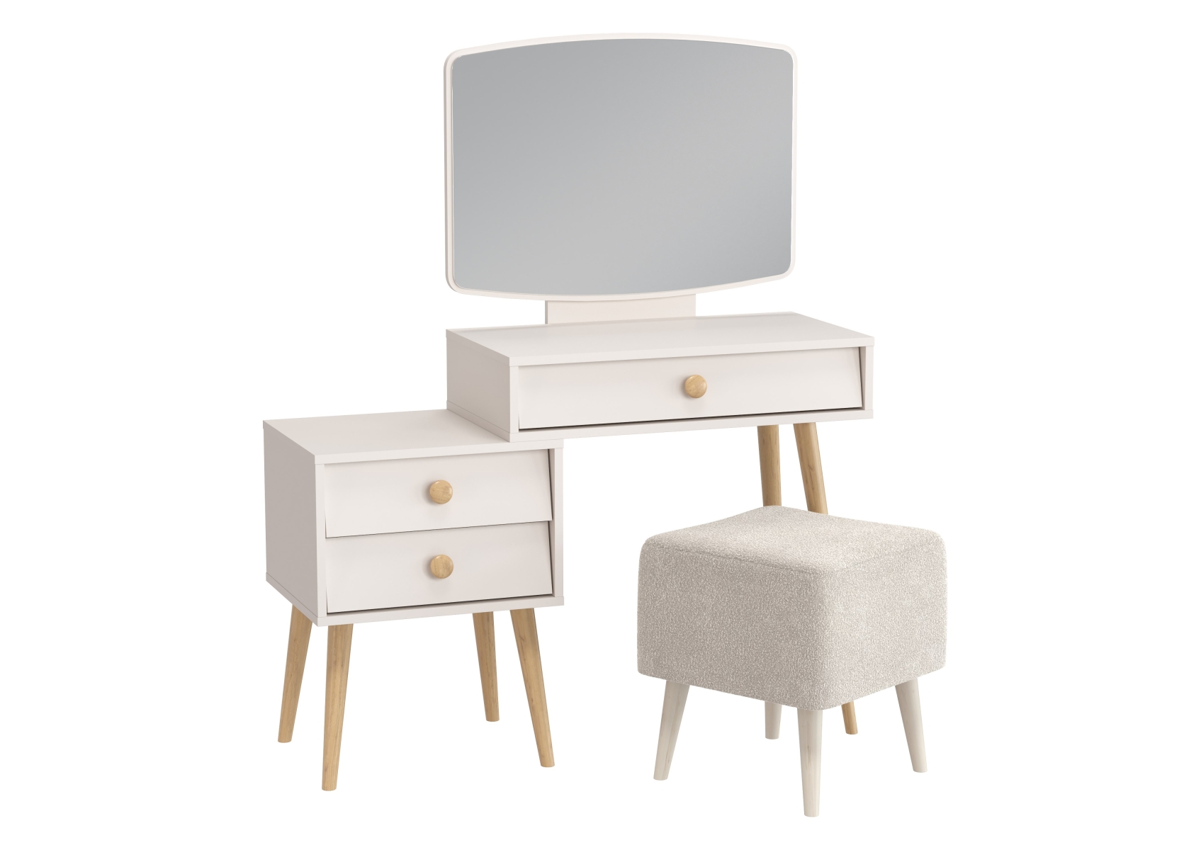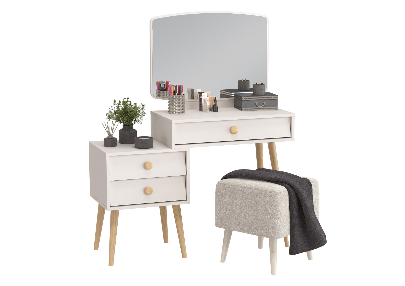 Пуфик на ножках Куби и трюмо для спальни Афина. Цвет - кашемир серый/ткань молоко. Габариты (ШхГхВ) столика - 105х38,6х129 см, банкетки - 41х41х45 см. Трюмо оснащено тремя просторными выдвижными ящиками на шариковых направляющих полного выдвижения - один под столешницей столика и два в секции тумбы. Банкетка тканевая на четырёх ножках квадратная Куби 6-5133 — элегантная и универсальная.