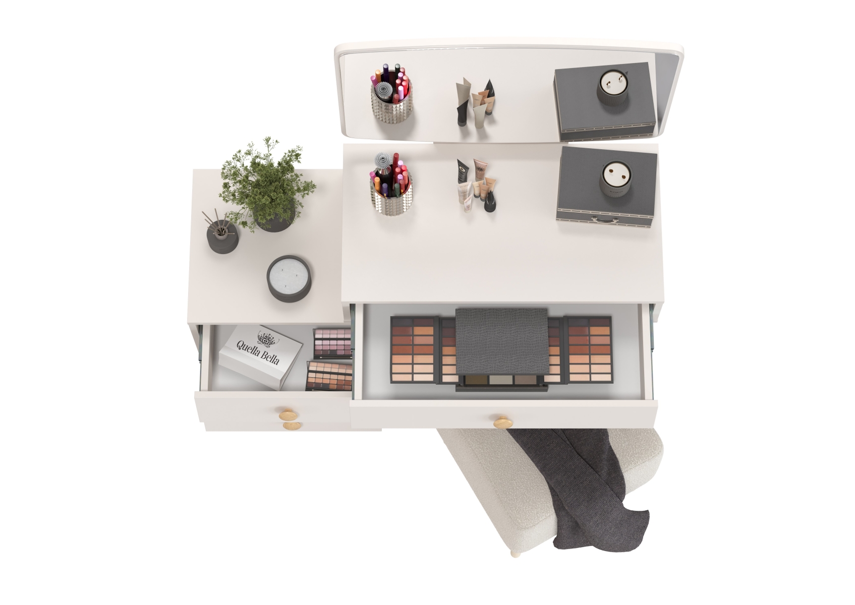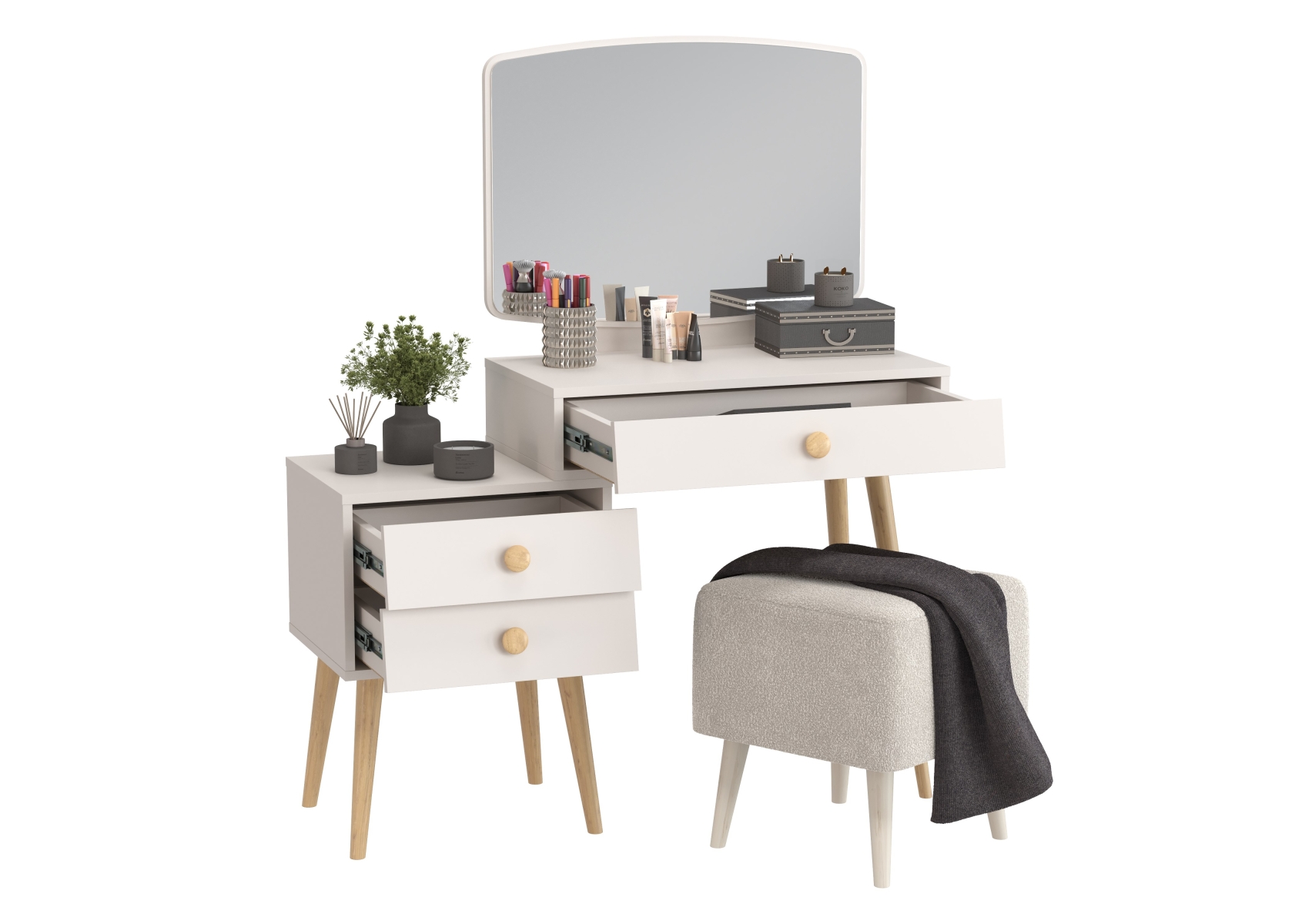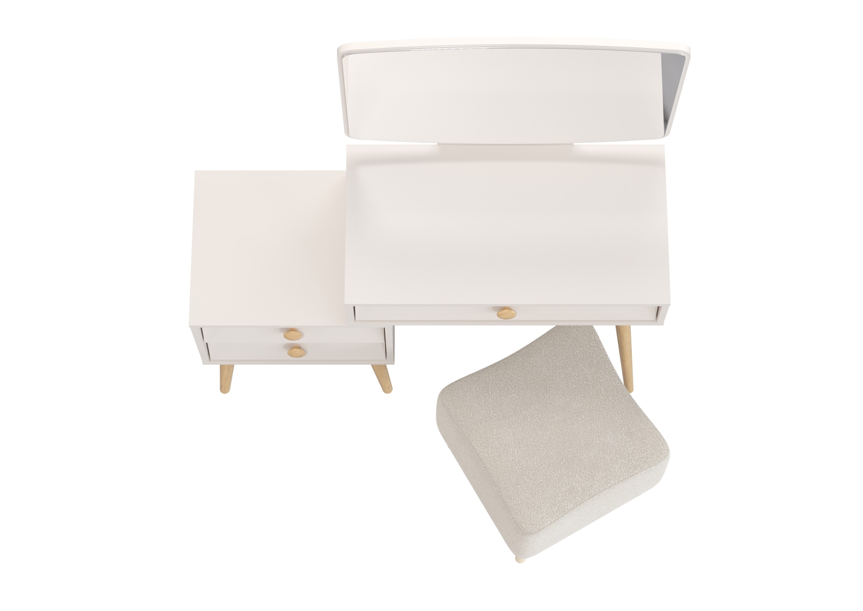 Пуфик на ножках Куби и трюмо для спальни Афина. Цвет - кашемир серый/ткань молоко. Габариты (ШхГхВ) столика - 105х38,6х129 см, банкетки - 41х41х45 см. Трюмо оснащено тремя просторными выдвижными ящиками на шариковых направляющих полного выдвижения - один под столешницей столика и два в секции тумбы. Банкетка тканевая на четырёх ножках квадратная Куби 6-5133 — элегантная и универсальная.