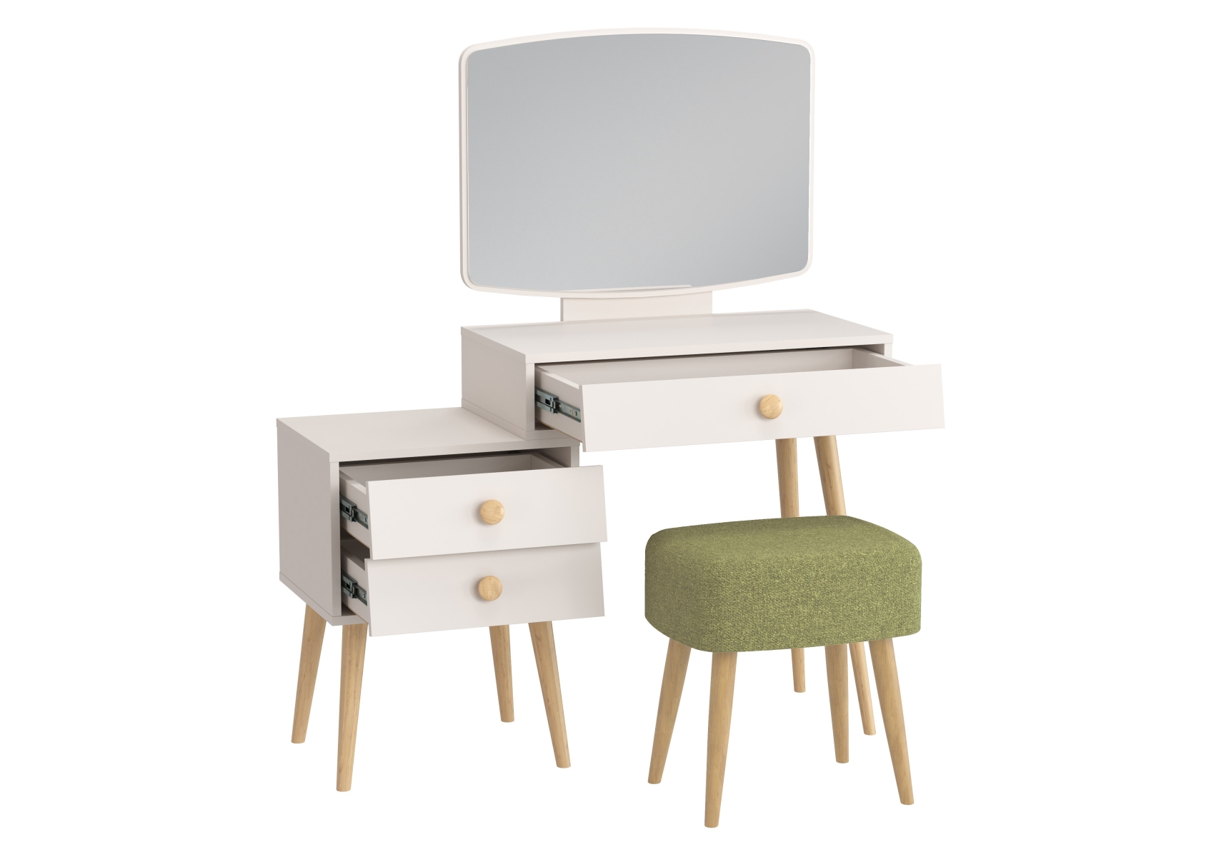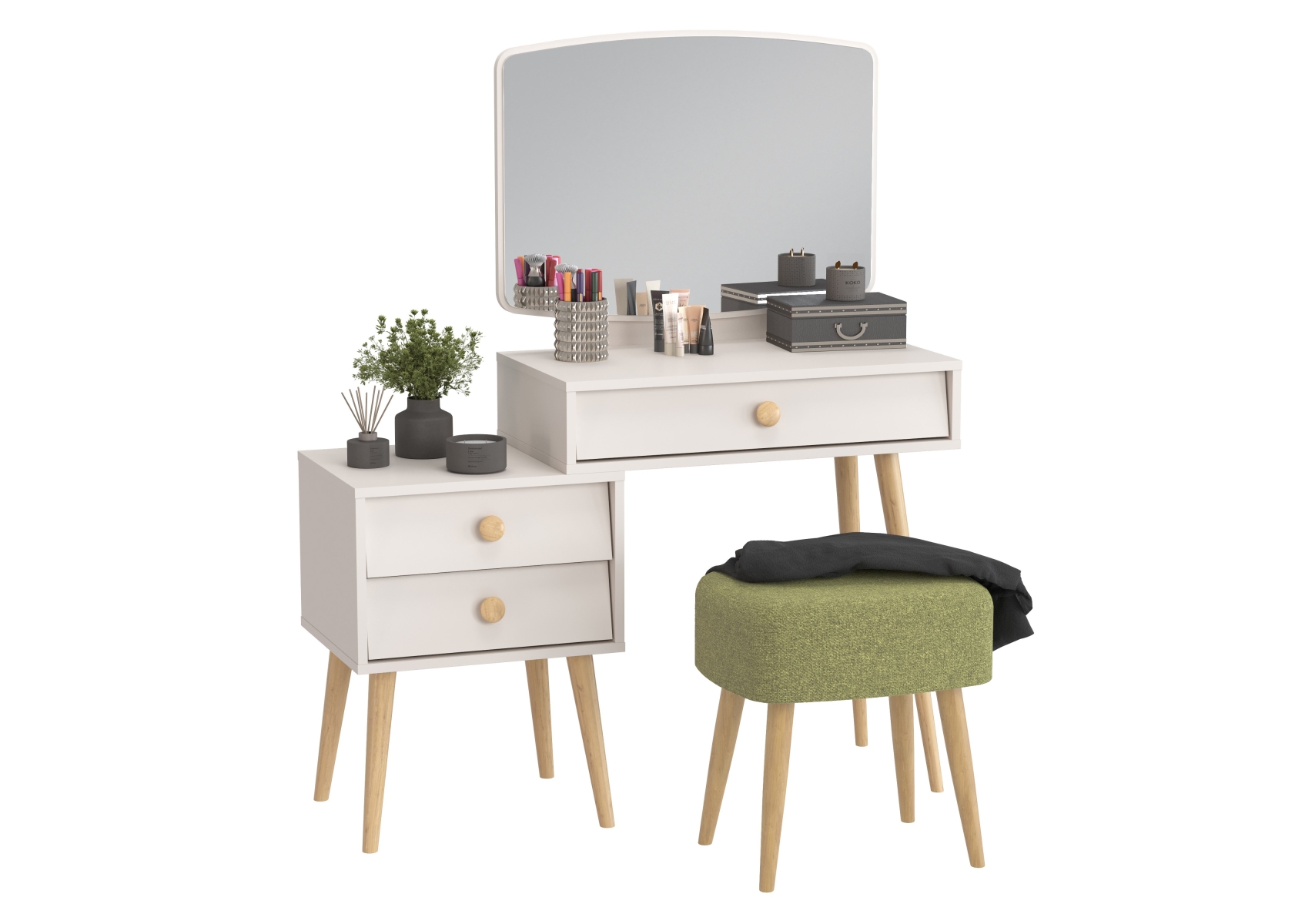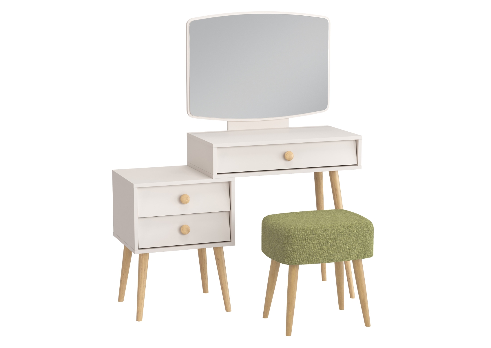 Косметический стол с зеркалом Афина с тканевой банкеткой Полли. Цвет - кашемир серый/ткань зелёная. Габариты (ШхГхВ) столика - 105х38,6х129 см, банкетки - 44х34х45 см. Трюмо оснащено тремя просторными выдвижными ящиками на шариковых направляющих полного выдвижения - один под столешницей столика и два в секции тумбы. Прямоугольная банкетка Полли на четырёх ножках - стильная и удобная.