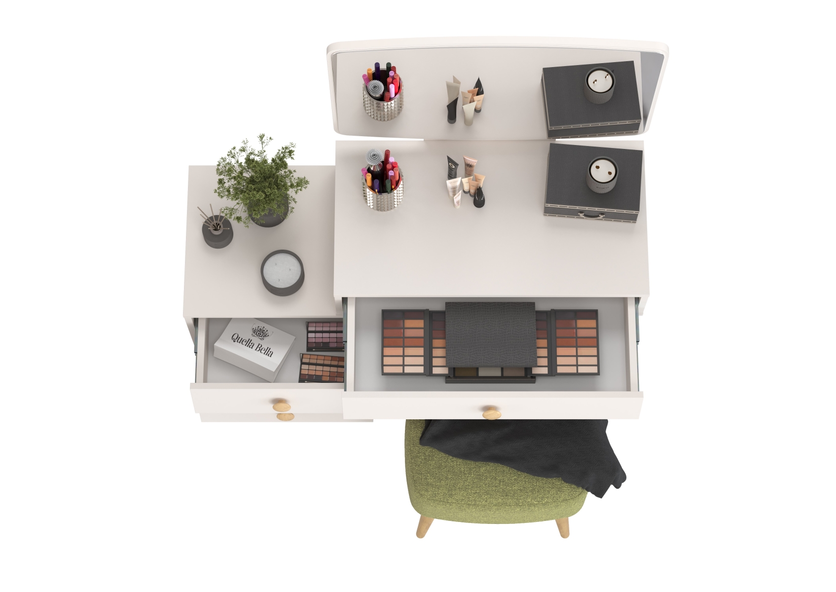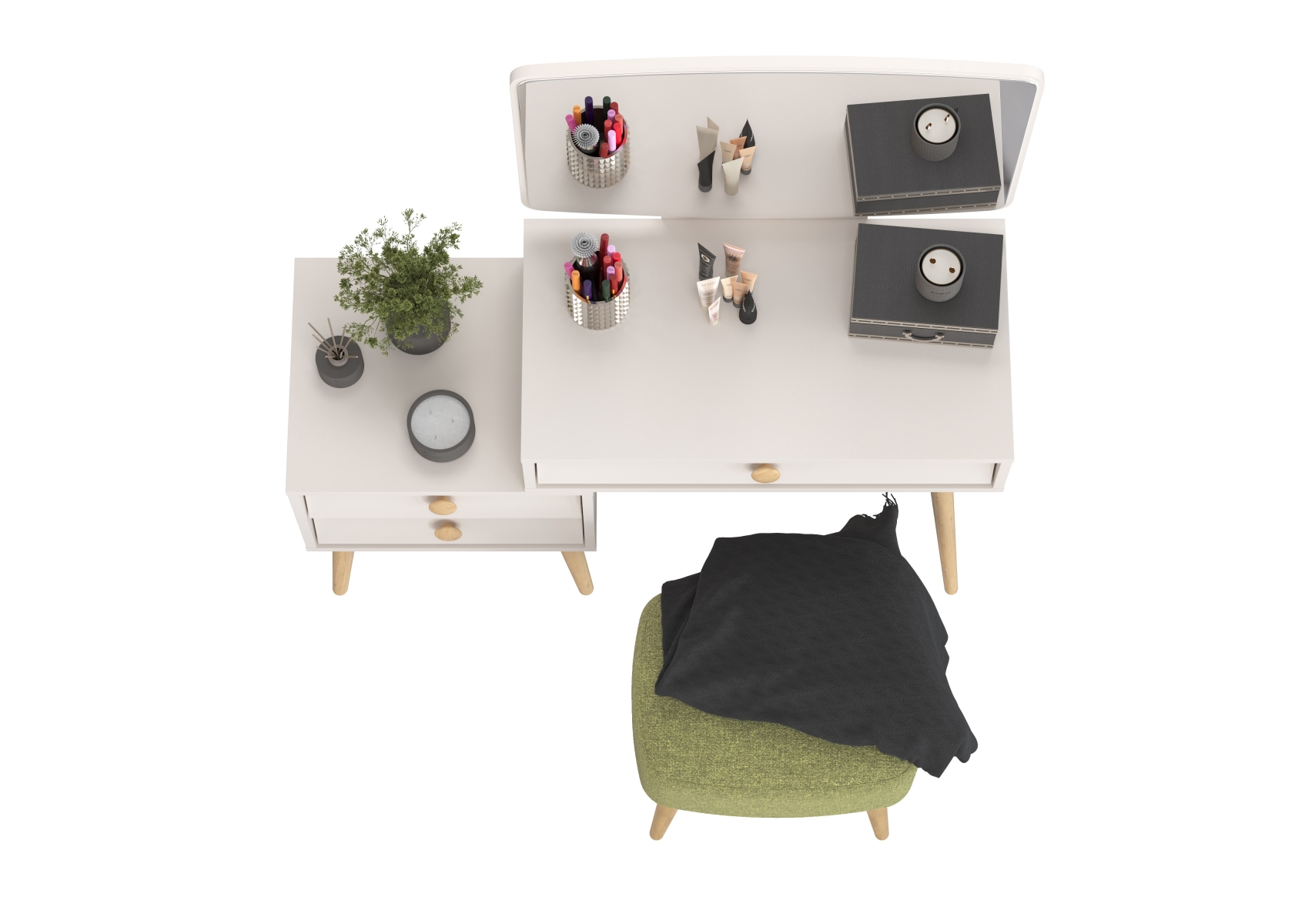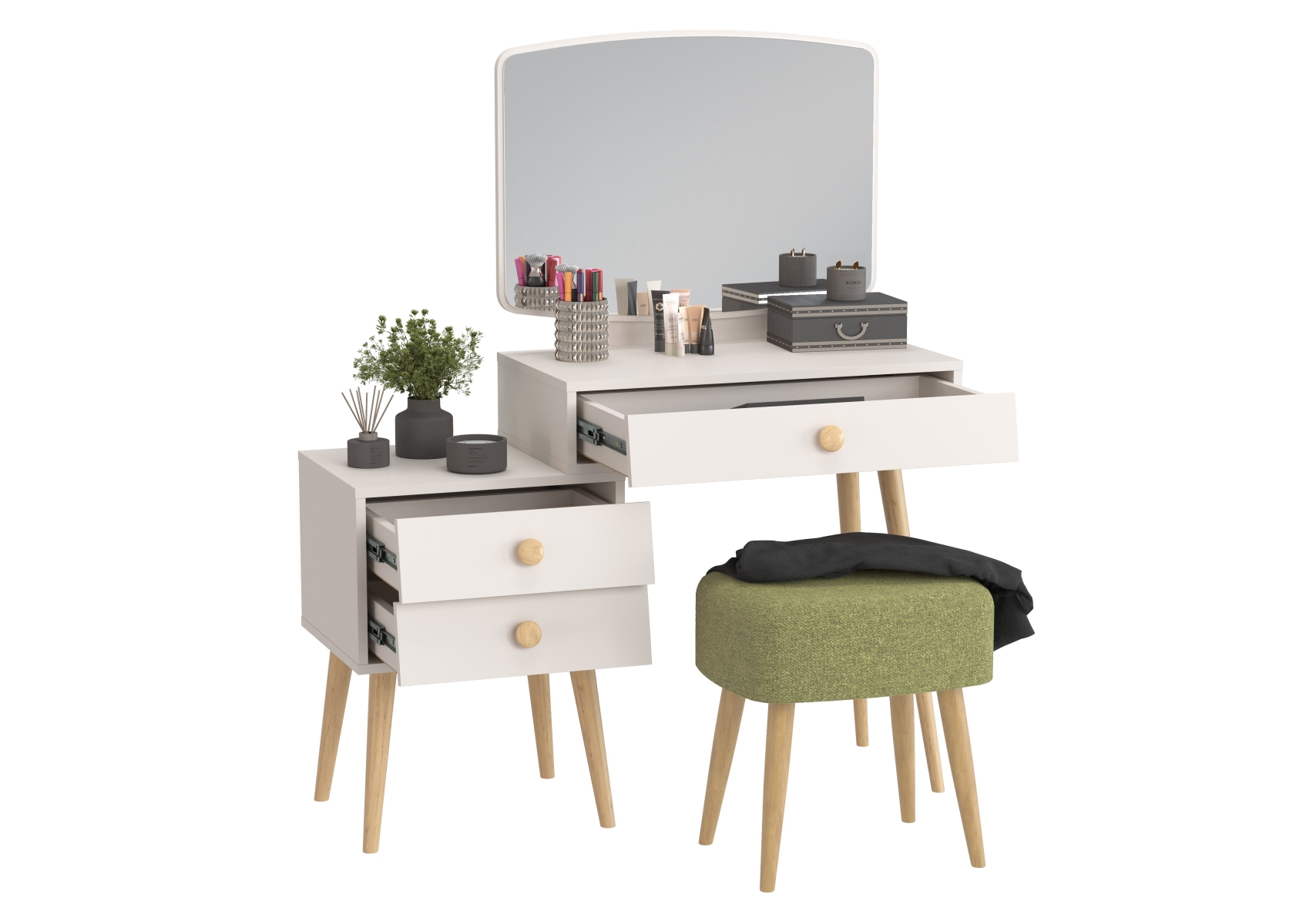Косметический стол с зеркалом Афина с тканевой банкеткой Полли. Цвет - кашемир серый/ткань зелёная. Габариты (ШхГхВ) столика - 105х38,6х129 см, банкетки - 44х34х45 см. Трюмо оснащено тремя просторными выдвижными ящиками на шариковых направляющих полного выдвижения - один под столешницей столика и два в секции тумбы. Прямоугольная банкетка Полли на четырёх ножках - стильная и удобная.