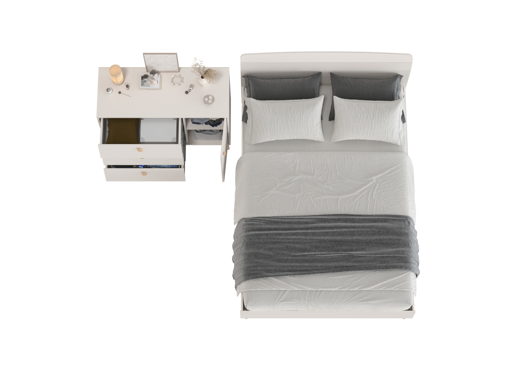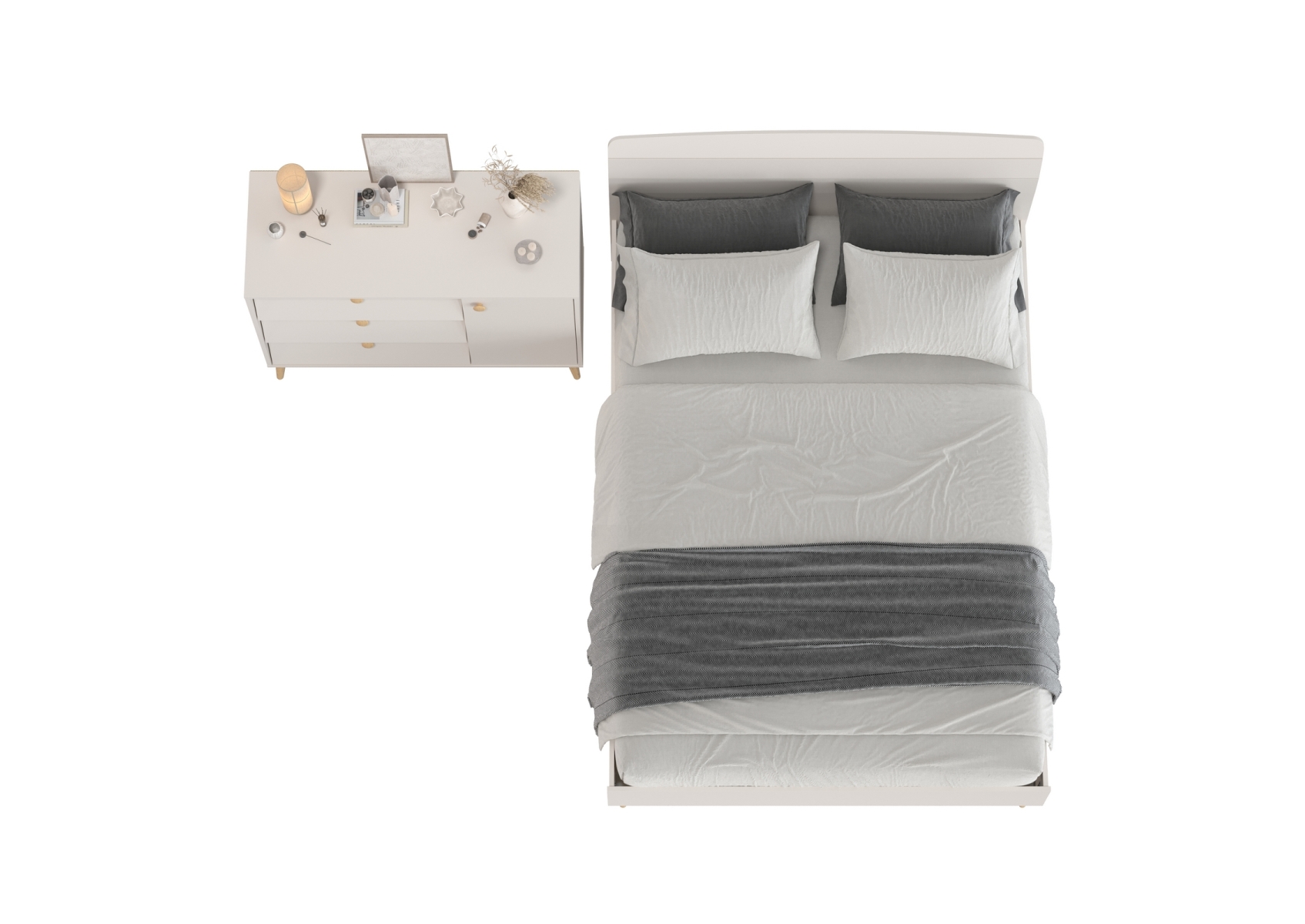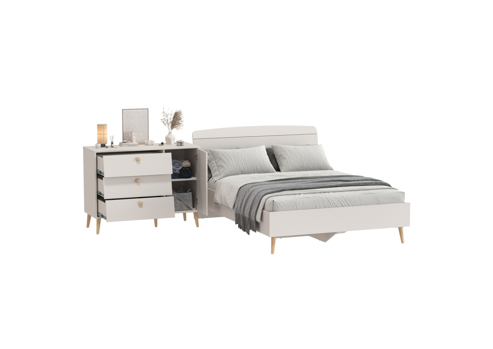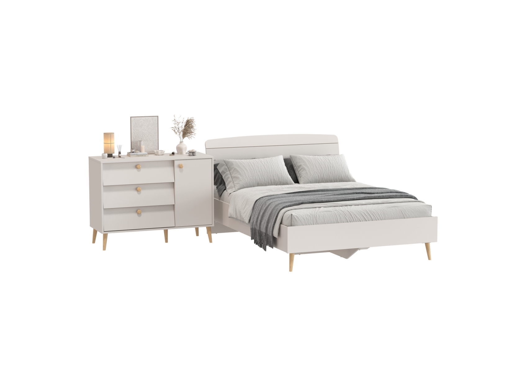 Комод на красивых ножках с тремя ящиками и дверкой и кровать Афина 1400 двуспальная. Цвет - кашемир серый. 2 предмета мебели. Комплектация включает кровать 1400 Афина 4-22911 и комод с дверкой и тремя ящиками Афина 4-44901. Цвет кашемир серый добавляет интерьеру уют и гармонию, прекрасно дополняя современный декор спальни.