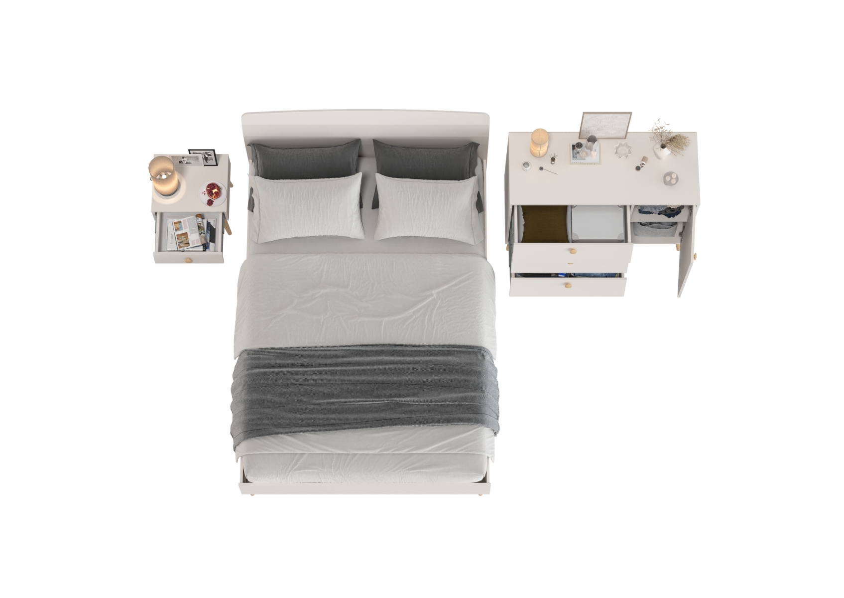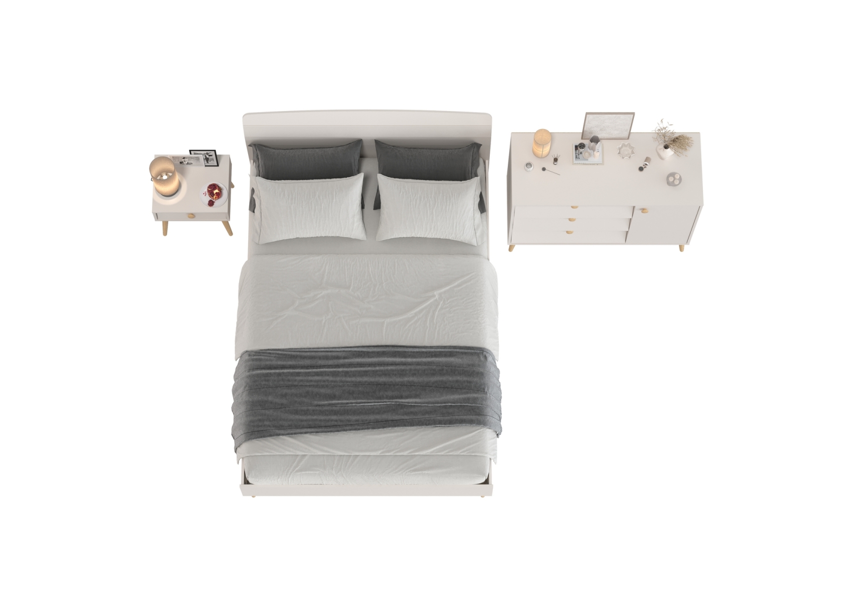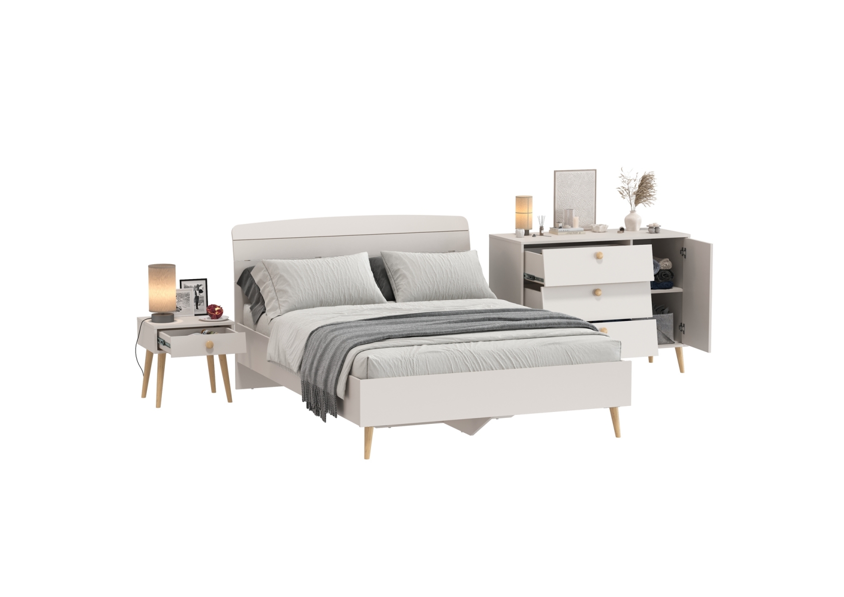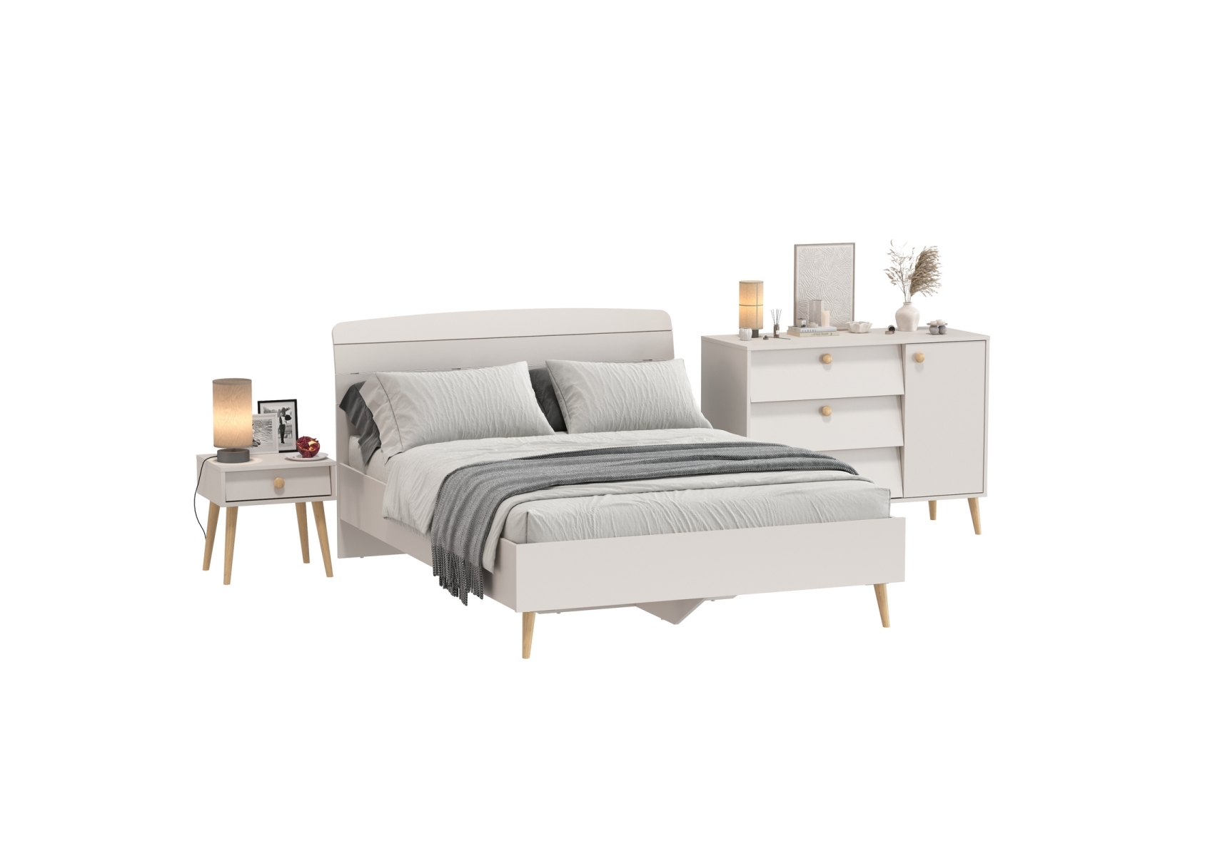 Комплект спальни Афина из кровати 1400 с широким комодом и тумбочки прикроватной. Цвет - кашемир серый. 3 предмета мебели. Комплектация включает кровать 1400 Афина 4-22911, комод с дверкой и тремя ящиками Афина 4-44901 и тумбу прикроватную Афина 4-09901. Цвет кашемир серый добавляет интерьеру уют и гармонию, прекрасно дополняя современный декор спальни.