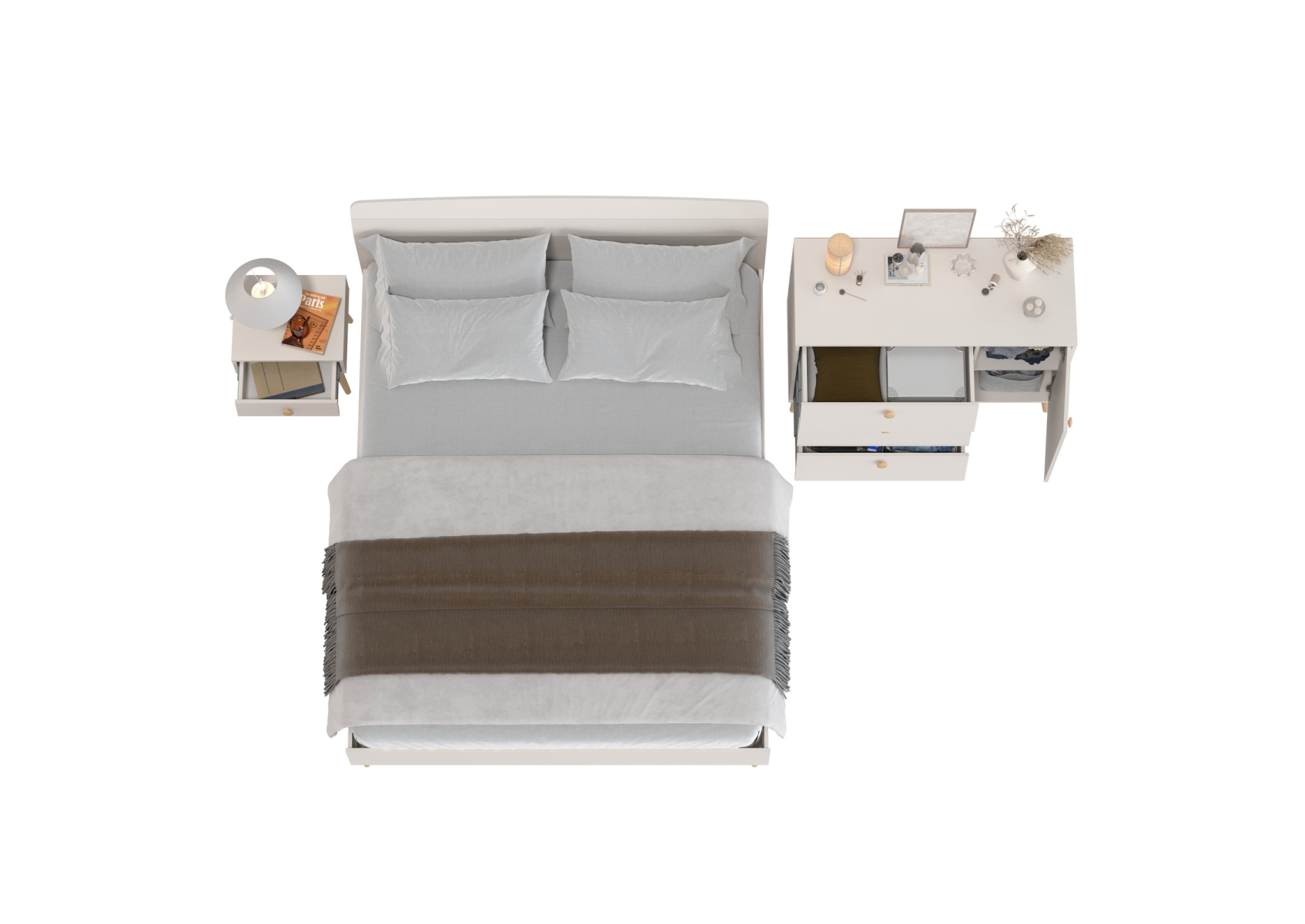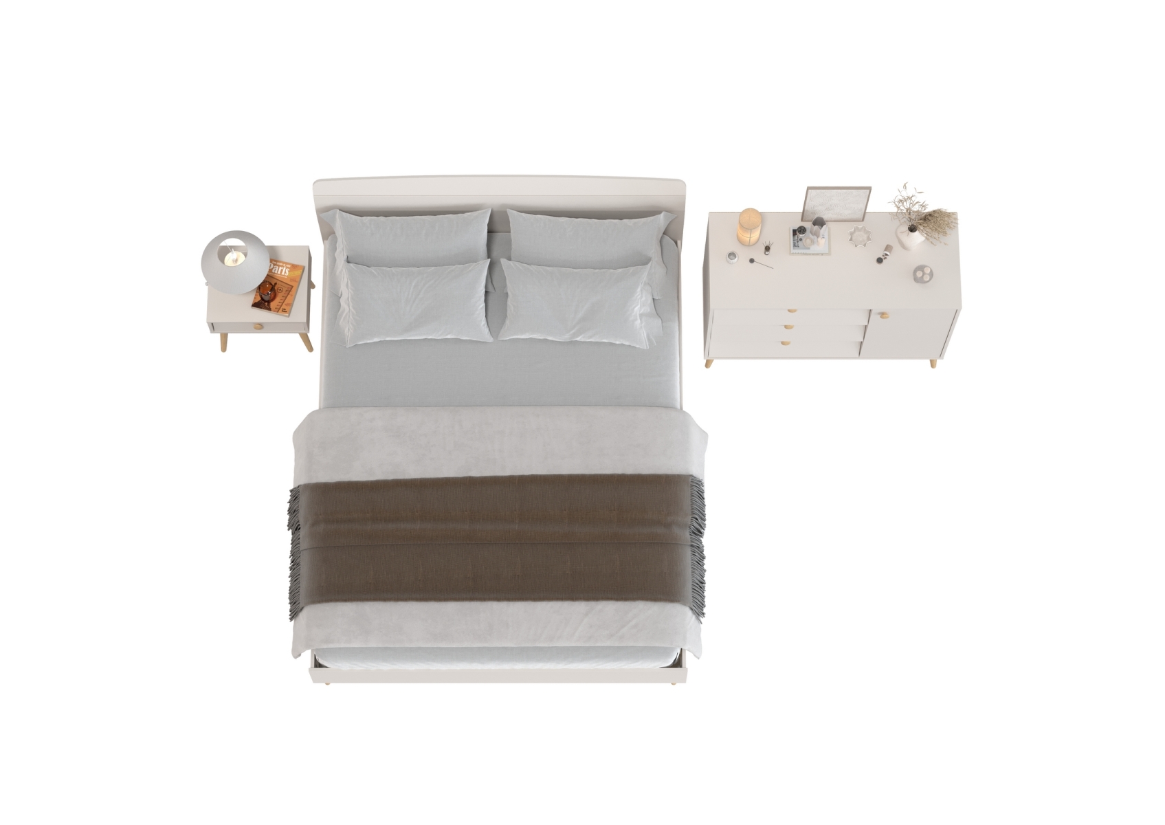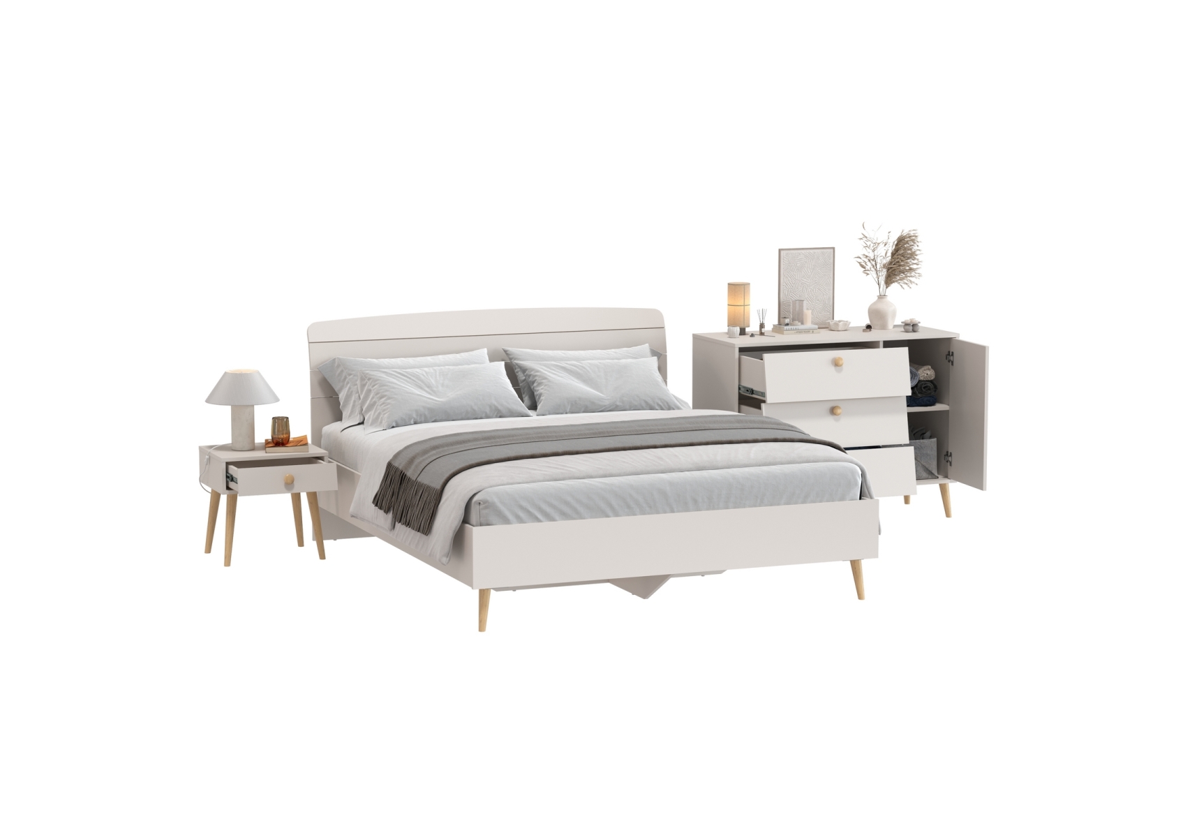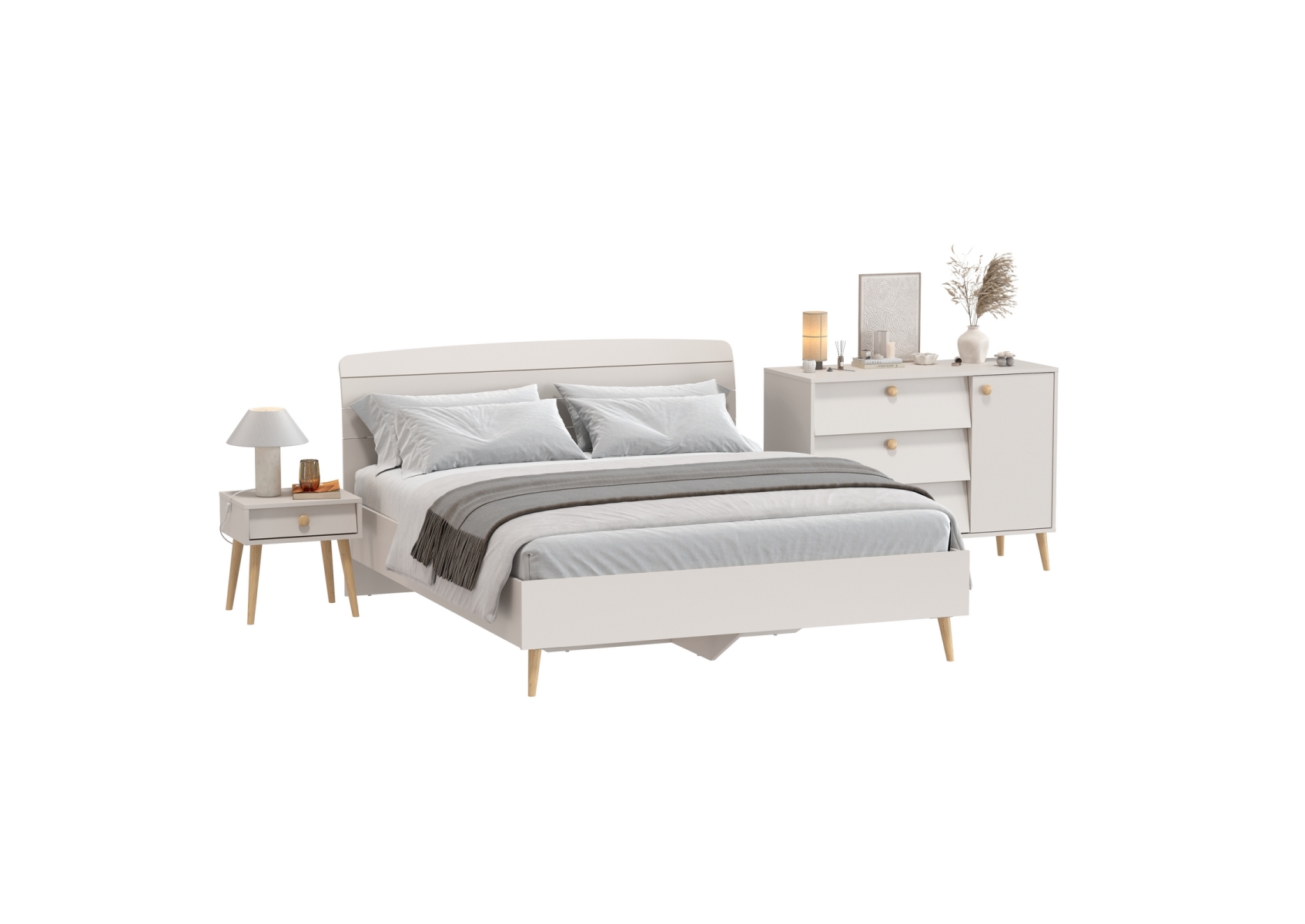 Двуспальная кровать 1600 Афина с тумбой-комодом и прикроватной тумбочкой. Цвет - кашемир серый. 3 предмета мебели. Комплектация включает кровать 1600 Афина 4-22901, комод с дверкой и тремя ящиками Афина 4-44901 и тумбу прикроватную Афина 4-09901. Цвет кашемир серый добавляет интерьеру уют и гармонию, прекрасно дополняя современный декор спальни.
