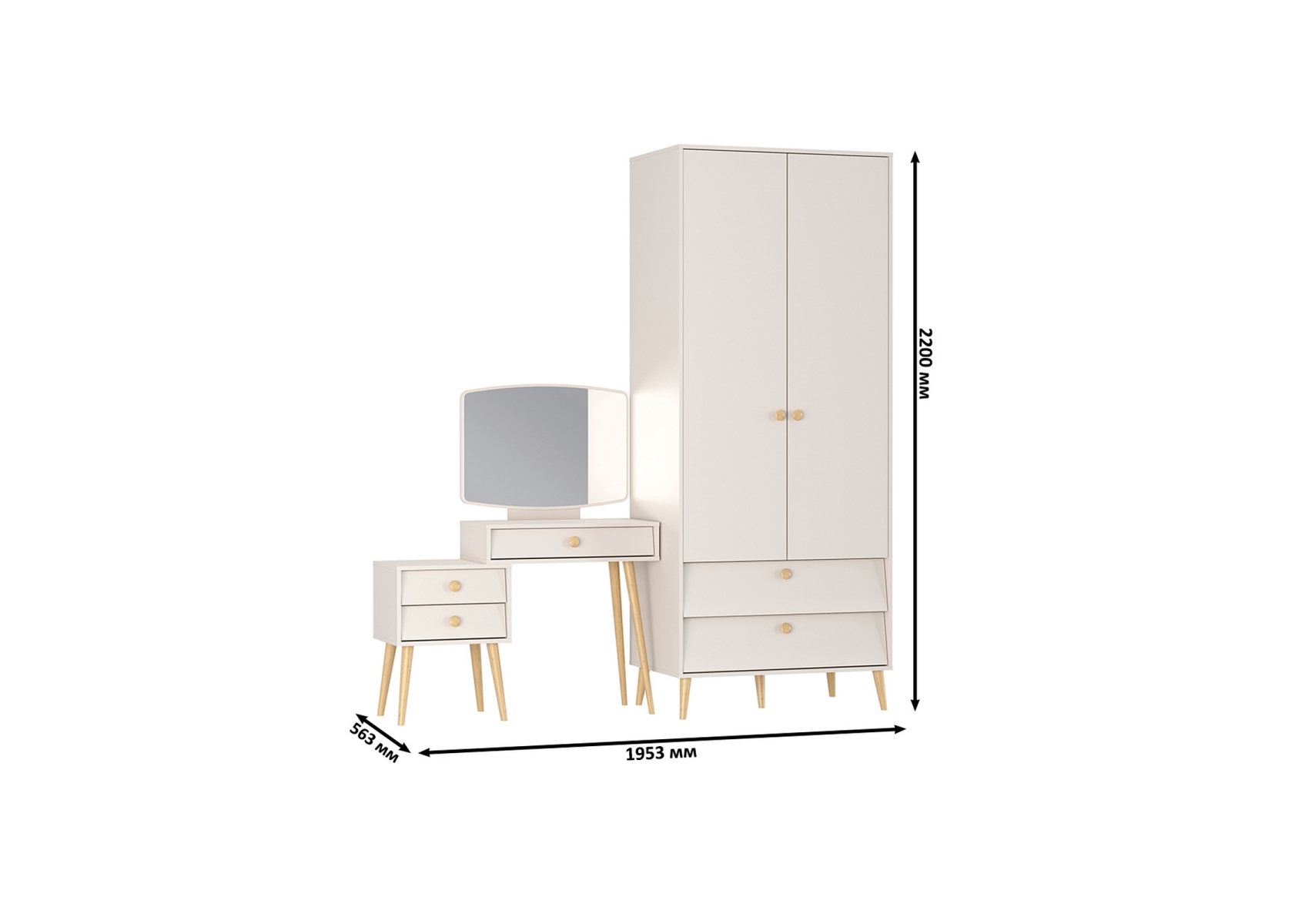 Трюмо с зеркалом Афина и платяной шкаф-комод 2-х дверный. Цвет - кашемир серый. Габариты комплекта (ШхГхВ) 195,3х56,3х220 см. Количество мебели - 2 шт. Трюмо Афина 4-25901 объединяет функции туалетного столика и малой тумбы, предлагая удобные столешницы на разных уровнях для различных нужд. За распашными дверями шкаф оснащен антресольной полкой и штангой для удобного размещения одежды, обеспечивая порядок и доступность. Под отделением с дверями расположены два выдвижных ящика.