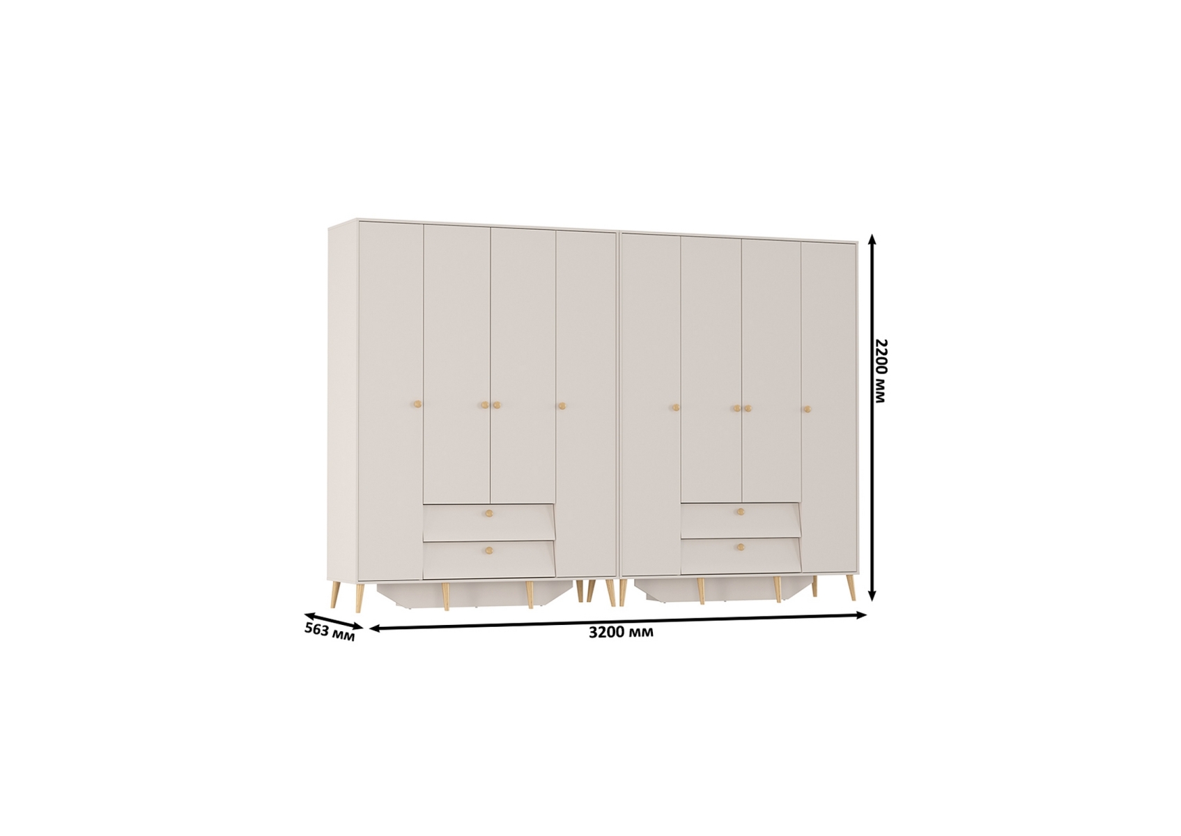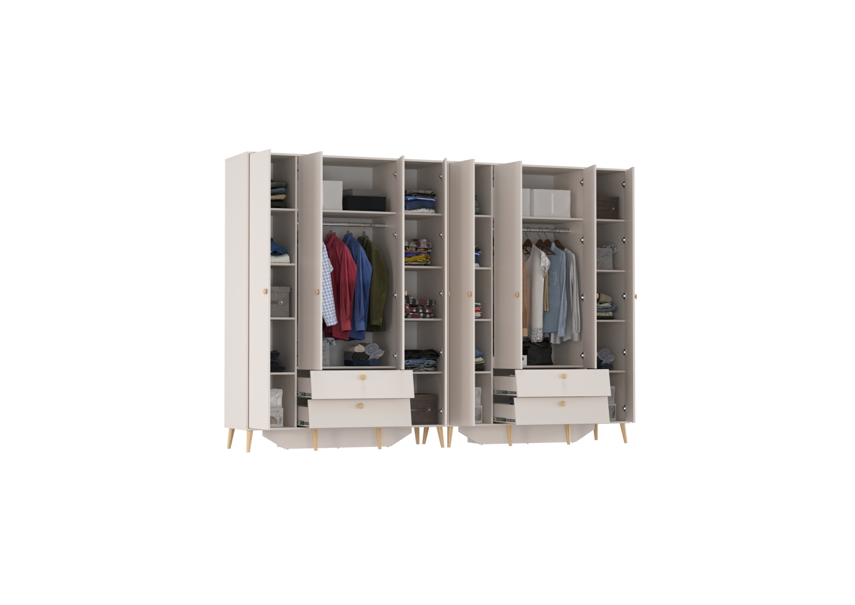 Два шкафа 4-х дверных в спальню Афина с ящиками и дверками. Цвет - кашемир серый. Габариты комплекта (ШхГхВ) 320х56,3х220 см. Количество мебели - 2 шт. Каждый шкаф включает три закрытых отделения и мини-комодик, обеспечивая практичное размещение вещей. Центральная часть каждого шкафа состоит из отделения за двумя распашными дверками с антресольной полкой и штангой для одежды на плечиках — это дает возможность хранить как длинные, так и короткие вещи.