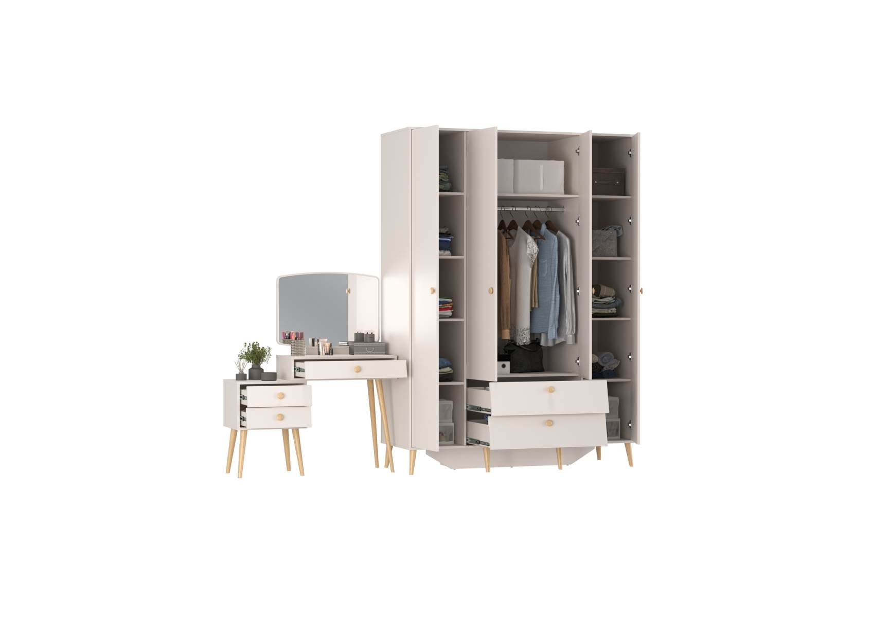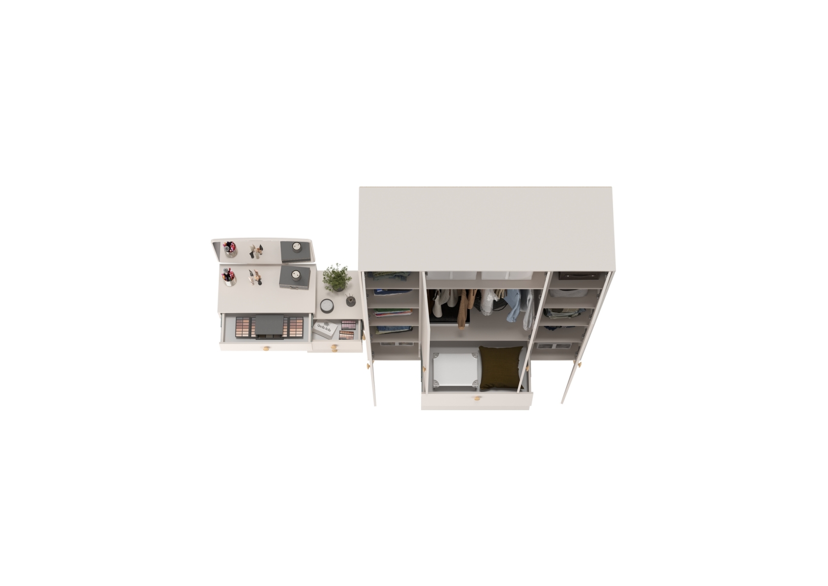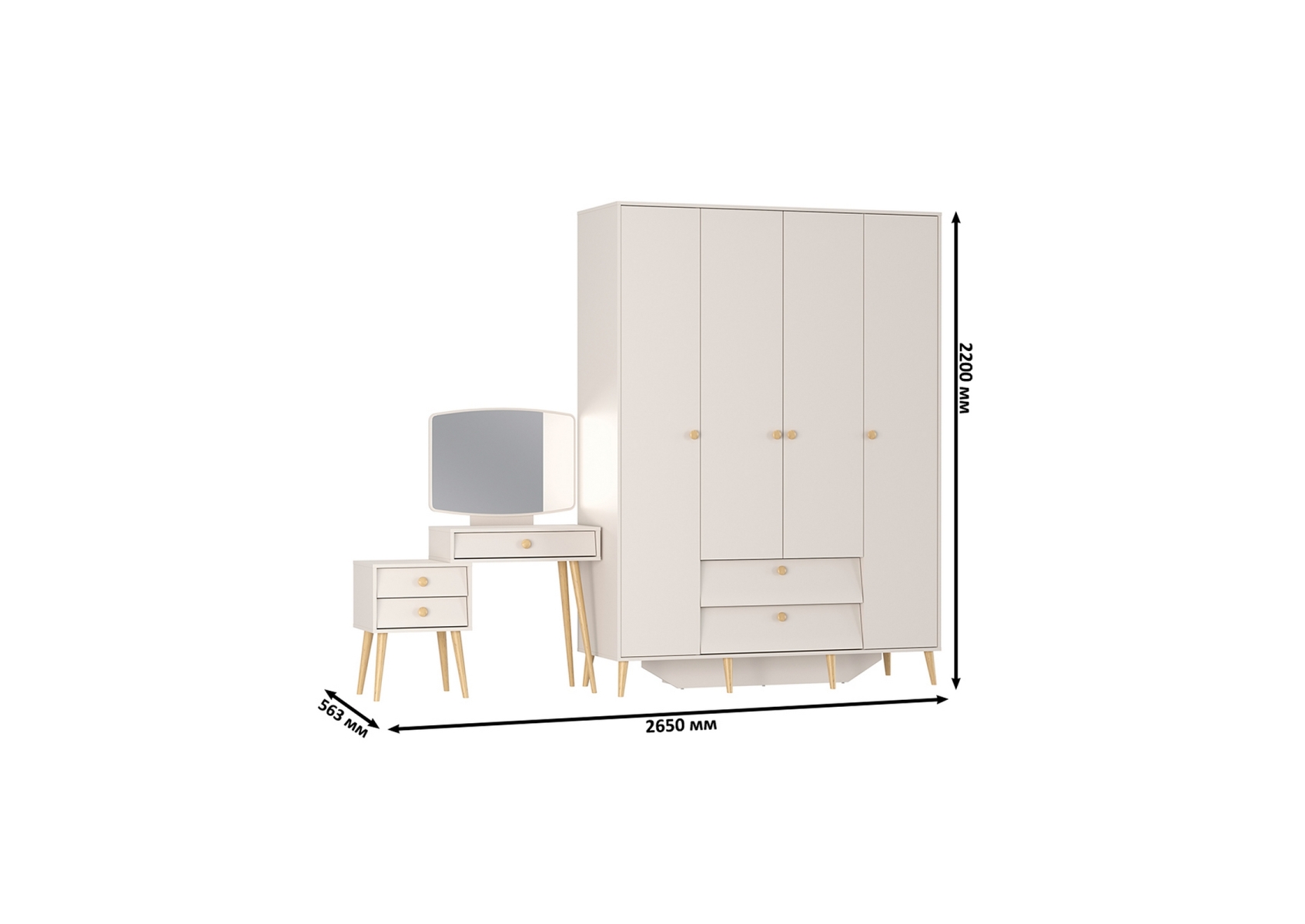 Трюмо с зеркалом и ящиками и комод-шкаф 4-х дверный Афина. Цвет - кашемир серый. Габариты комплекта (ШхГхВ) 265х56,3х220 см. Количество мебели - 2 шт. Комплектация включает трюмо с зеркалом Афина 4-25901 и шкаф 4-х дверный Афина 4-75930. Трюмо Афина 4-25901 объединяет функции туалетного столика и малой тумбы, предлагая удобные столешницы на разных уровнях для различных нужд.
