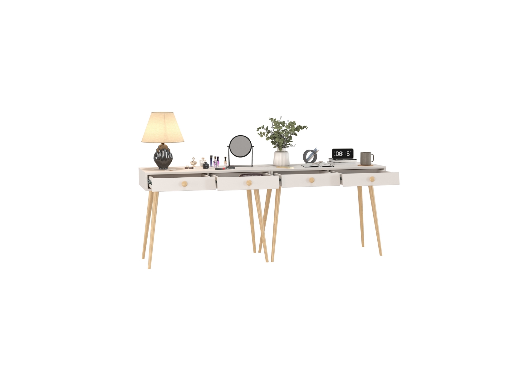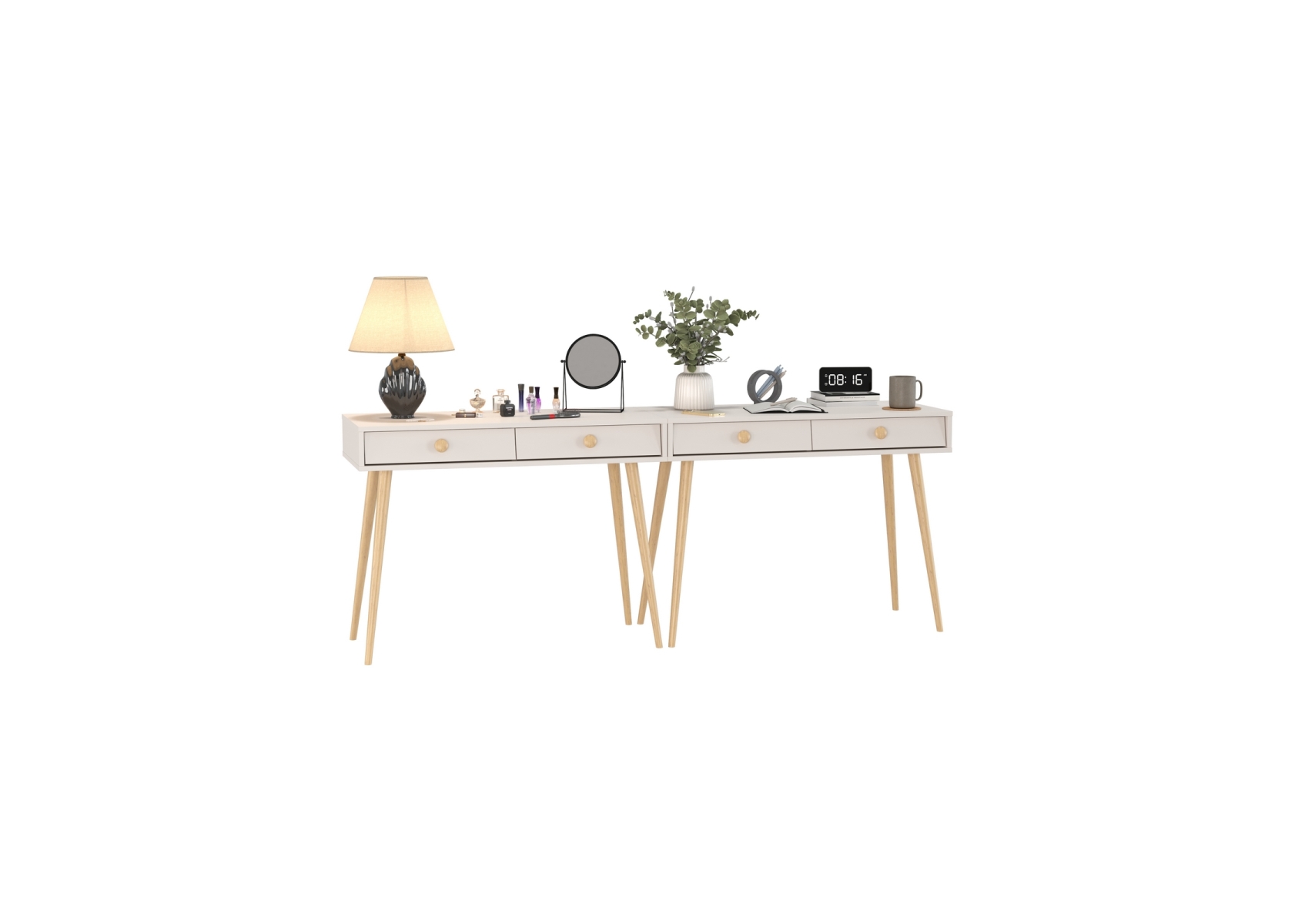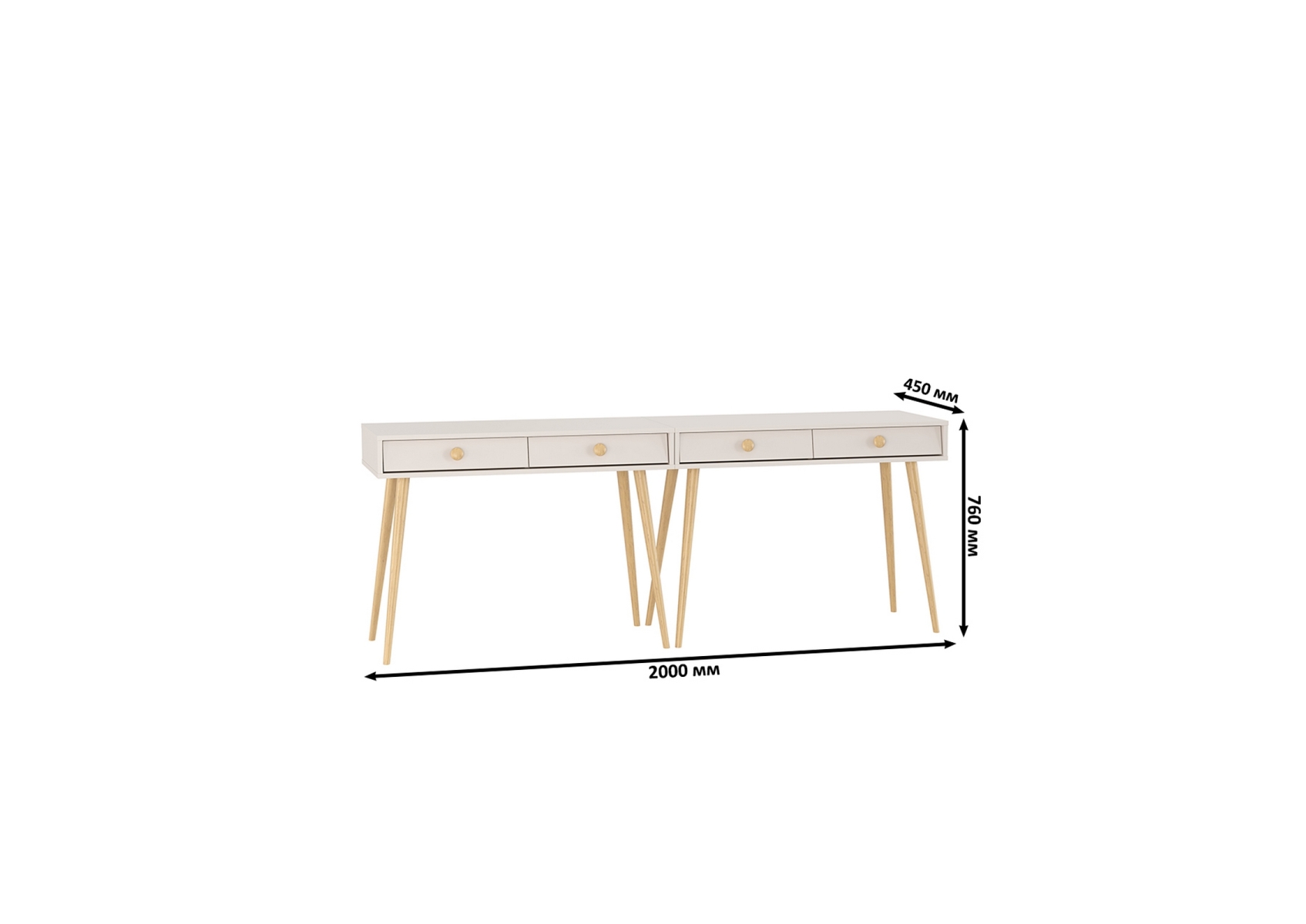 Два столика с ящиками и на красивых ножках Афина. Цвет - кашемир серый. Габариты комплекта (ШхГхВ) 200х45х76 см. Количество мебели - 2 шт. Каждый столик Афина 4-25904 (в комплектации 2 ед.) оборудован двумя выдвижными ящиками, которые идеально подходят для хранения нужных мелочей, аксессуаров или документов. Столики установлены на опоры высотой 60 см.