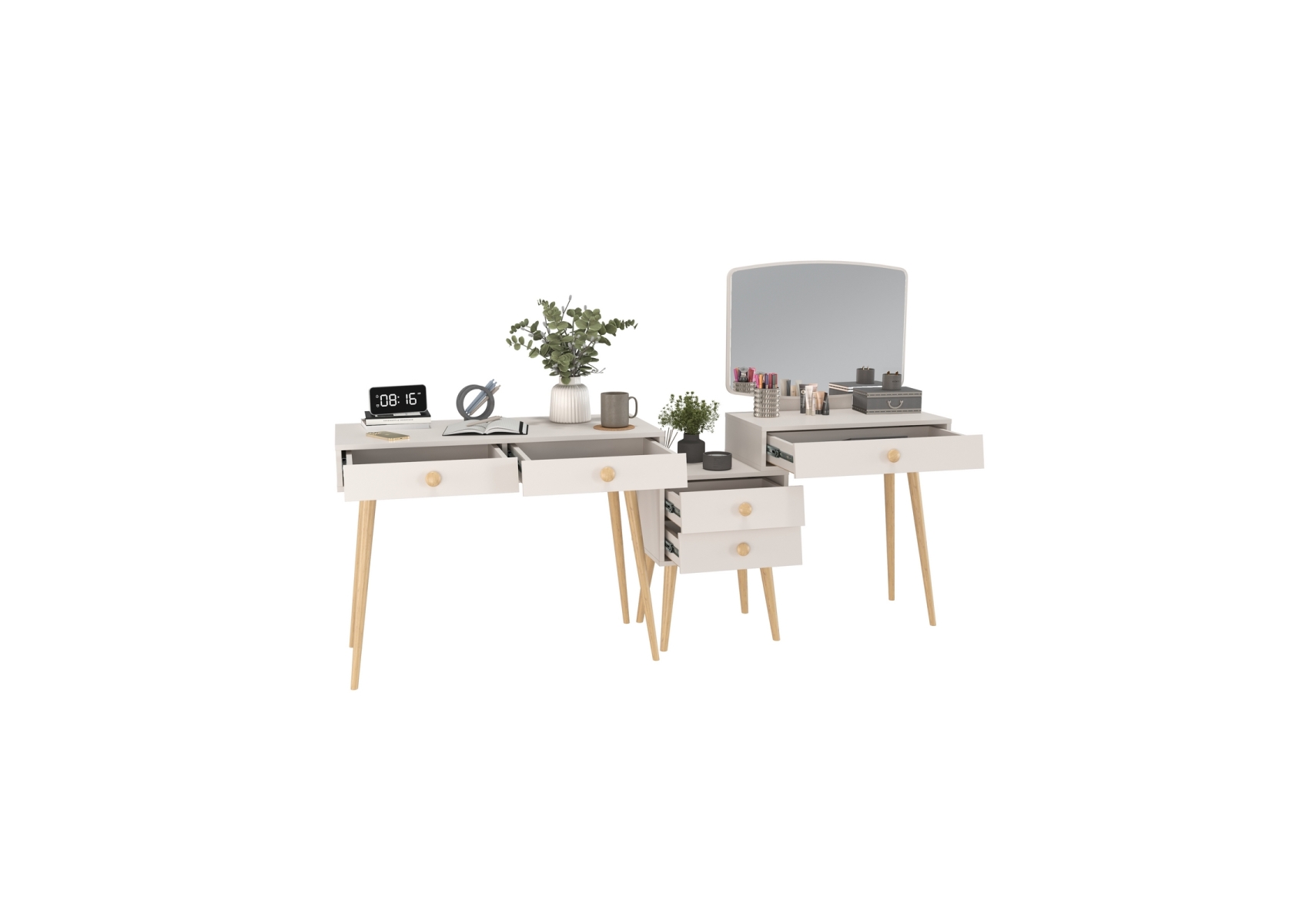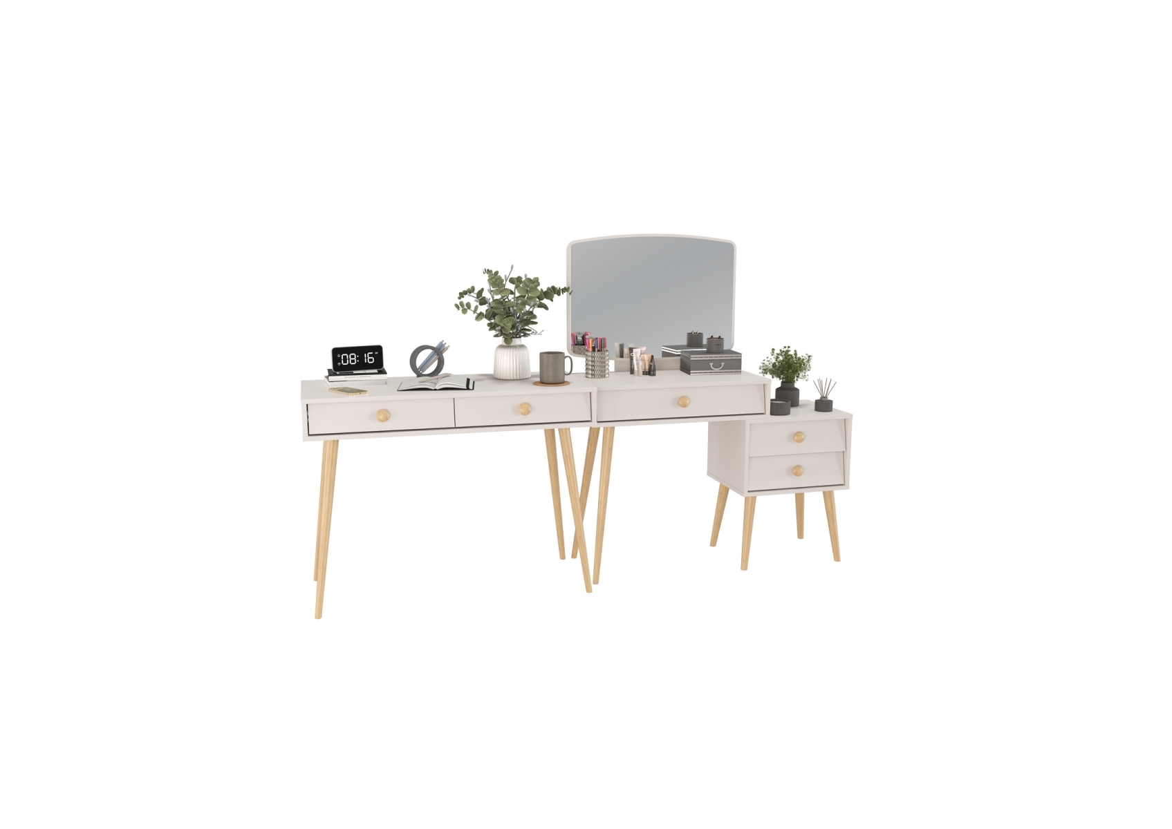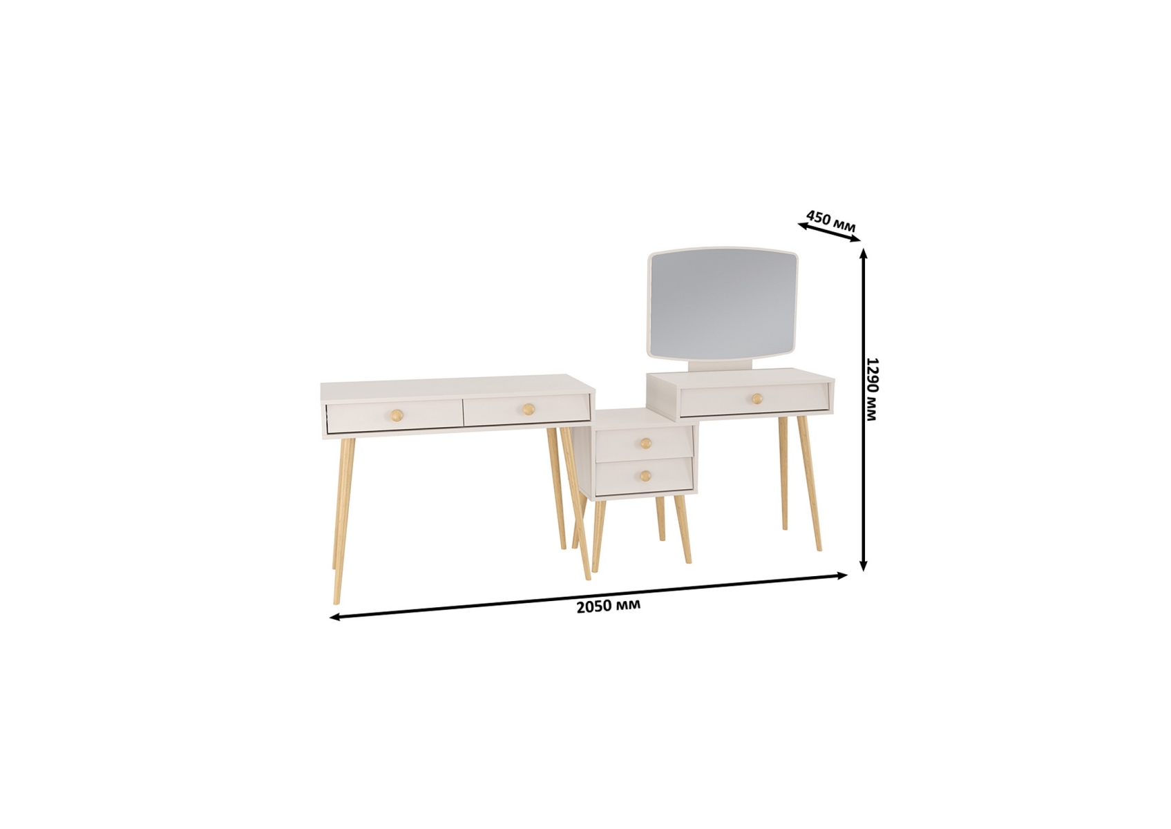 Туалетный стол с зеркалом Афина и стол на ножках. Цвет - кашемир серый. Габариты комплекта (ШхГхВ) 205х45х129 см. Количество мебели - 2 шт. Трюмо Афина 4-25901 объединяет функции туалетного столика и малой тумбы, предлагая удобные столешницы на разных уровнях для различных нужд. Столик Афина 4-25904 оборудован двумя выдвижными ящиками, которые идеально подходят для хранения нужных мелочей, аксессуаров или документов.