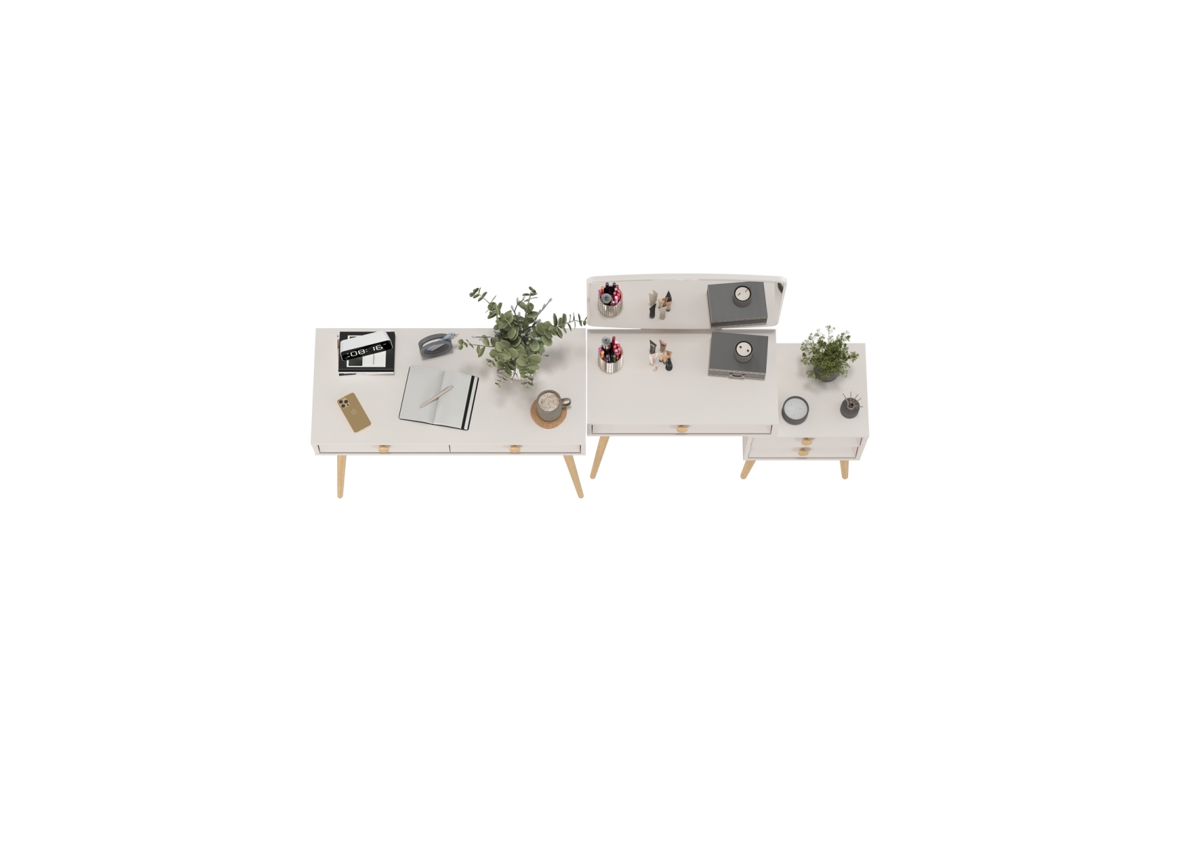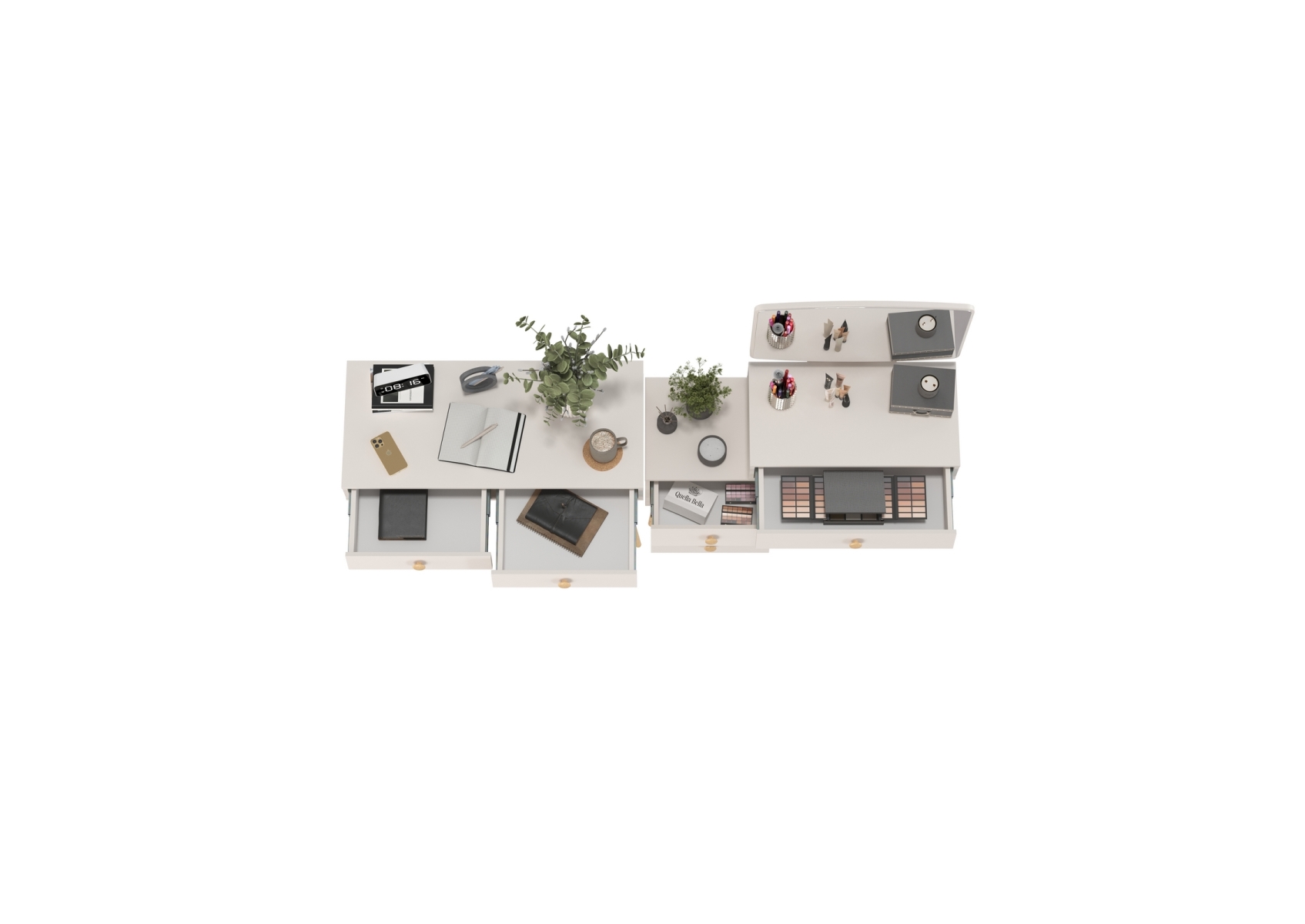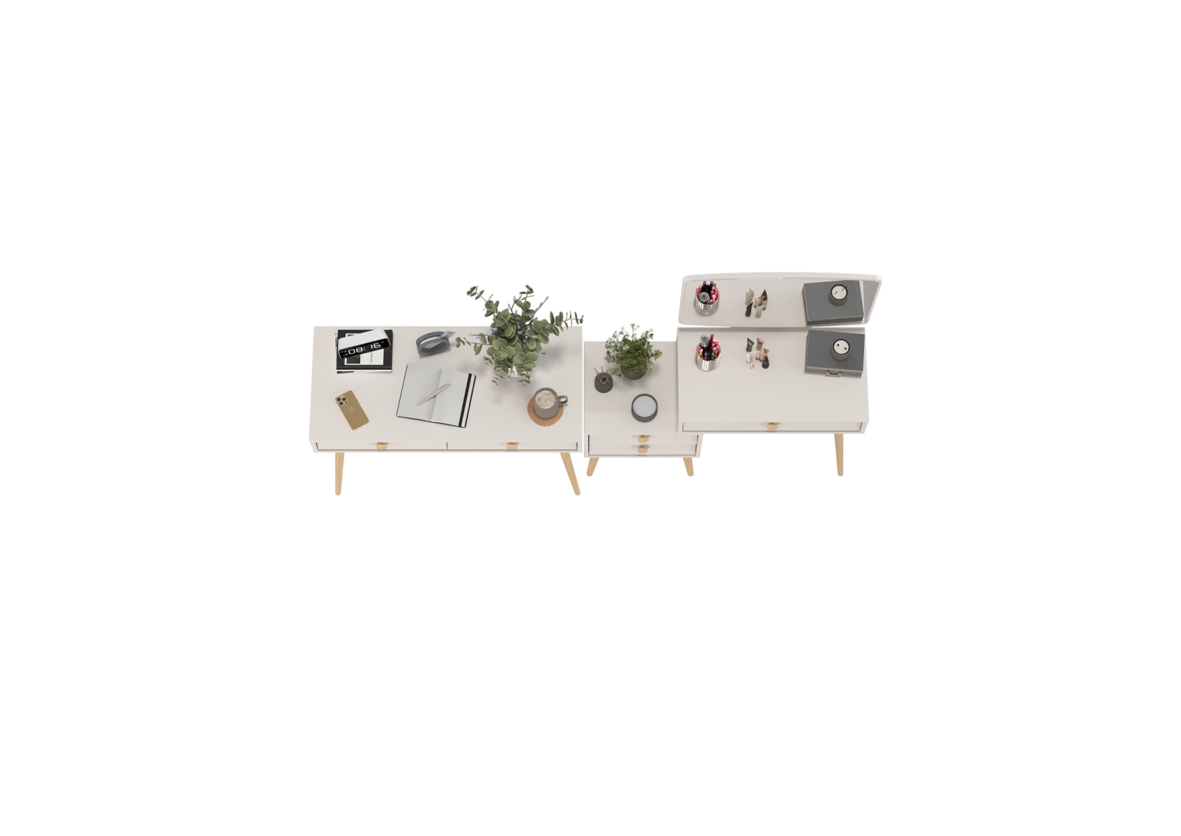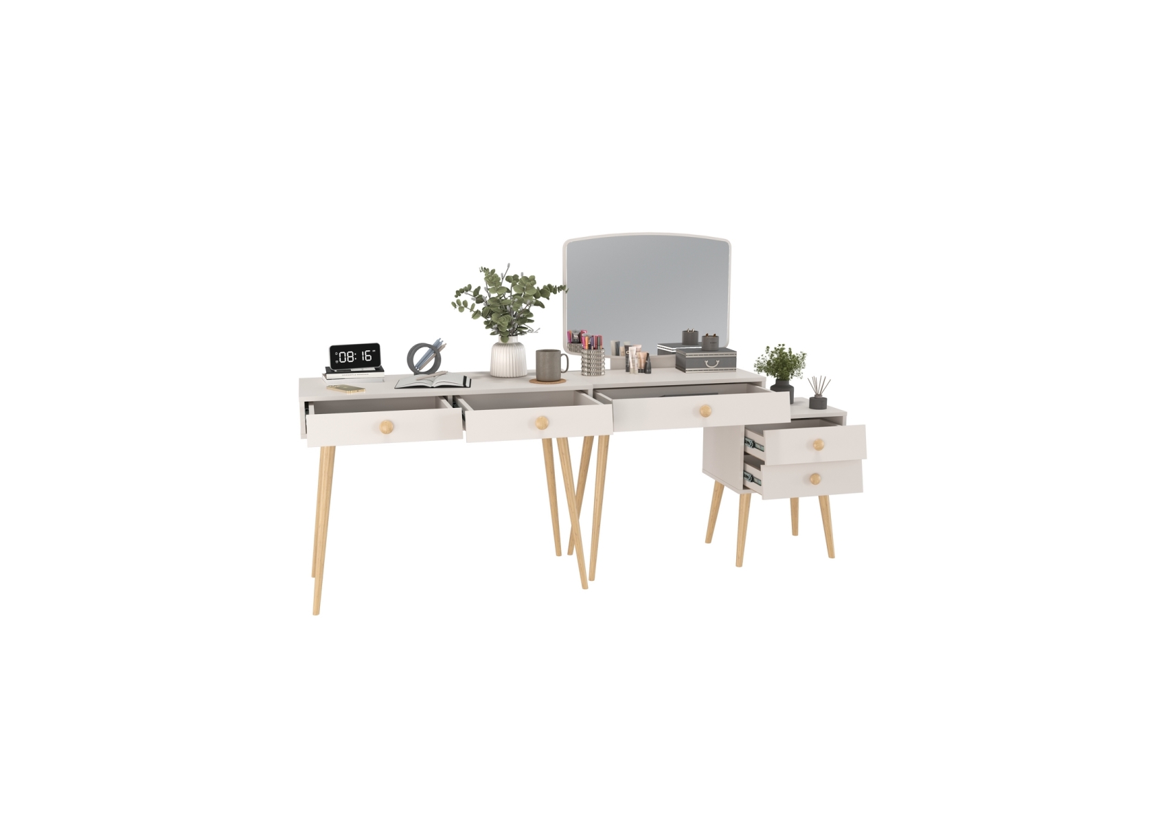 Туалетный стол с зеркалом Афина и стол на ножках. Цвет - кашемир серый. Габариты комплекта (ШхГхВ) 205х45х129 см. Количество мебели - 2 шт. Трюмо Афина 4-25901 объединяет функции туалетного столика и малой тумбы, предлагая удобные столешницы на разных уровнях для различных нужд. Столик Афина 4-25904 оборудован двумя выдвижными ящиками, которые идеально подходят для хранения нужных мелочей, аксессуаров или документов.
