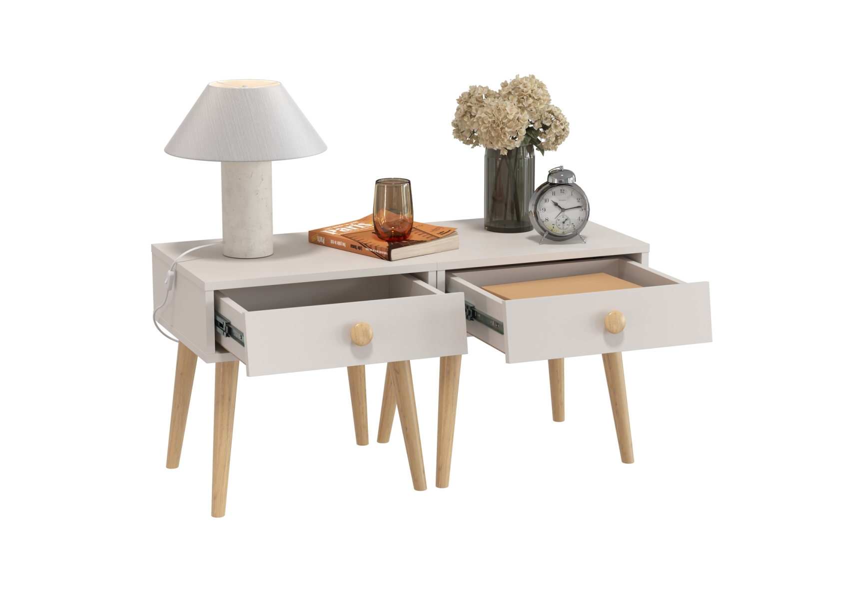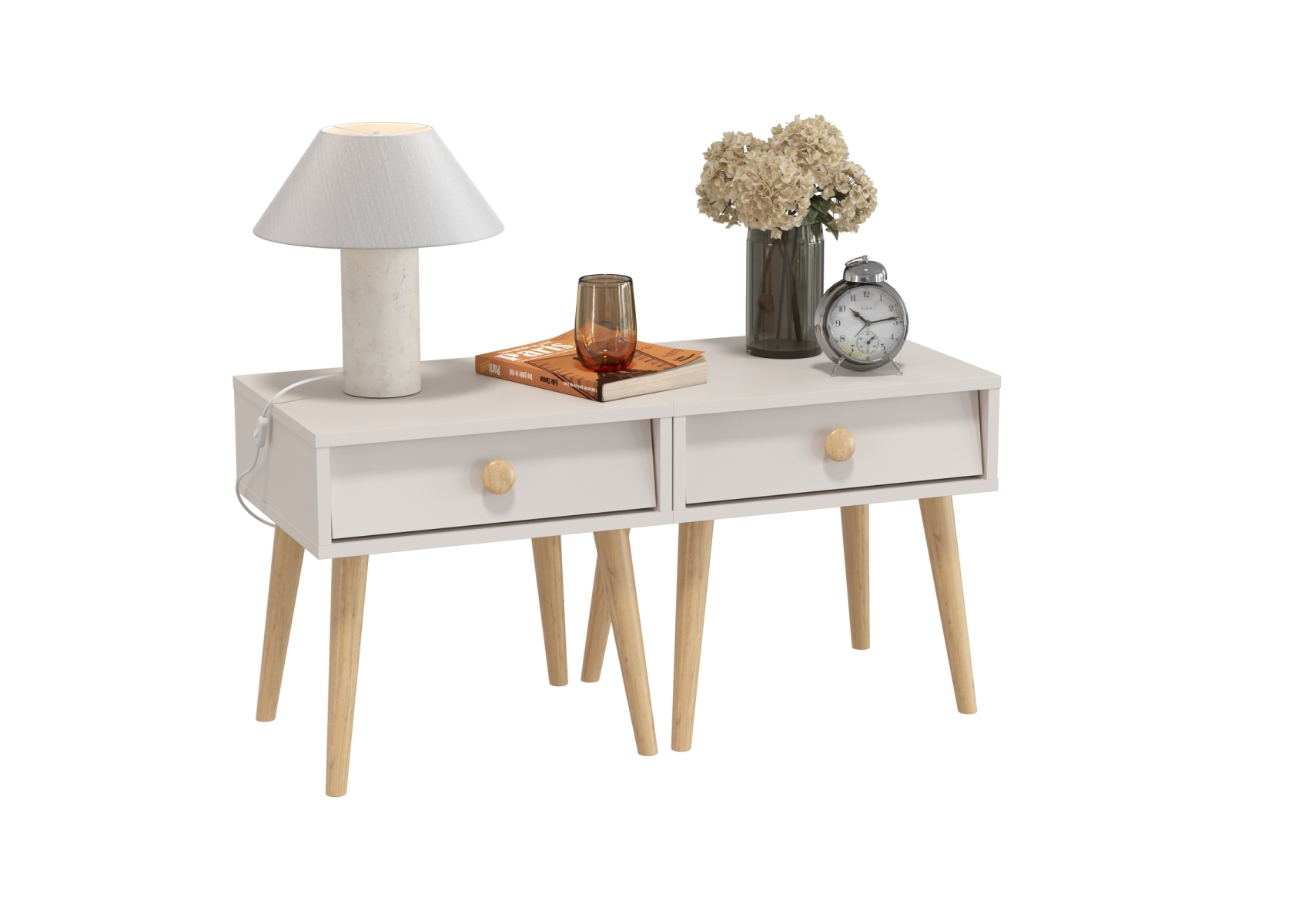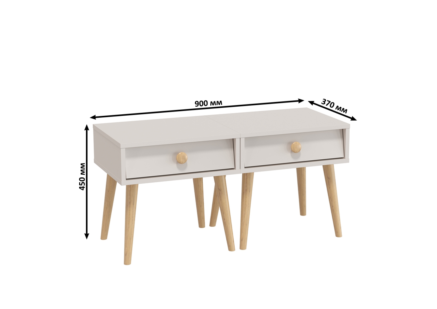 Две прикроватных тумбочки на высоких ножках Афина. Цвет - кашемир серый. Габариты тумбы (ШхГхВ) 45х37х45 см. Каждая тумба оснащена вместительным выдвижным ящиком на шариковых направляющих полного выдвижения, что обеспечивает удобство и плавность в использовании. Высокие опоры из массива бука (высотой 30 см).