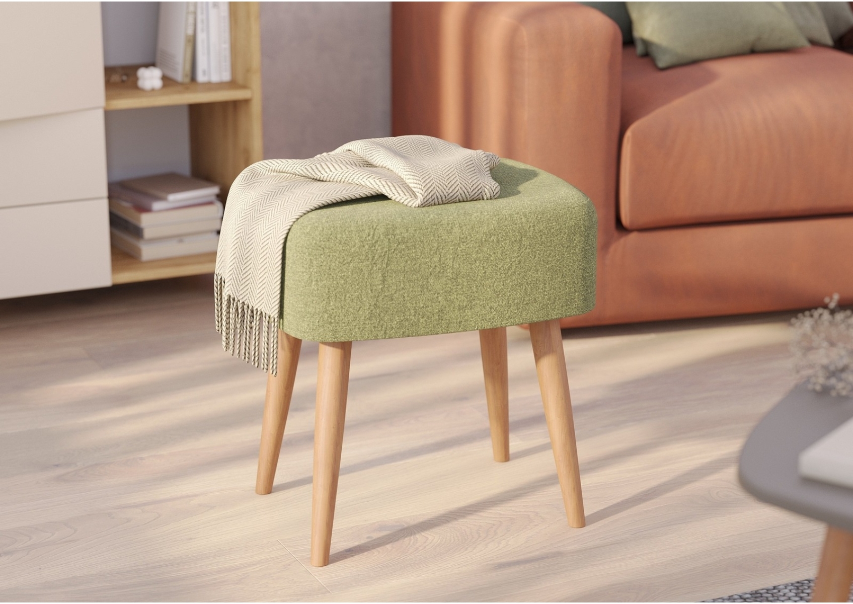 Банкетка прямоугольная на четырёх ножках 6-5135 Полли. Обивка - ткань зелёная. Габариты (ШхГхВ) 44х34х45 см. Идеальный выбор для спальни, прихожей или зоны ожидания в офисе — она создаёт комфортное место для отдыха и удобства в повседневных делах. Мягкое сиденье с обивкой из приятной на ощупь ткани. Наполнитель из пенополиуретана.