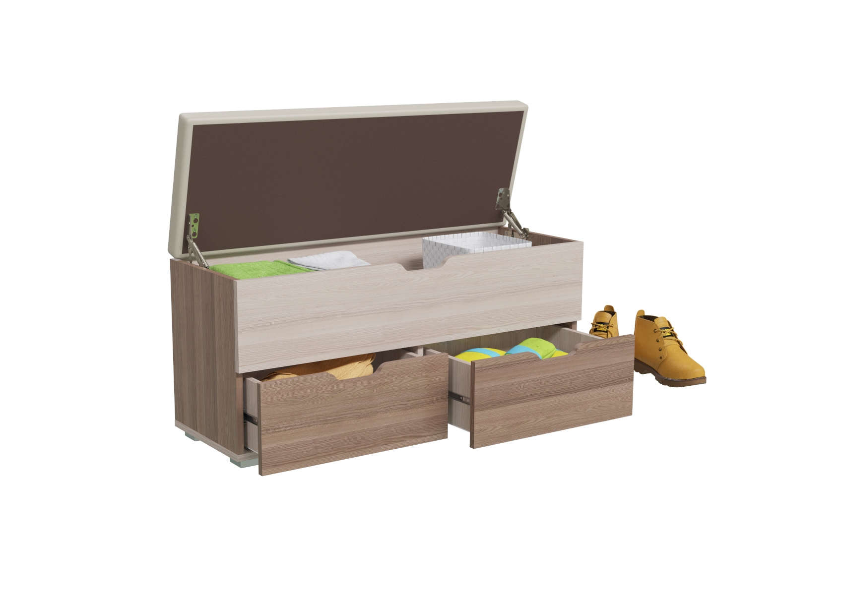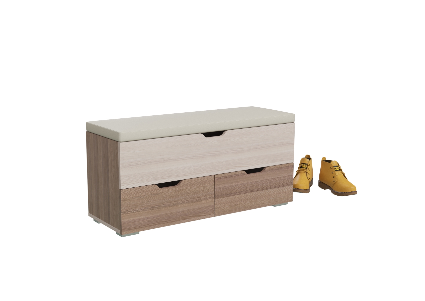 Пуфик Флинт. Цвет - ясень шимо тёмный/ясень шимо светлый. Размер (ШхГхВ) 100х37х47 см. Широкий пуф с мягким сиденьем станет неотъемлемой частью интерьера прихожей, спальни или детской. Конструкторы модели приготовили Вам сюрприз в виде вместительной ниши под откидывающейся крышкой и двух выдвижных ящиков в основании пуфа.
