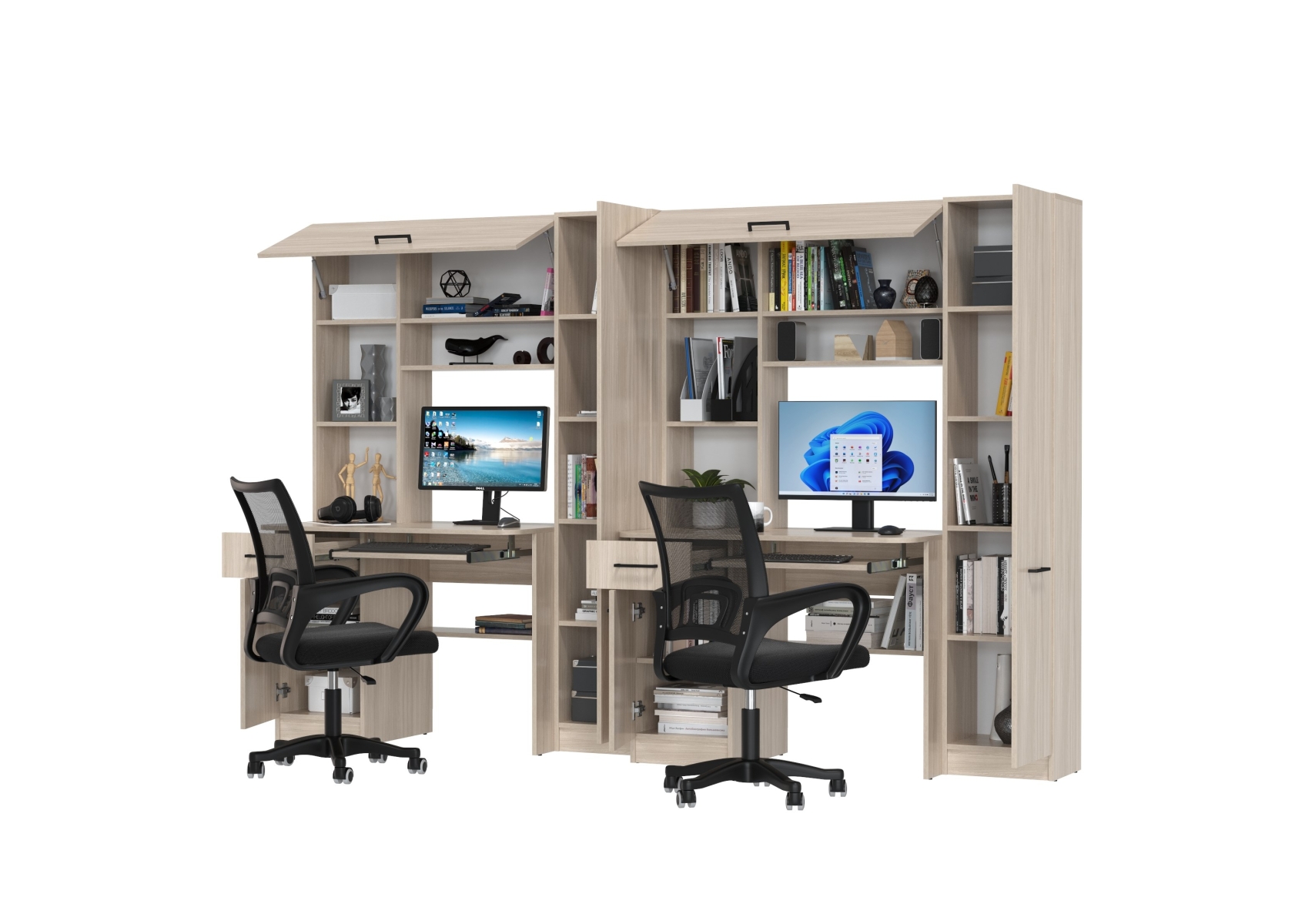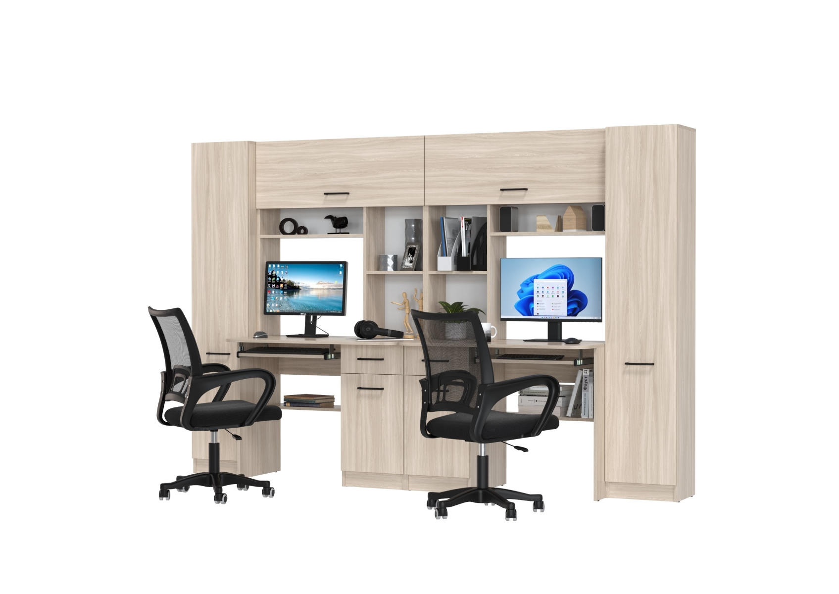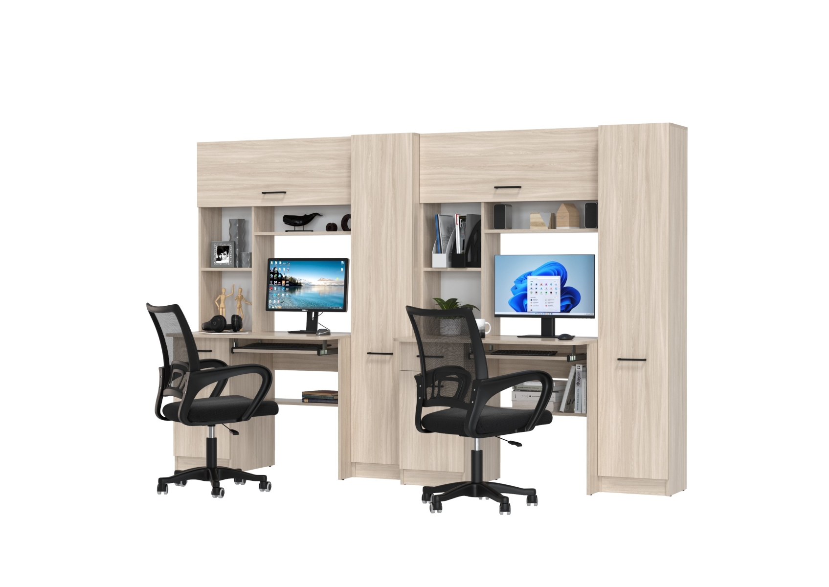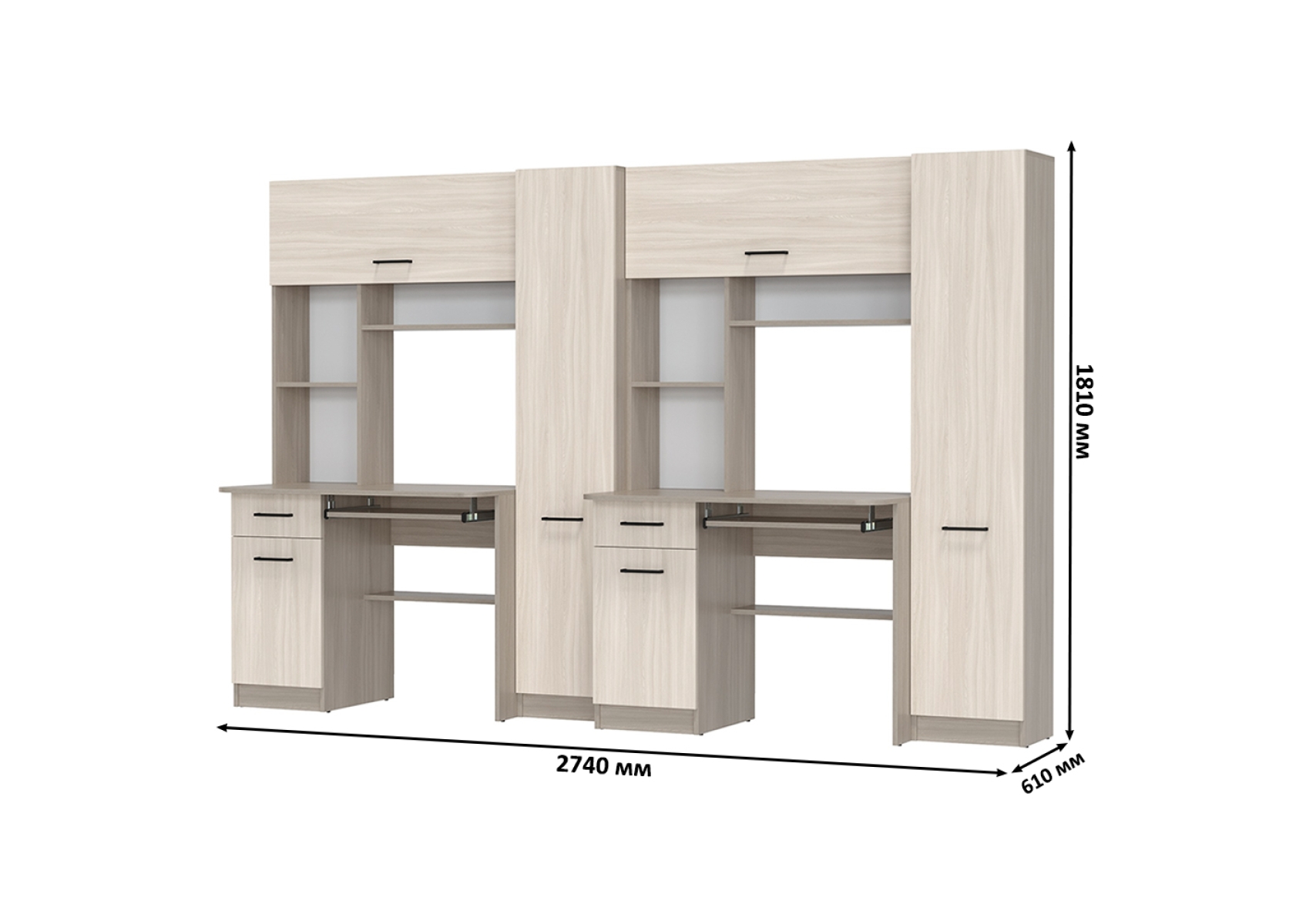 Столы рабочие для двоих с компьютерными креслами Aльфа. Цвет - ясень шимо светлый. Габариты - 274х61х181 см. Каждое рабочее место включает однотумбовый компьютерный стол с надстройкой и пеналом, обеспечивая достаточное пространство для учебы, работы и хранения. Два эргономичных компьютерных кресла в комплекте.