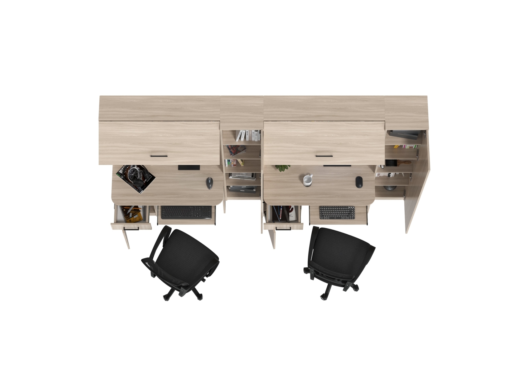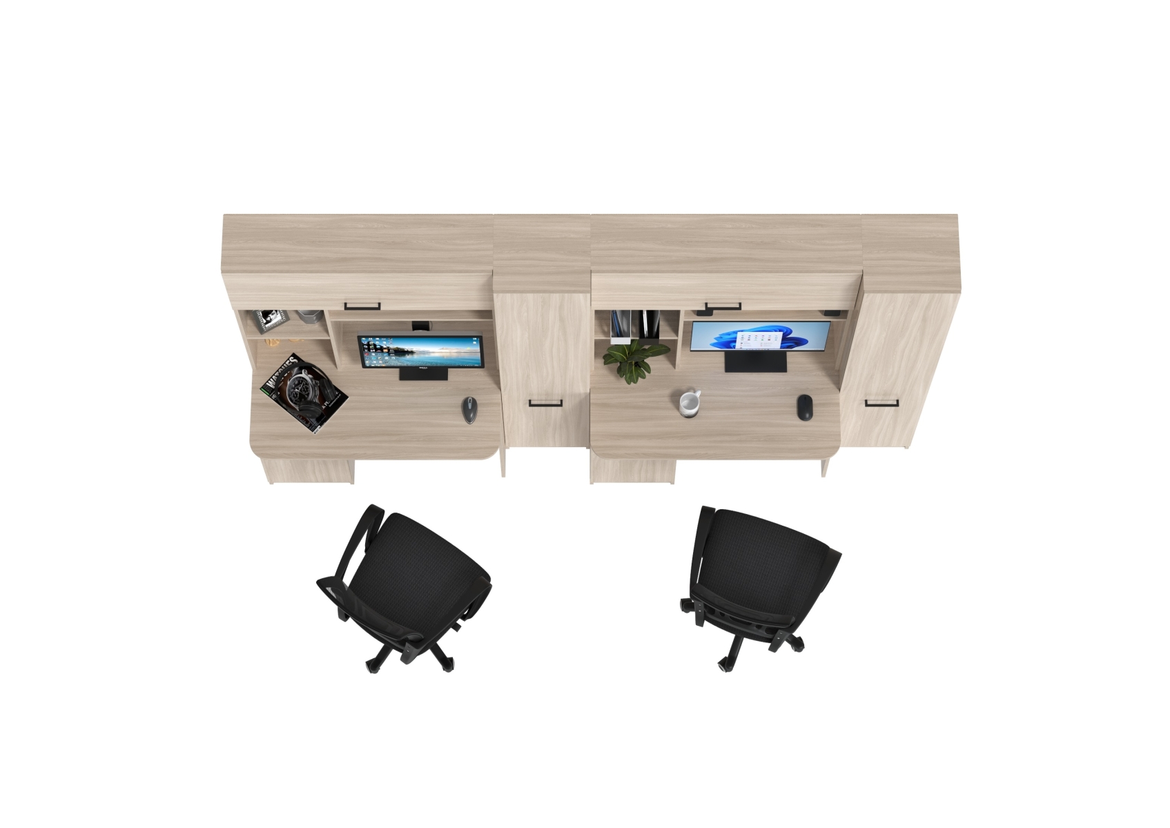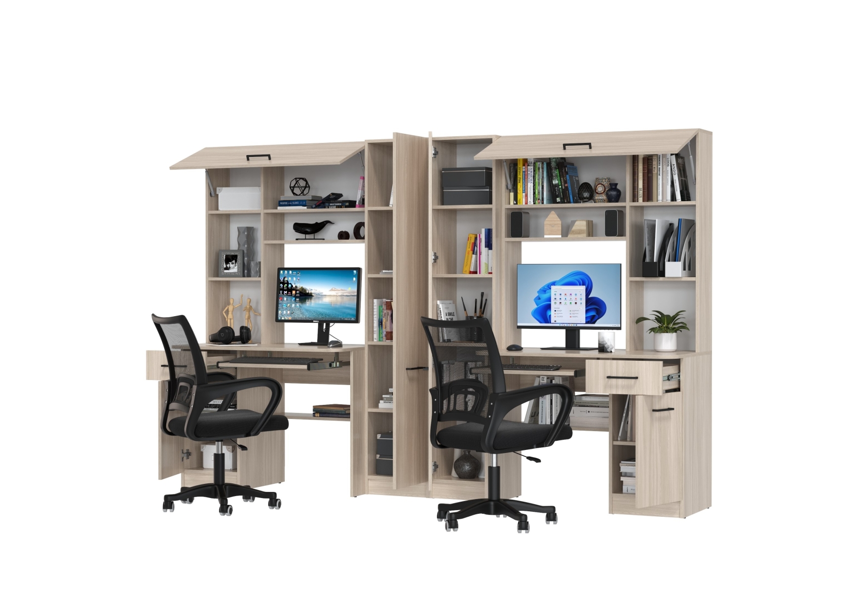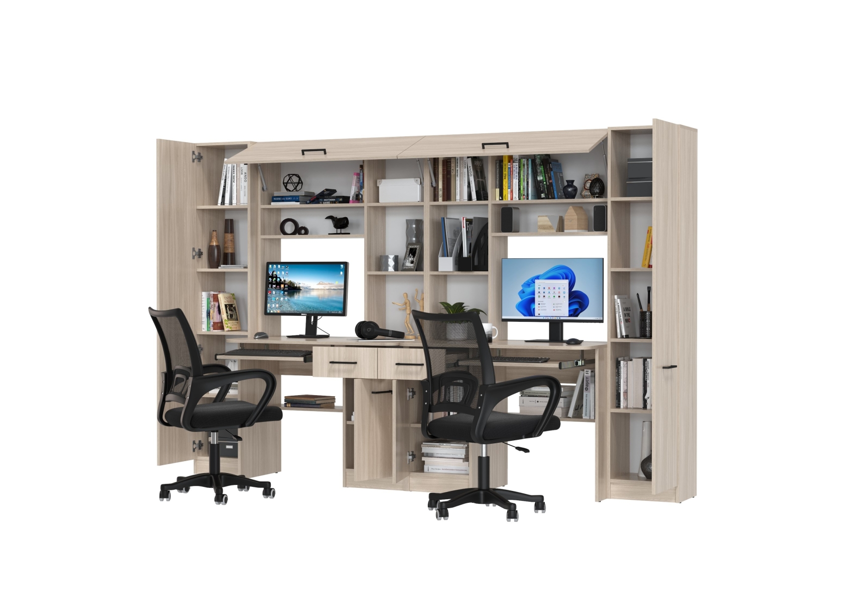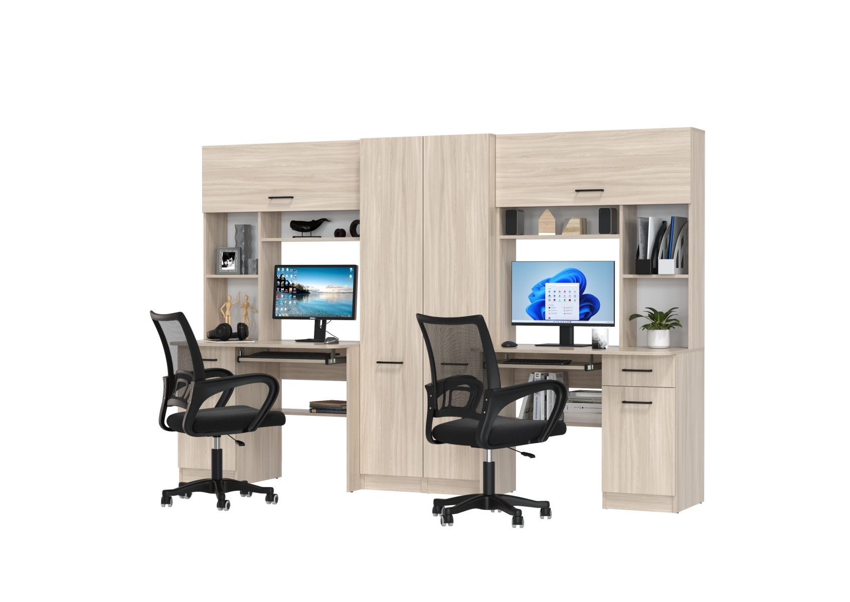 Столы рабочие для двоих с компьютерными креслами Aльфа. Цвет - ясень шимо светлый. Габариты - 274х61х181 см. Каждое рабочее место включает однотумбовый компьютерный стол с надстройкой и пеналом, обеспечивая достаточное пространство для учебы, работы и хранения. Два эргономичных компьютерных кресла в комплекте.