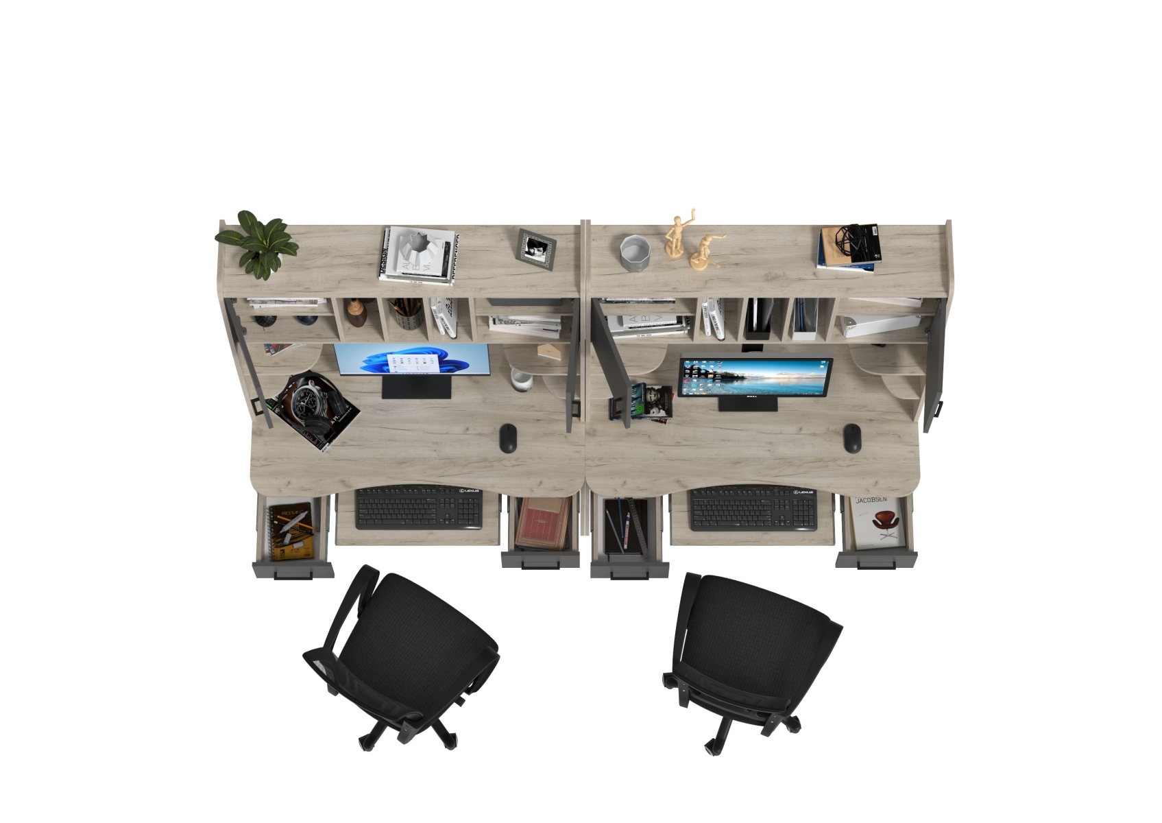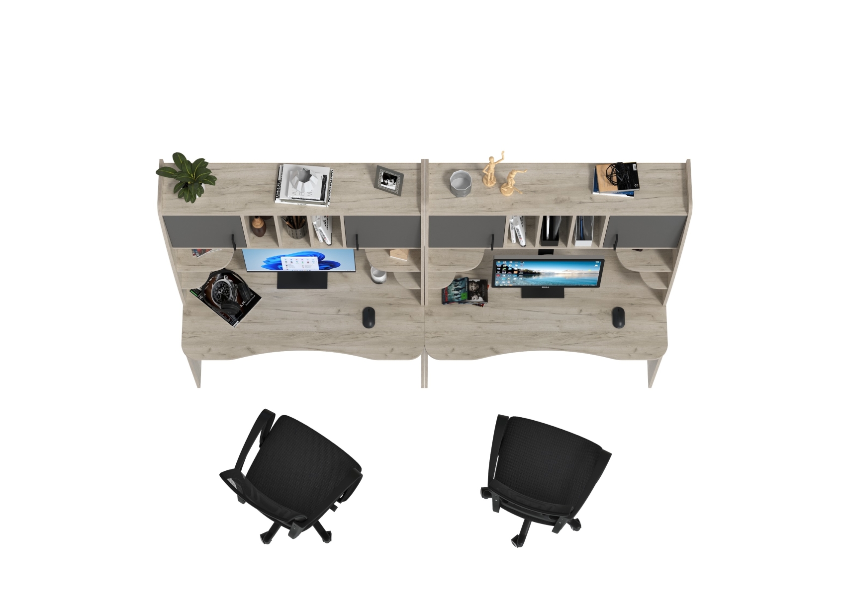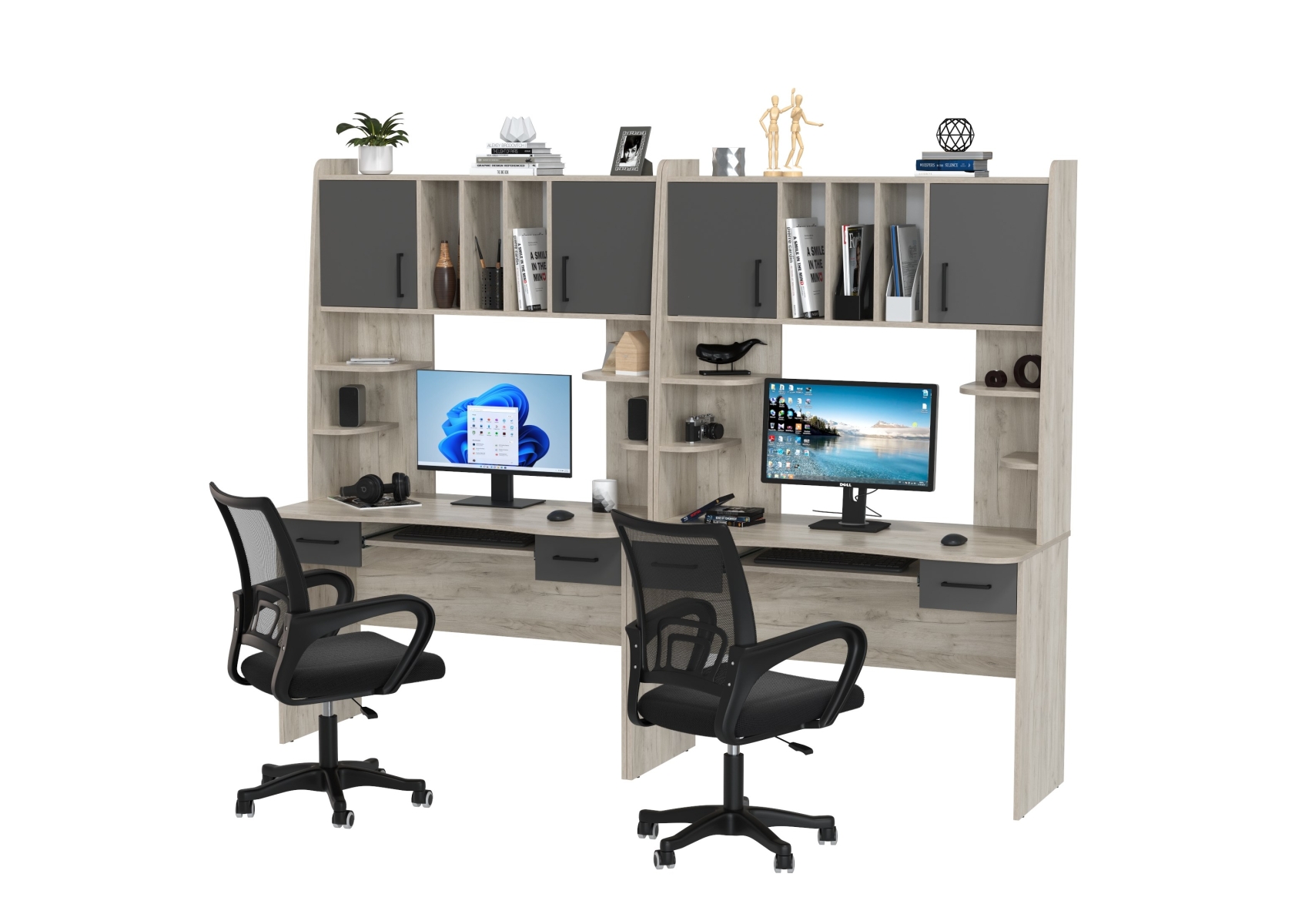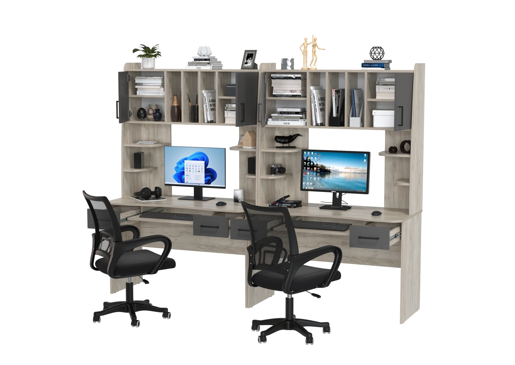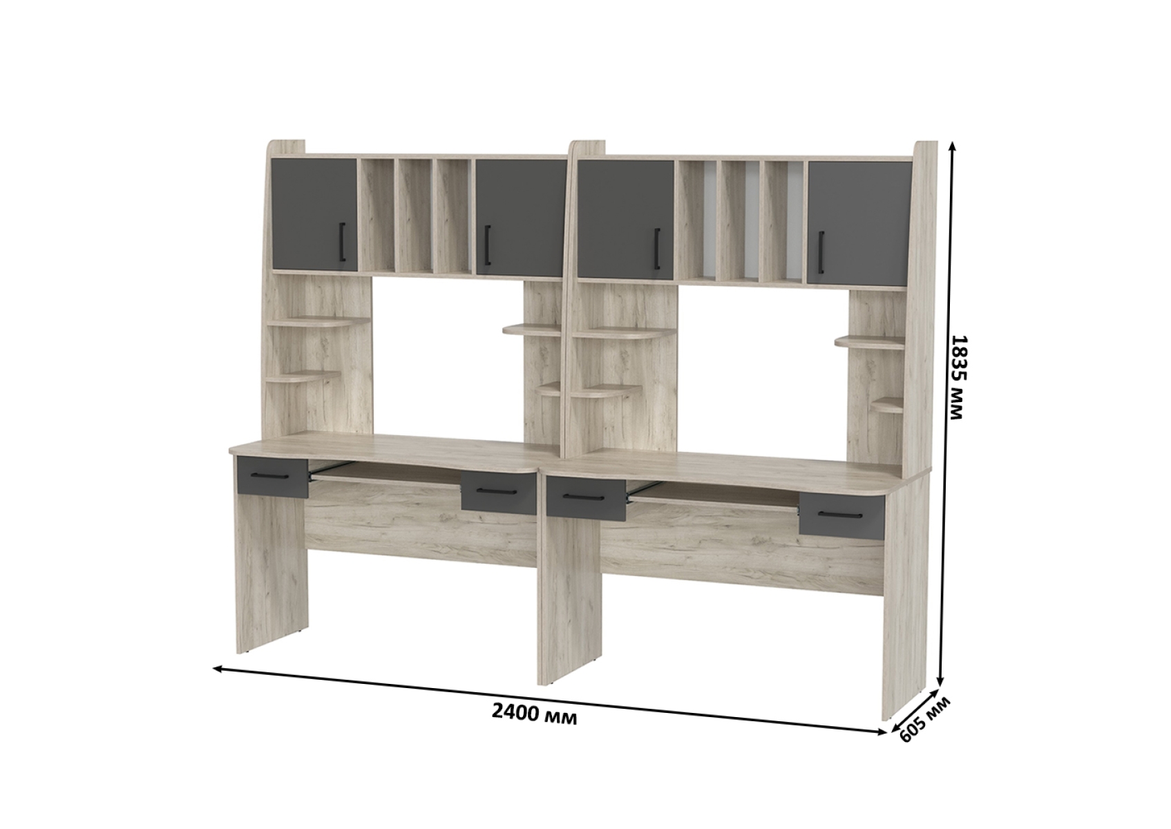 Два рабочих стола Бета и два кресла 103 чёрных. Цвет - дуб крафт серый/графит. Габариты - 240х60,5х183,5 см. Идеальное решение для обустройства рабочего места для двоих человек, будь то дети, подростки или взрослые. Каждый стол оборудован надстройкой с двумя закрытыми отделениями, открытыми полками и нишами с перегородками.