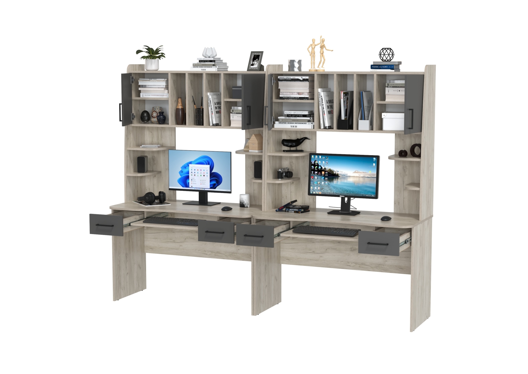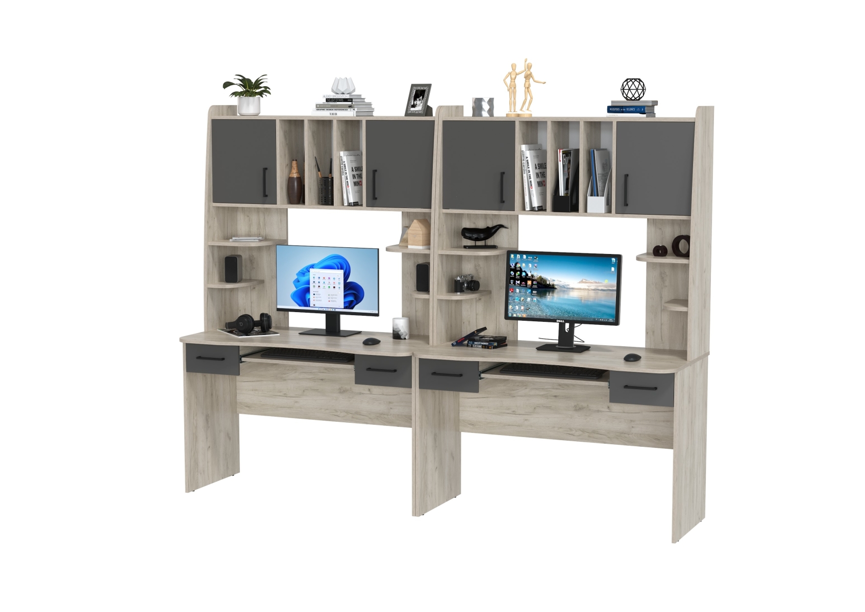 Компьютерные столы для двоих человек Бета. Цвет - дуб крафт серый/графит. Габариты - 240х60,5х183,5 см. Каждый стол - стильный и функциональный помощник, который эффективно организует рабочее пространство. Столешницы с мягко закруглёнными краями.