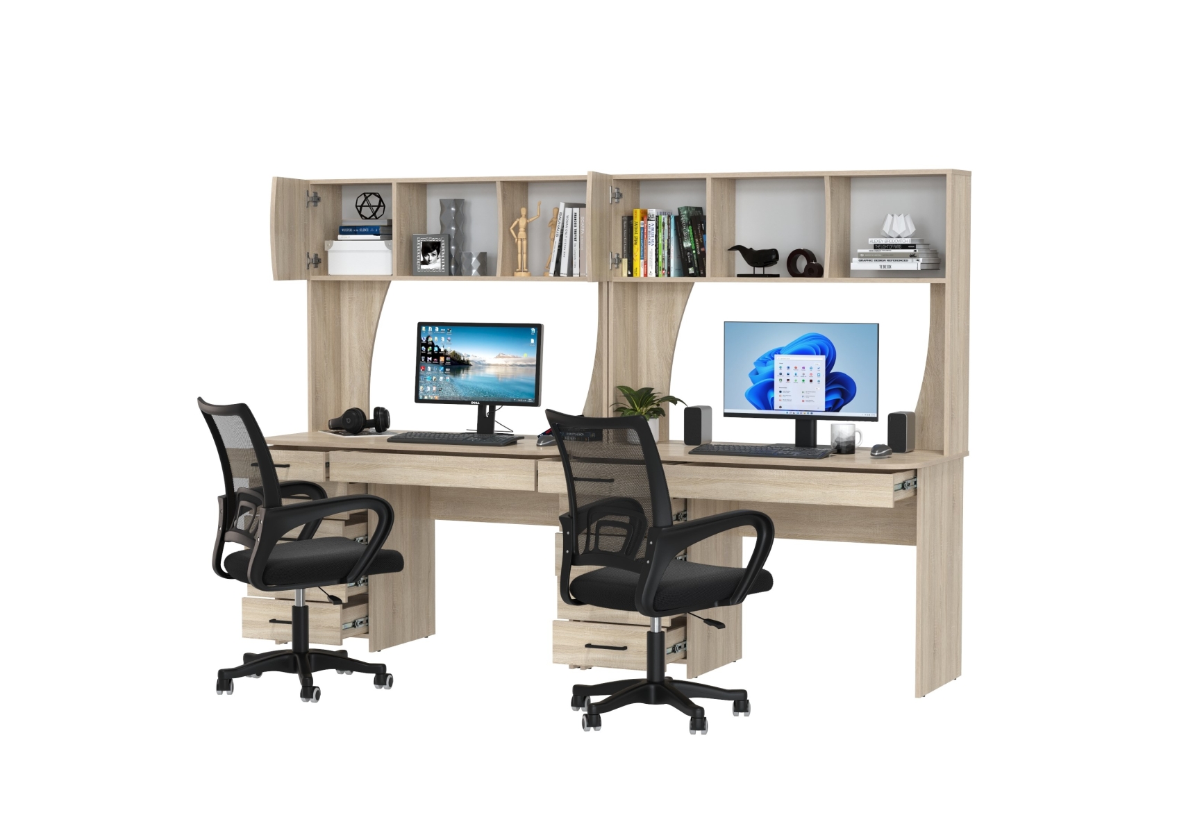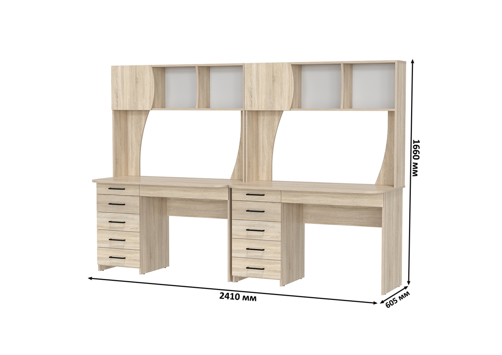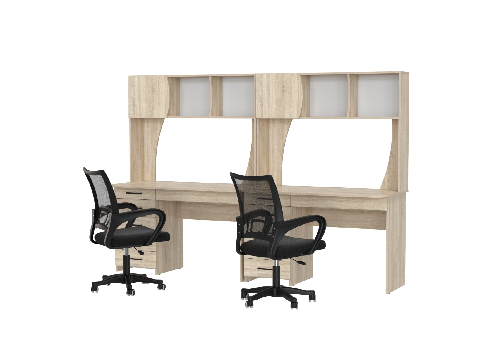 Комплект из двух рабочих столов Сигма и двух компьютерных кресел чёрных. Цвет - дуб сонома. Габариты - 241х60,5х166 см. Отличное решение для организации удобного рабочего пространства для двоих человек, будь то дома, в офисе или в учебной зоне.