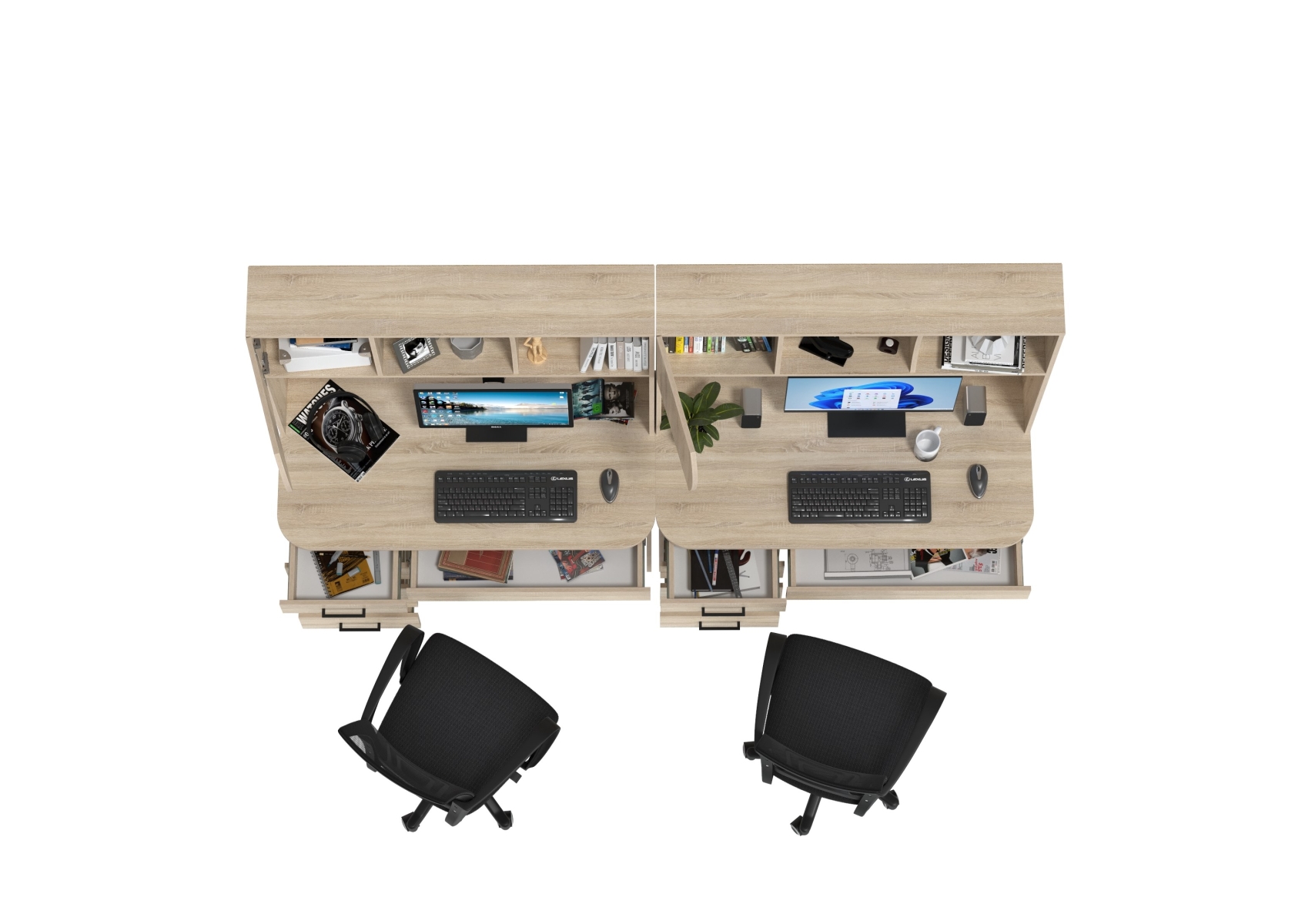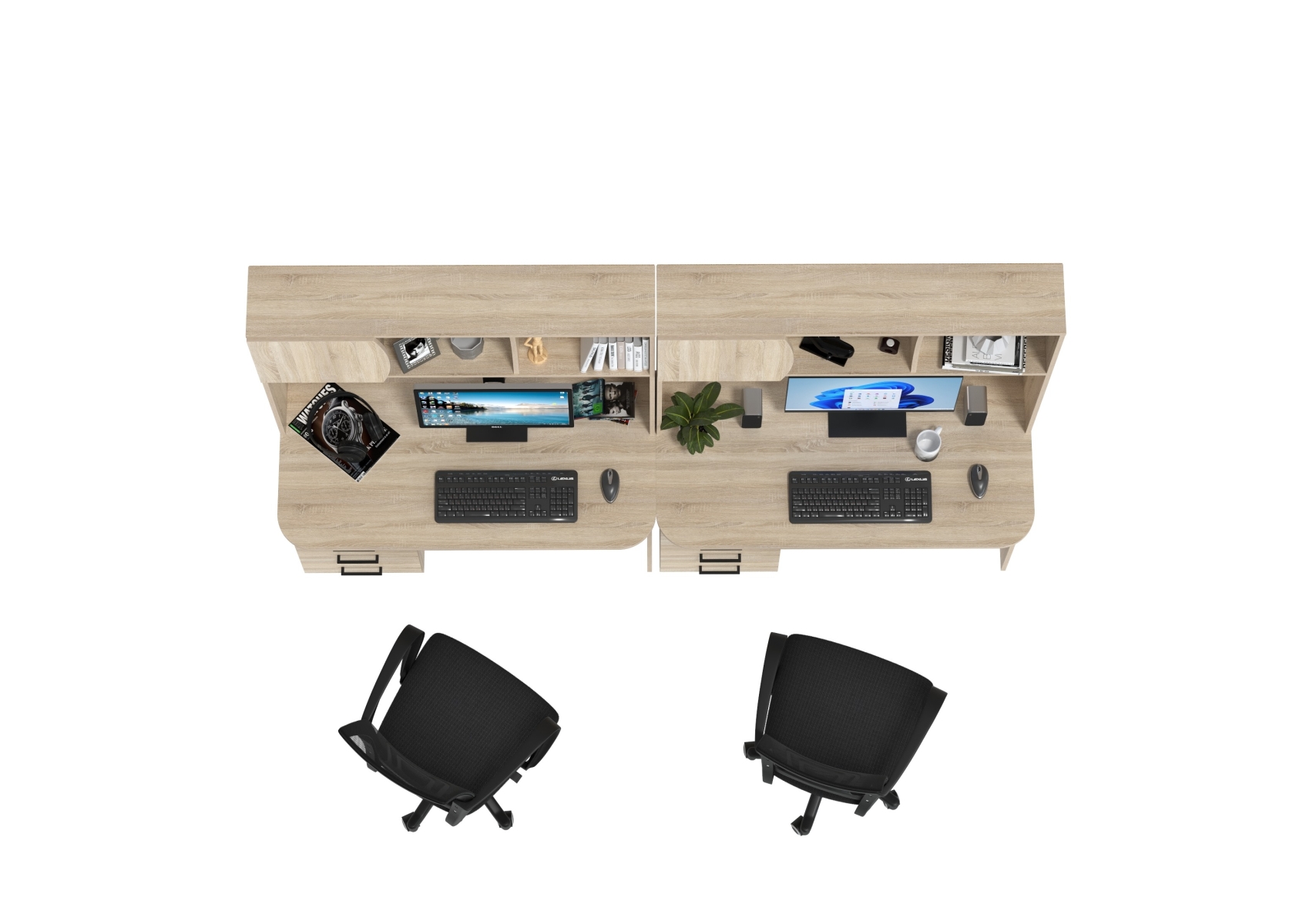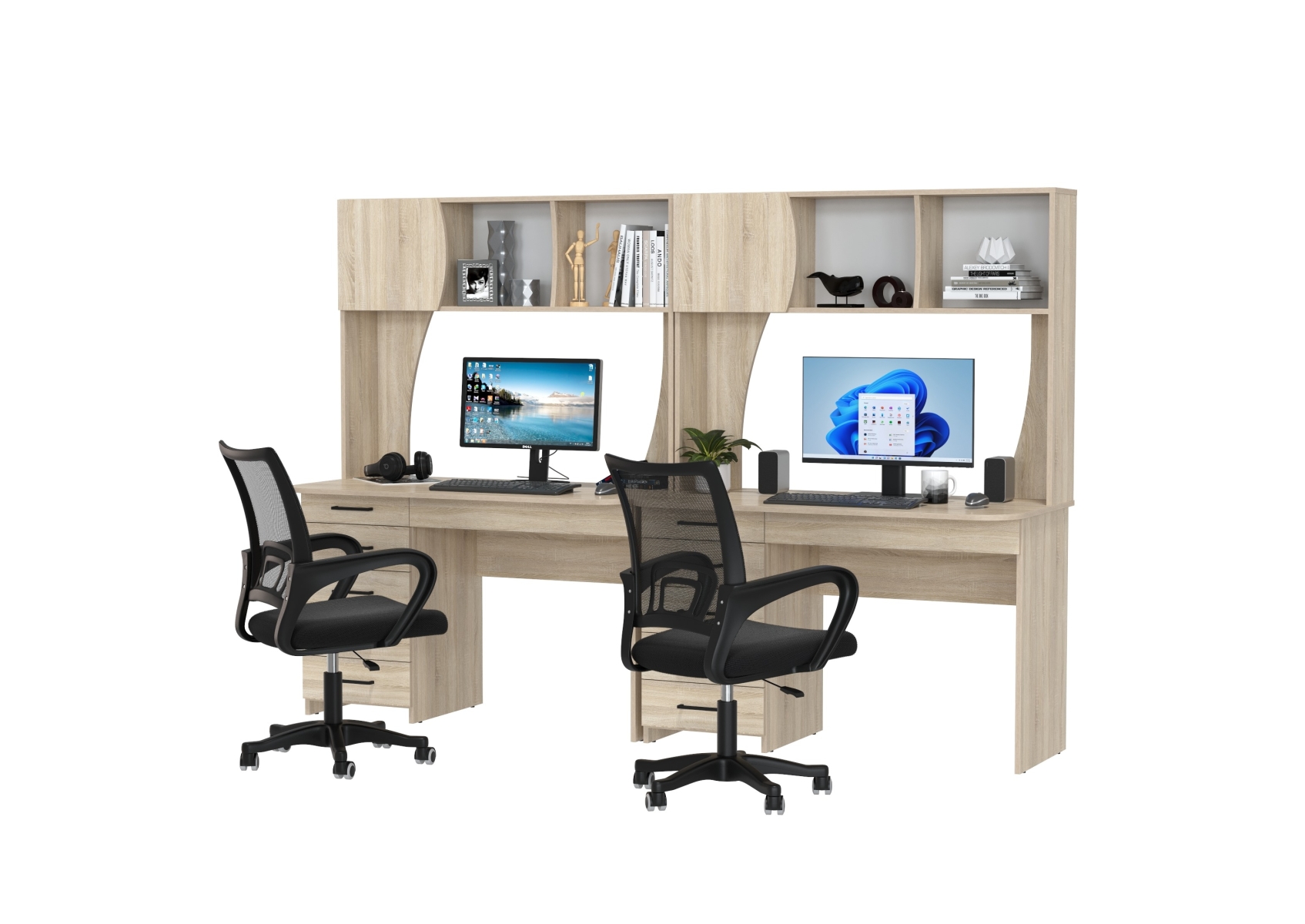 Комплект из двух рабочих столов Сигма и двух компьютерных кресел чёрных. Цвет - дуб сонома. Габариты - 241х60,5х166 см. Отличное решение для организации удобного рабочего пространства для двоих человек, будь то дома, в офисе или в учебной зоне.