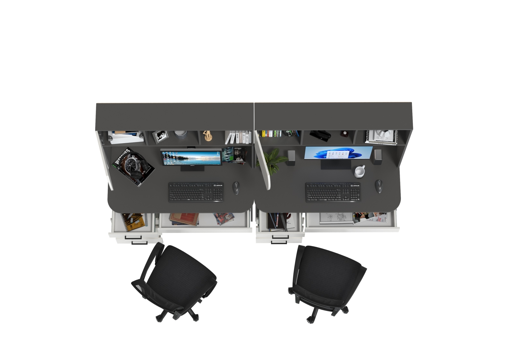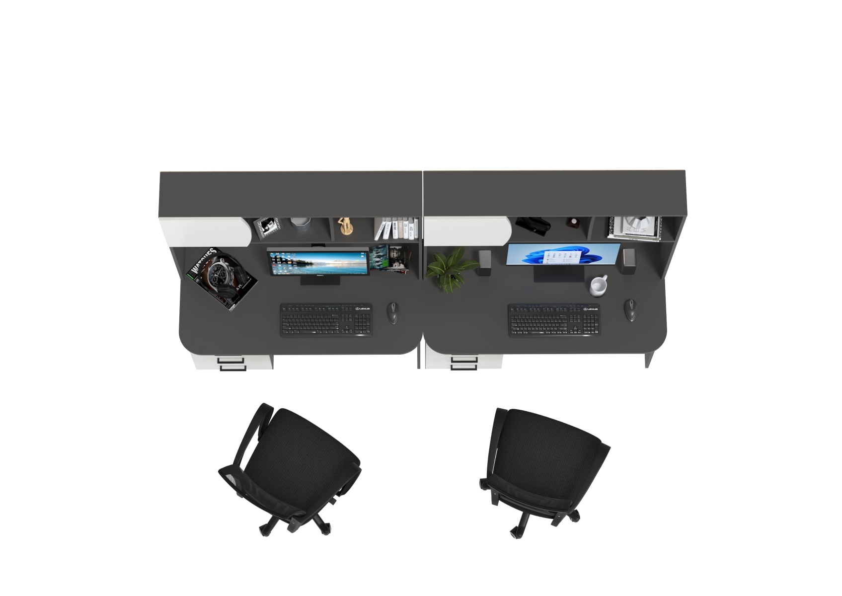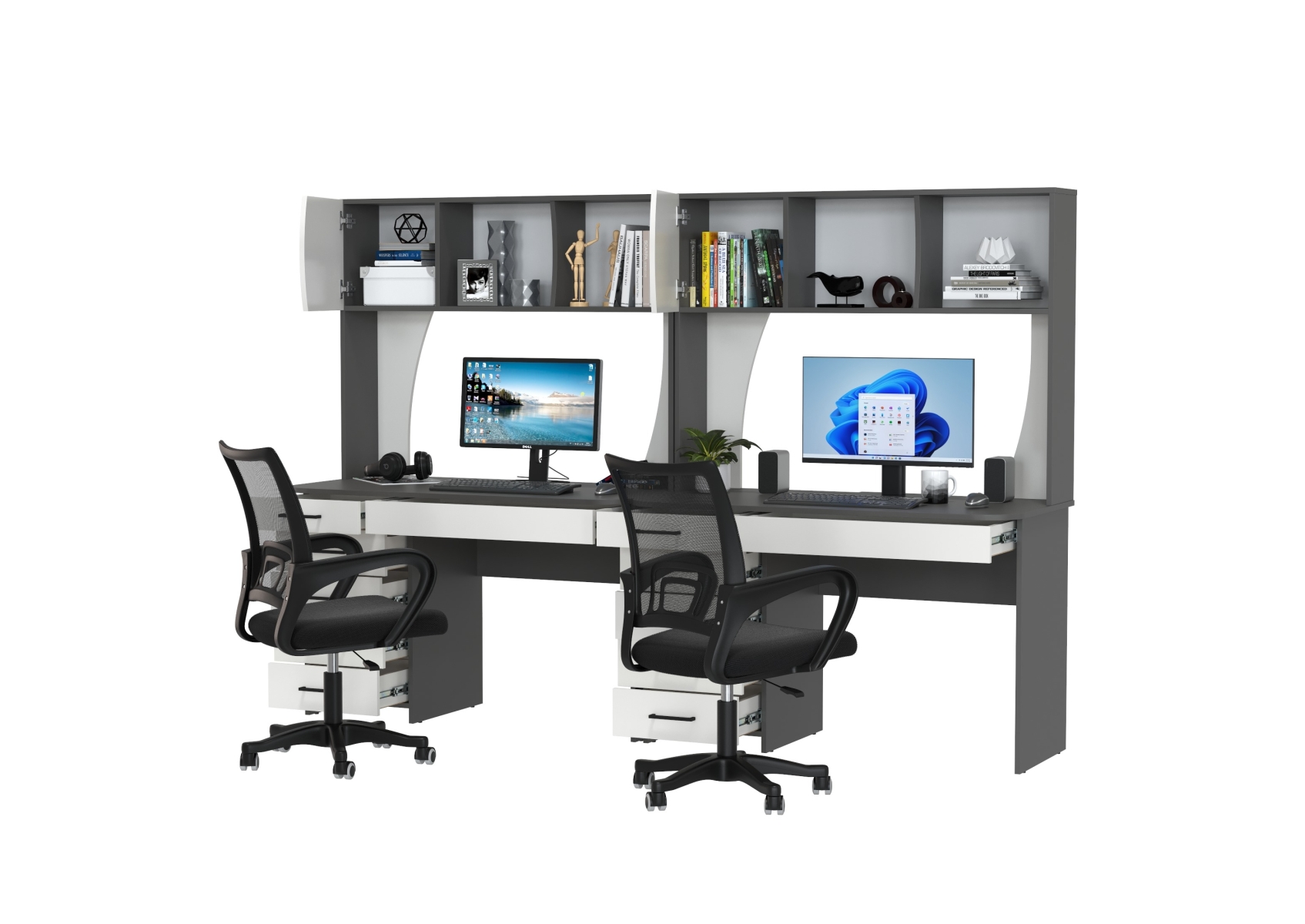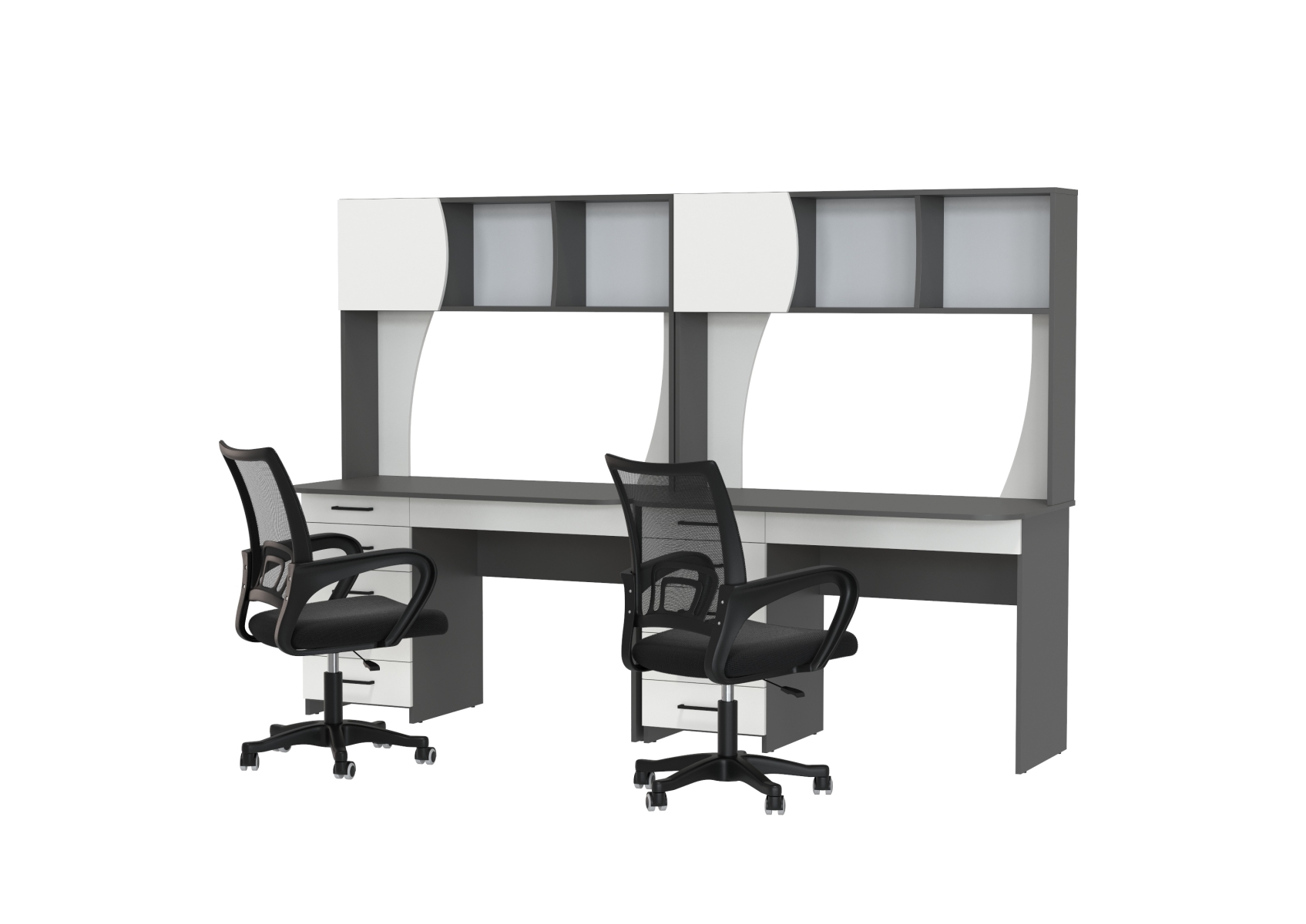 Комплект из двух рабочих столов Сигма и двух компьютерных кресел чёрных. Цвет - графит/белый. Габариты - 241х60,5х166 см. Отличное решение для организации удобного рабочего пространства для двоих человек, будь то дома, в офисе или в учебной зоне.