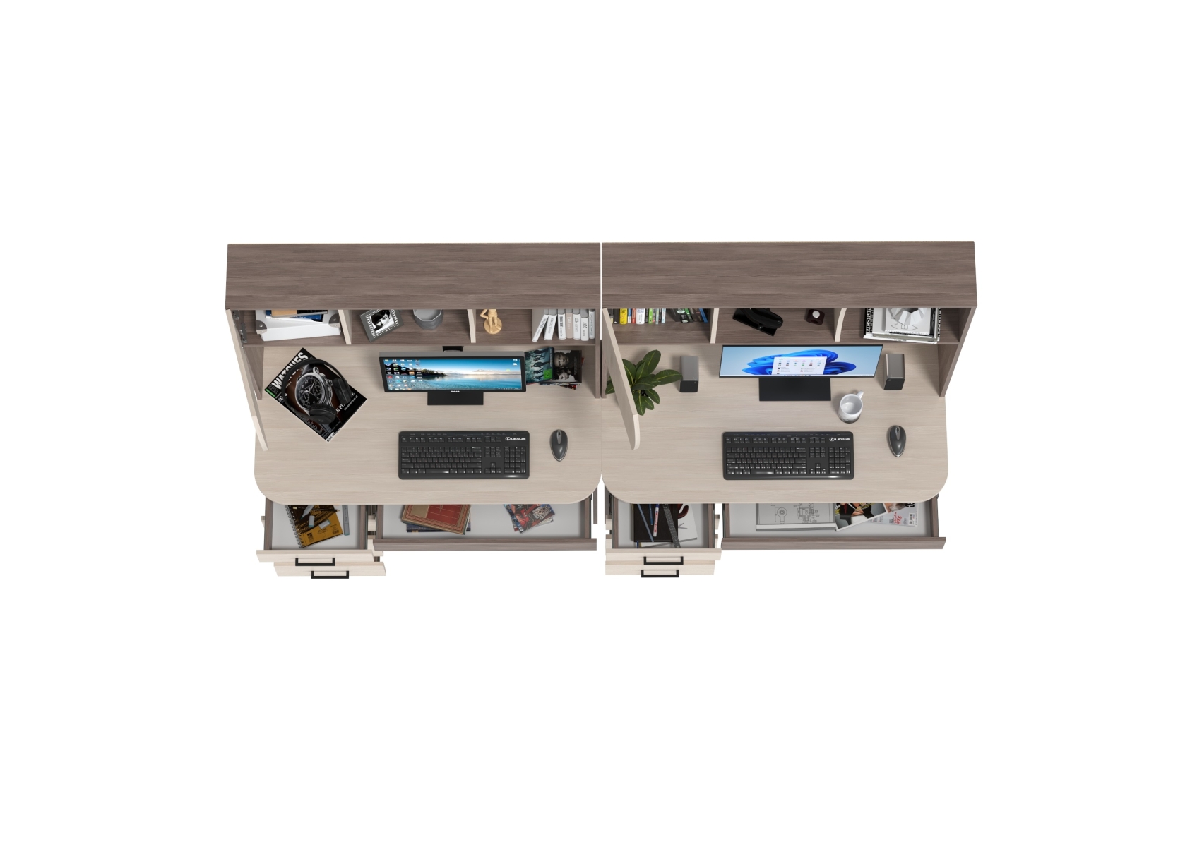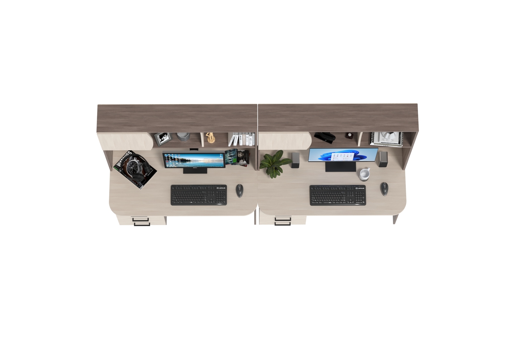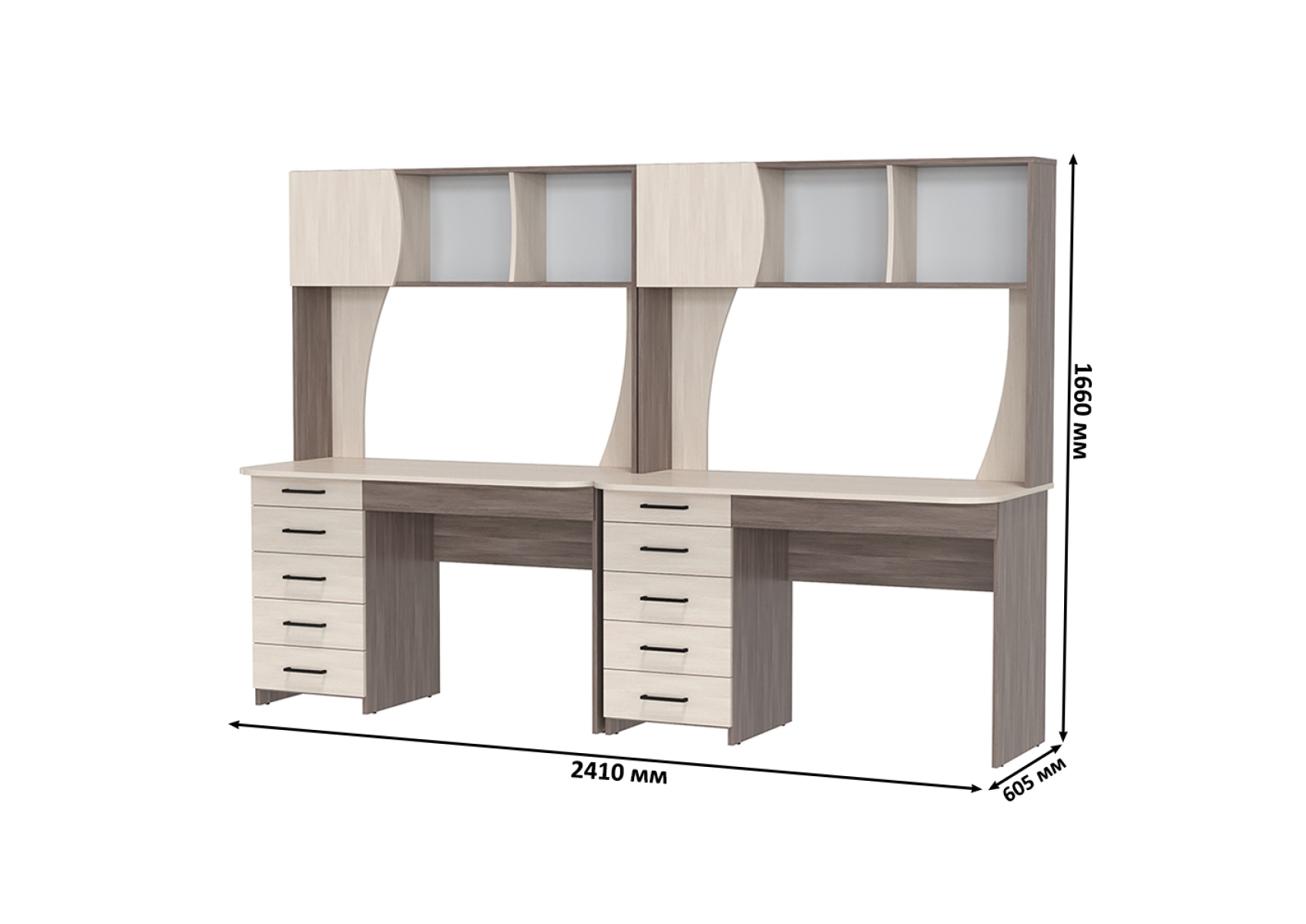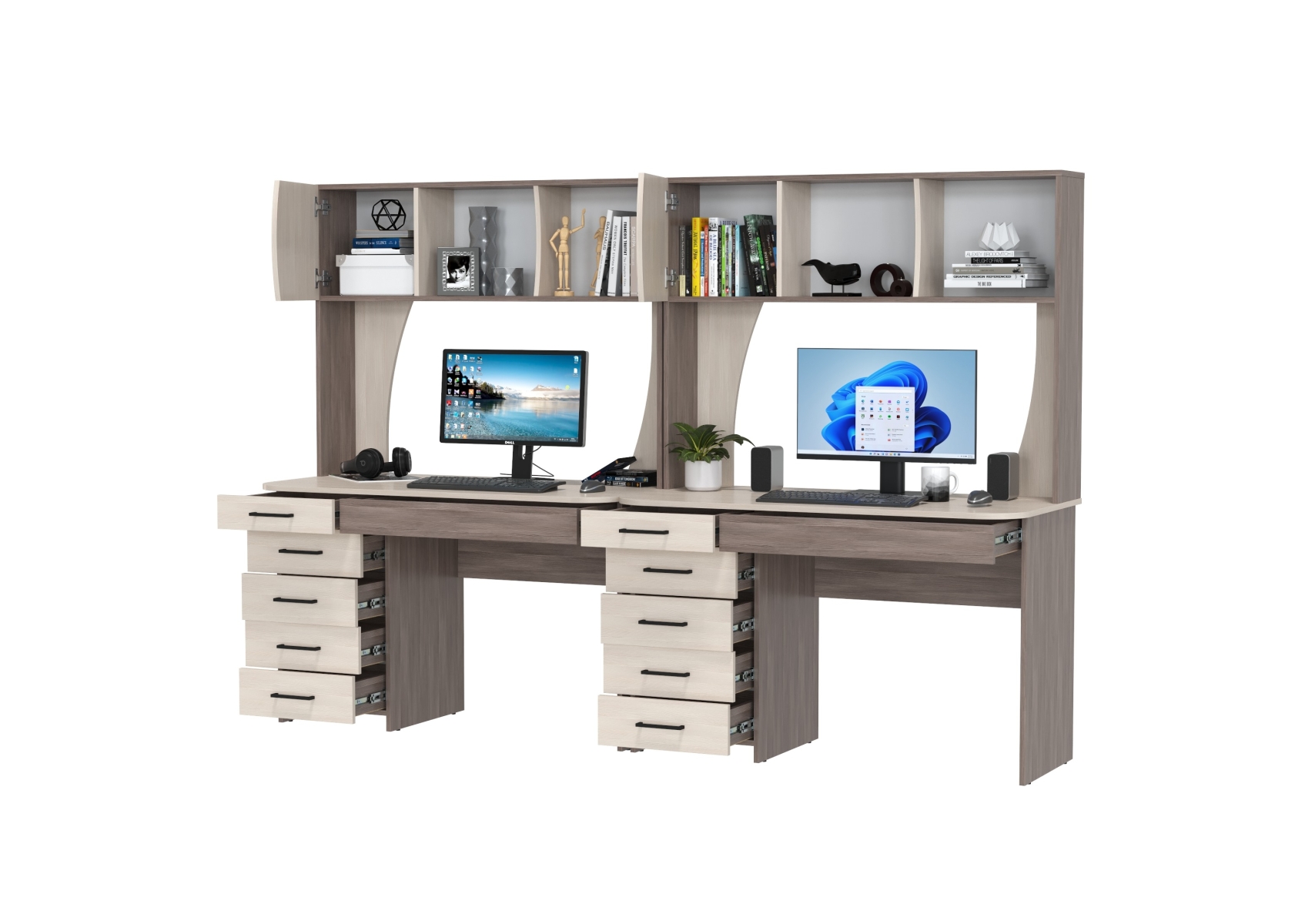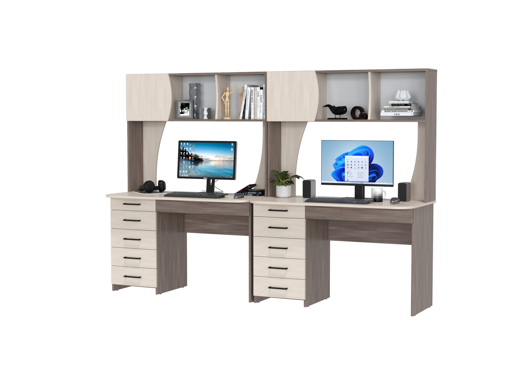 Два стола рабочих Сигма для двоих. Цвет - бодега тёмный/бодега светлый. Габариты - 241х60,5х166 см. Практичные и функциональные столы подойдут как взрослым, так и детям. Каждый стол оснащён широкой столешницей, вместительной надстройкой и тумбой с ящиками, что делает его удобным и организованным.