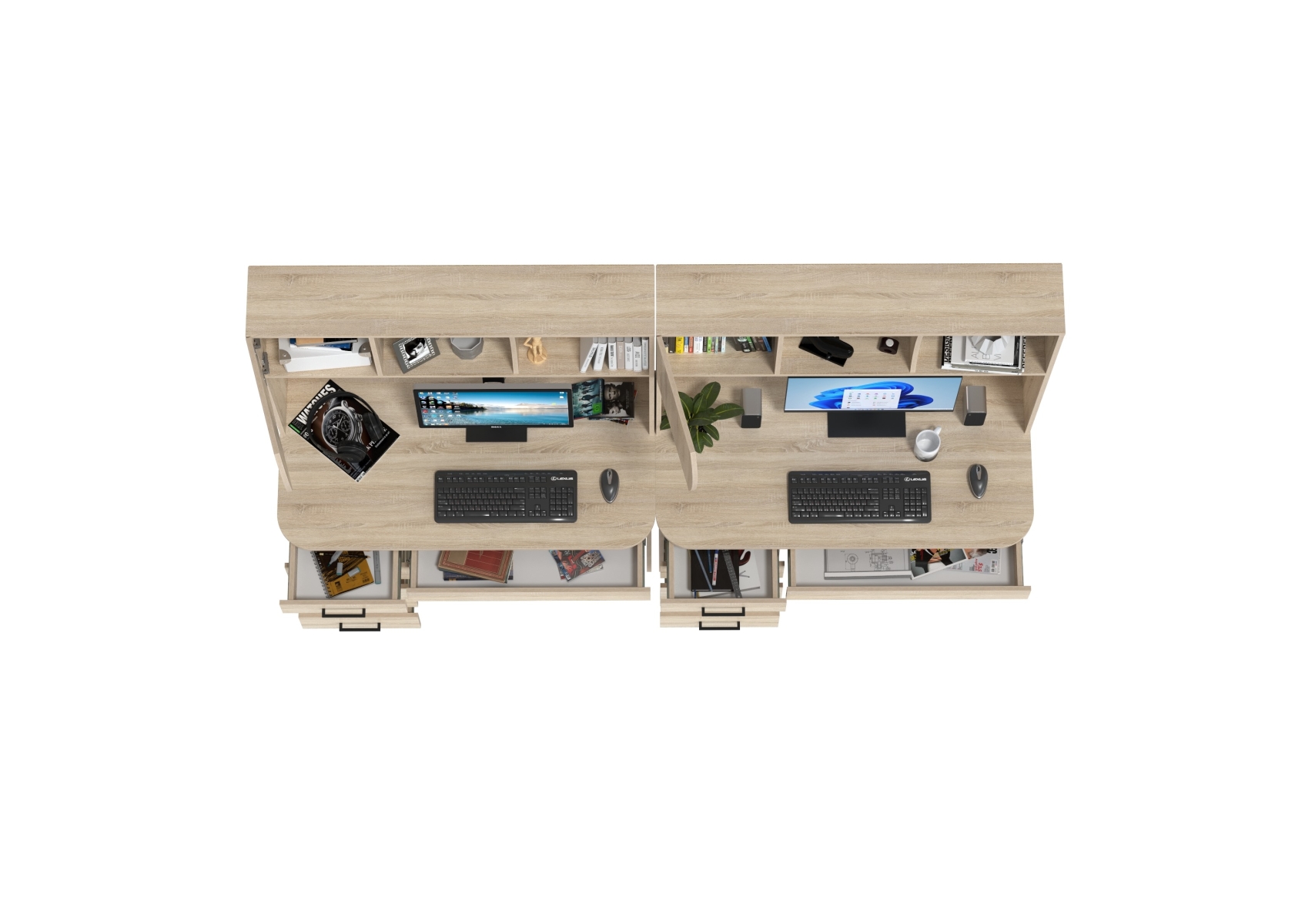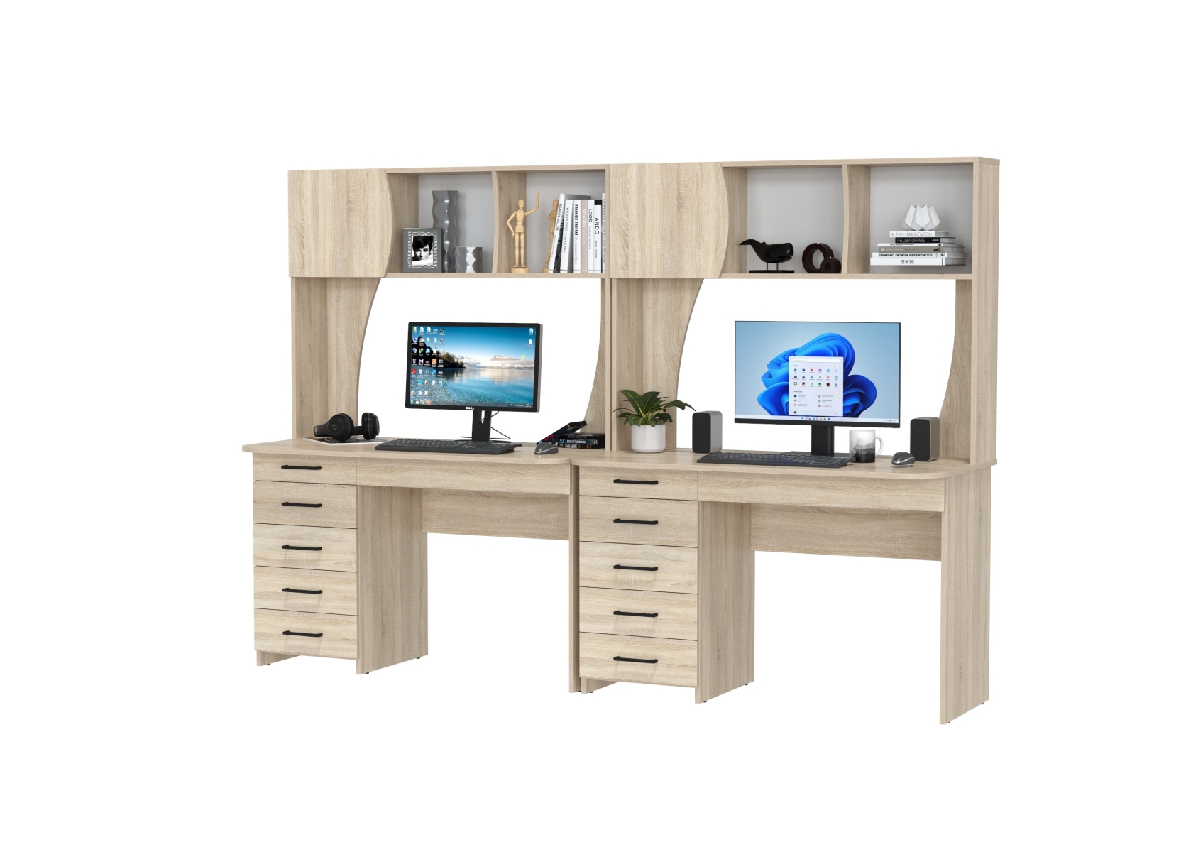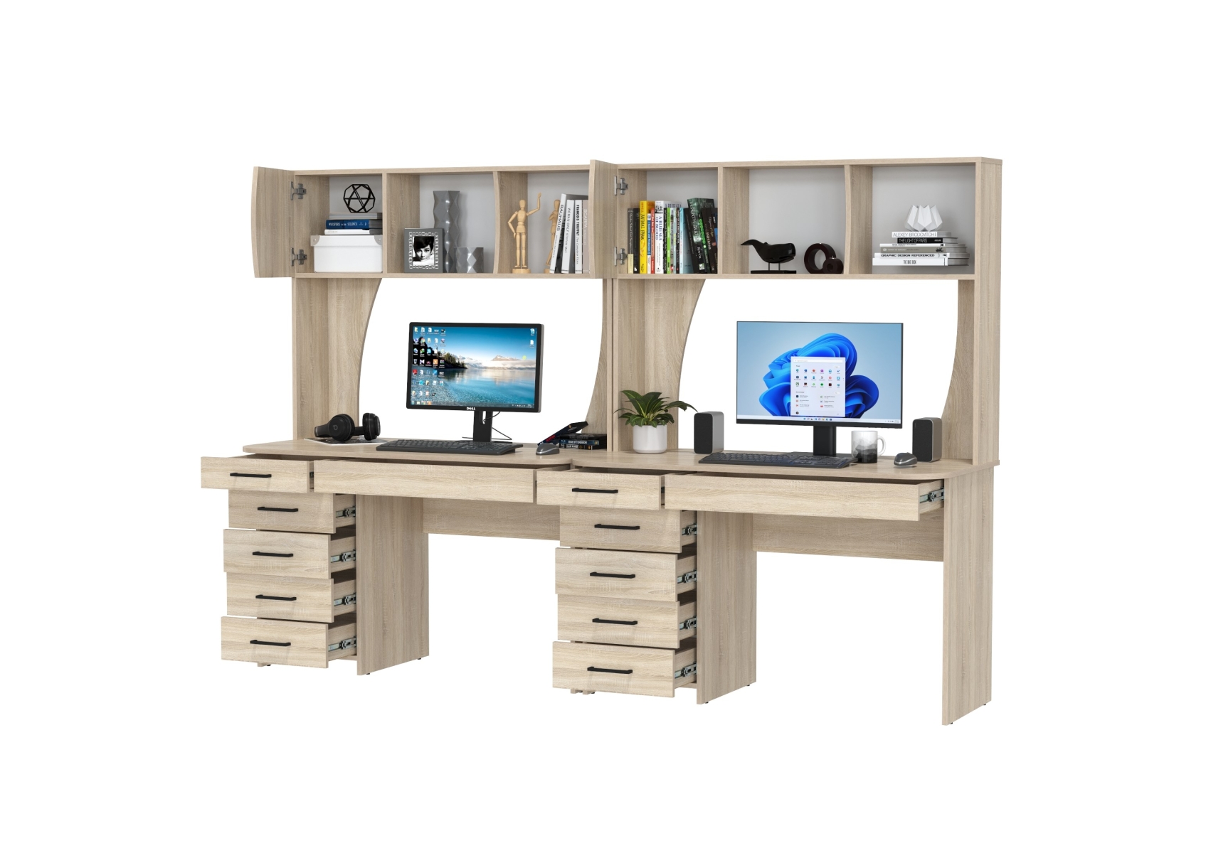 Два стола рабочих Сигма для двоих. Цвет - дуб сонома. Габариты - 241х60,5х166 см. Практичные и функциональные столы подойдут как взрослым, так и детям. Каждый стол оснащён широкой столешницей, вместительной надстройкой и тумбой с ящиками, что делает его удобным и организованным.