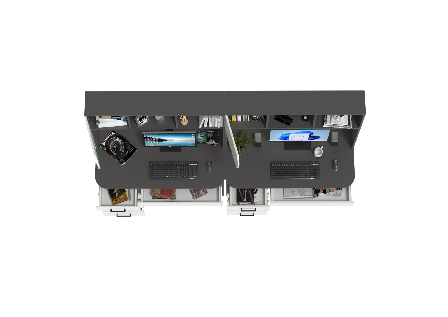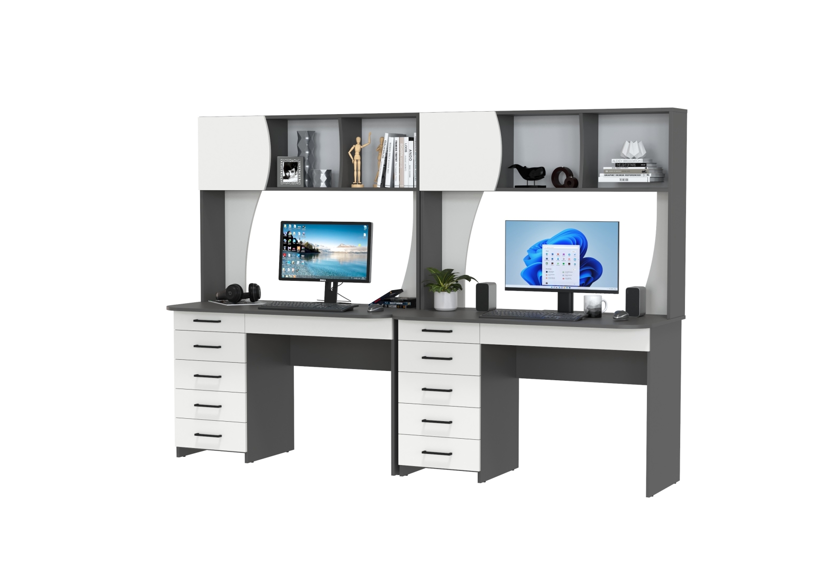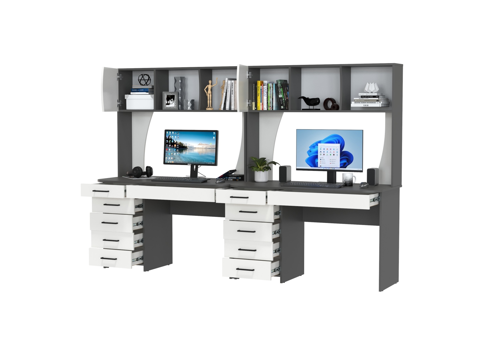 Два стола рабочих Сигма для двоих. Цвет - графит/белый. Габариты - 241х60,5х166 см. Практичные и функциональные столы подойдут как взрослым, так и детям. Каждый стол оснащён широкой столешницей, вместительной надстройкой и тумбой с ящиками, что делает его удобным и организованным.
