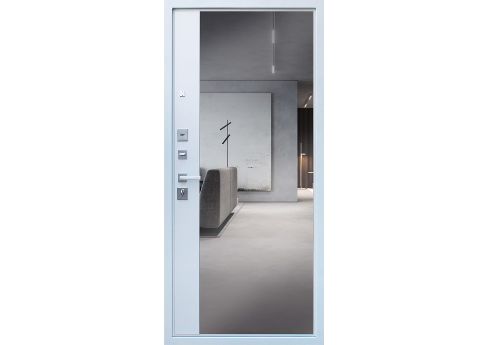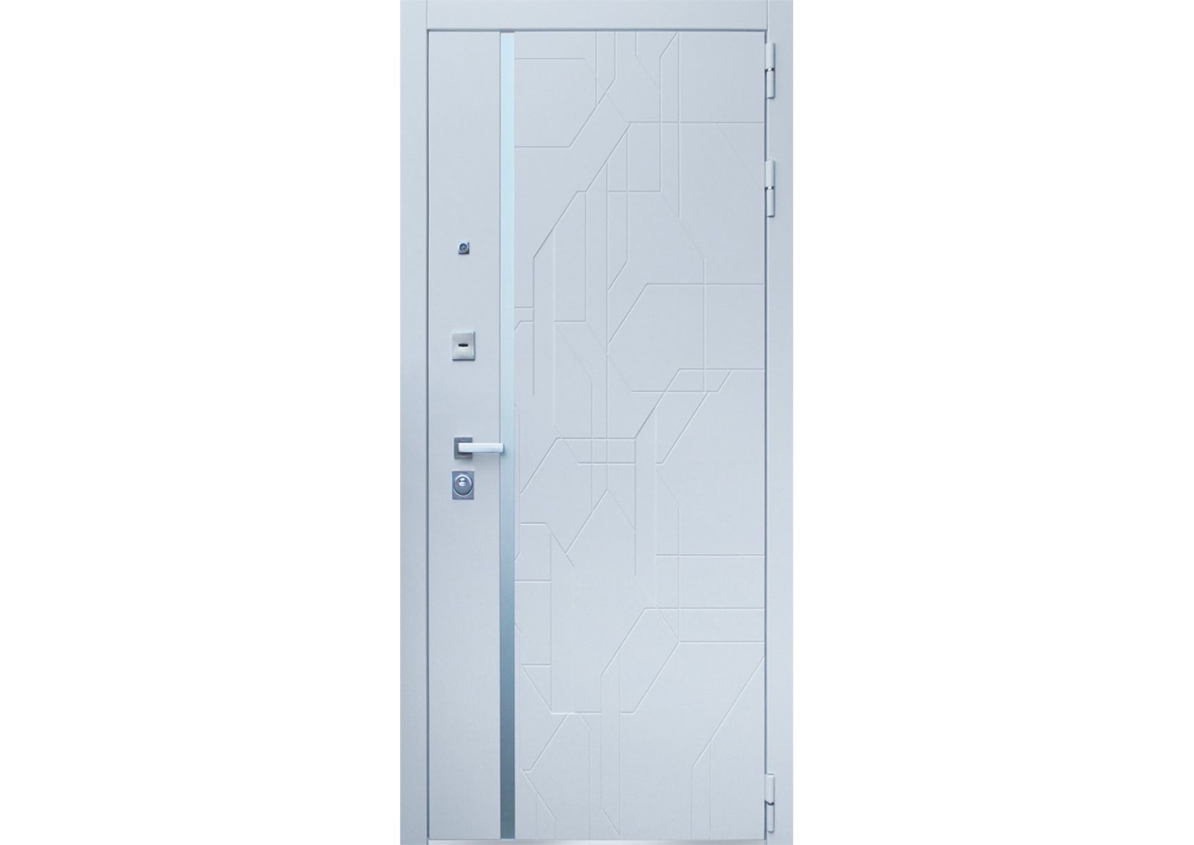 Экошпон .Наружный лист металла 1,5 мм. Дизайн панели ФЛС СО ВСТАВКОЙ МАТОВАЯ БЕЛАЯ ЛАКОБЕЛЬ Объемная фрезеровка МДФ 10 мм, цвет «Матовый белый»; Наличник МДФ 80 мм