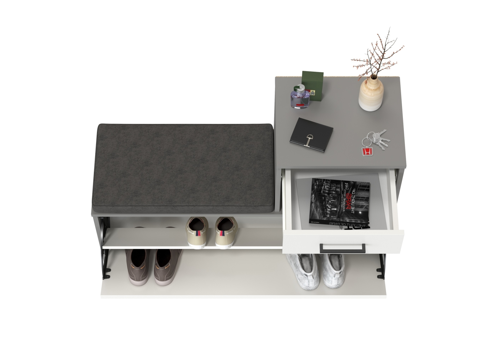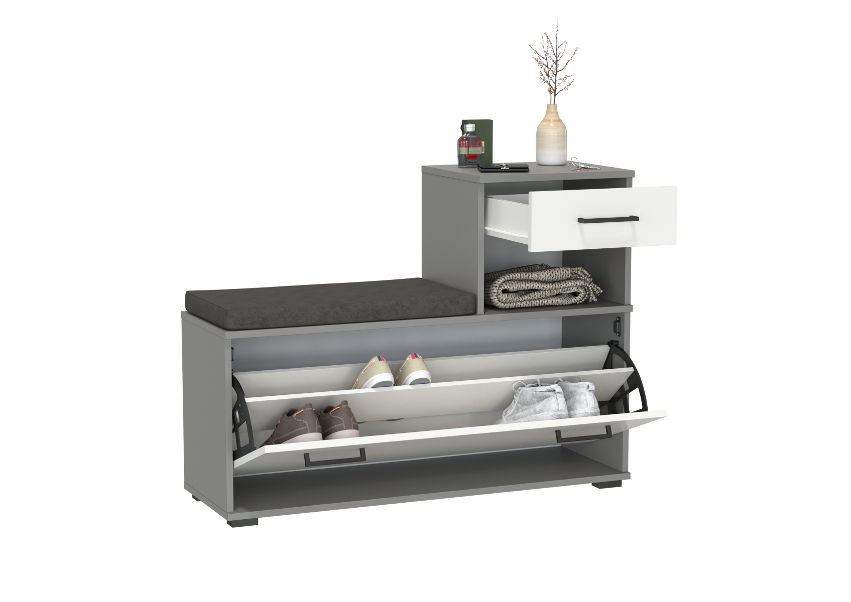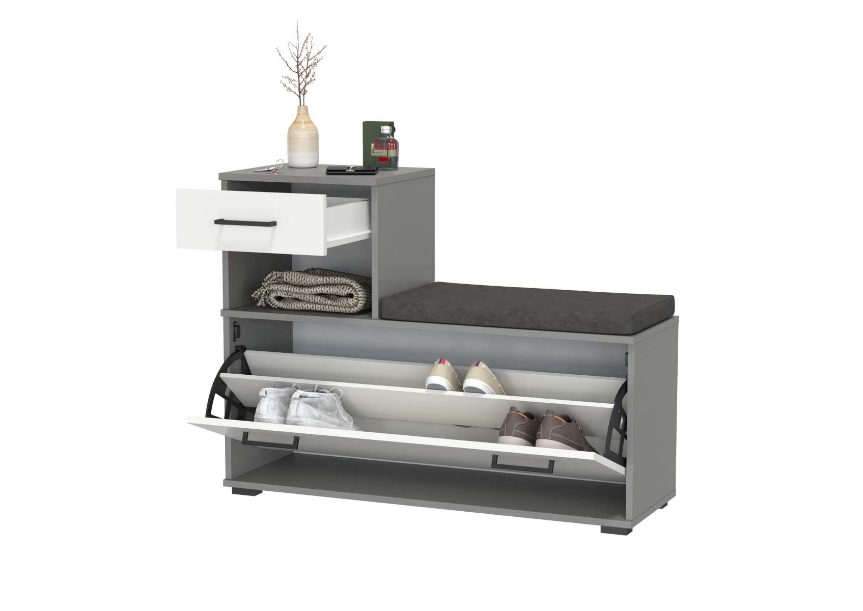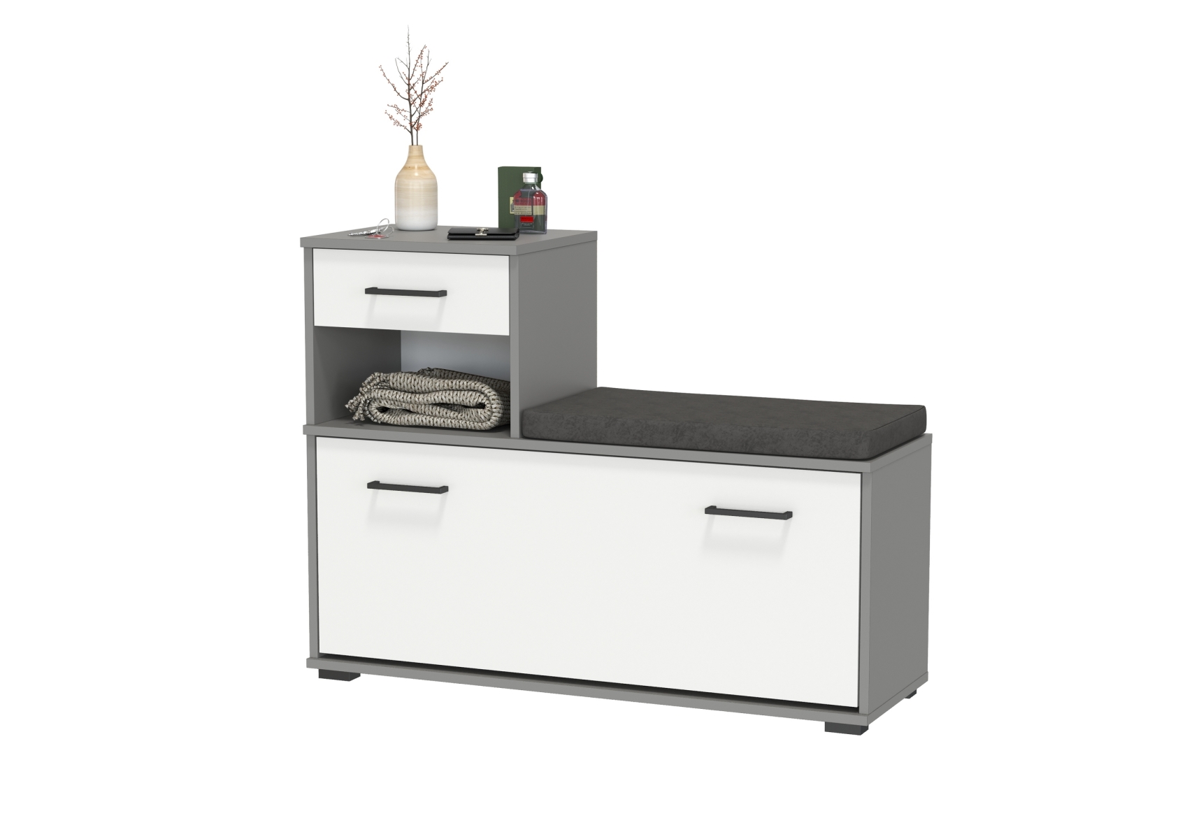 Тумба под обувь Лира 2-0714. Цвет - графит/белый. Габариты (ШхГхВ) 100х33х75,5 см. Универсальная сборка. За удобной откидной дверкой, разместит до восьми пар сезонной обуви. Мягкое сидение позволяет с комфортом обуть малыша, выдвижной ящичек - легко найти ключницу.