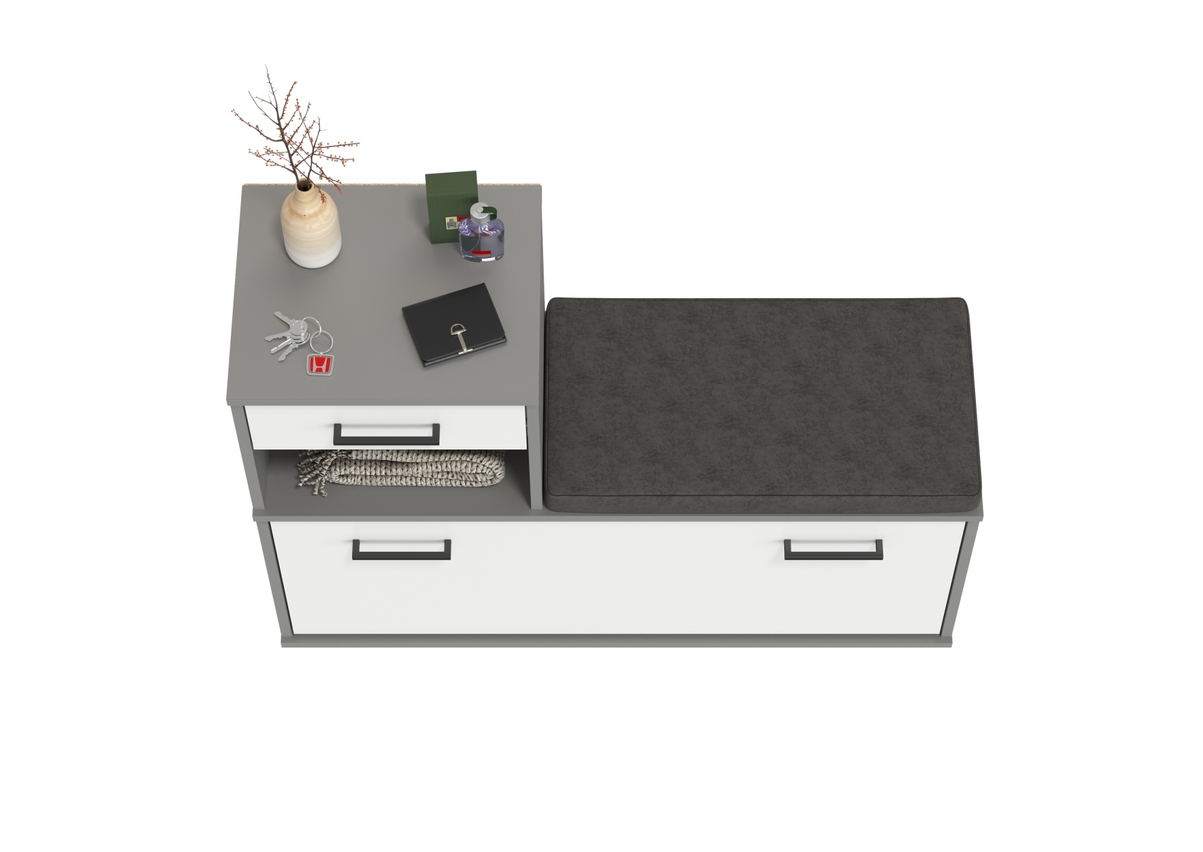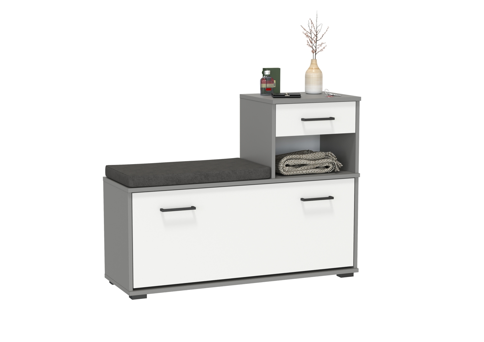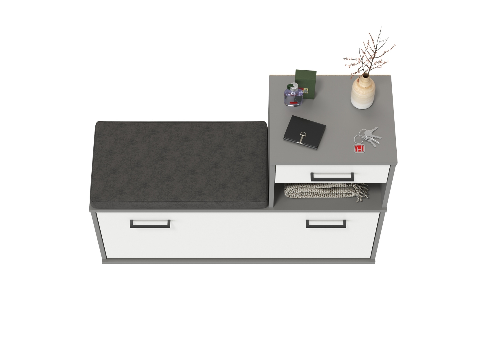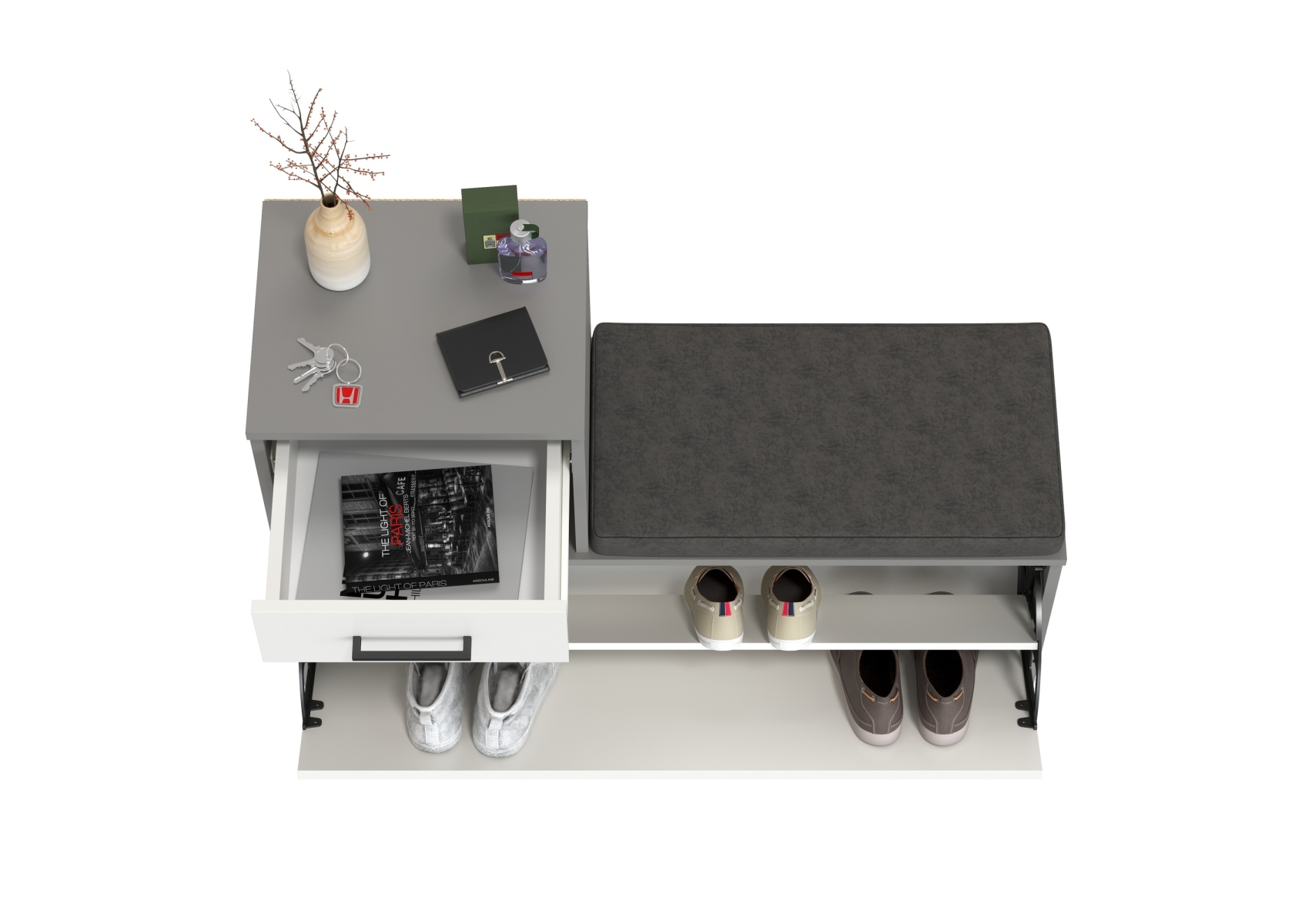 Тумба под обувь Лира 2-0714. Цвет - графит/белый. Габариты (ШхГхВ) 100х33х75,5 см. Универсальная сборка. За удобной откидной дверкой, разместит до восьми пар сезонной обуви. Мягкое сидение позволяет с комфортом обуть малыша, выдвижной ящичек - легко найти ключницу.
