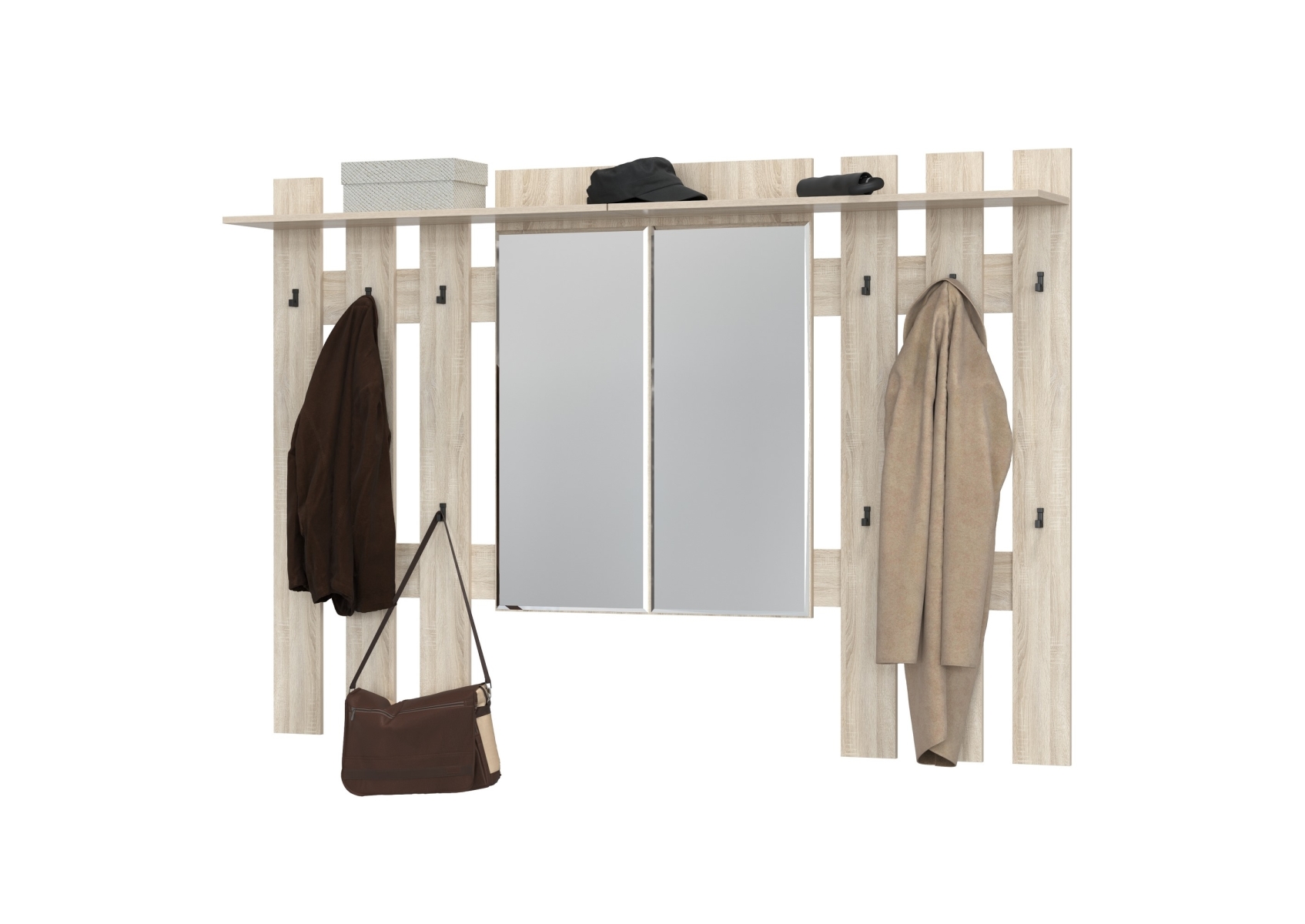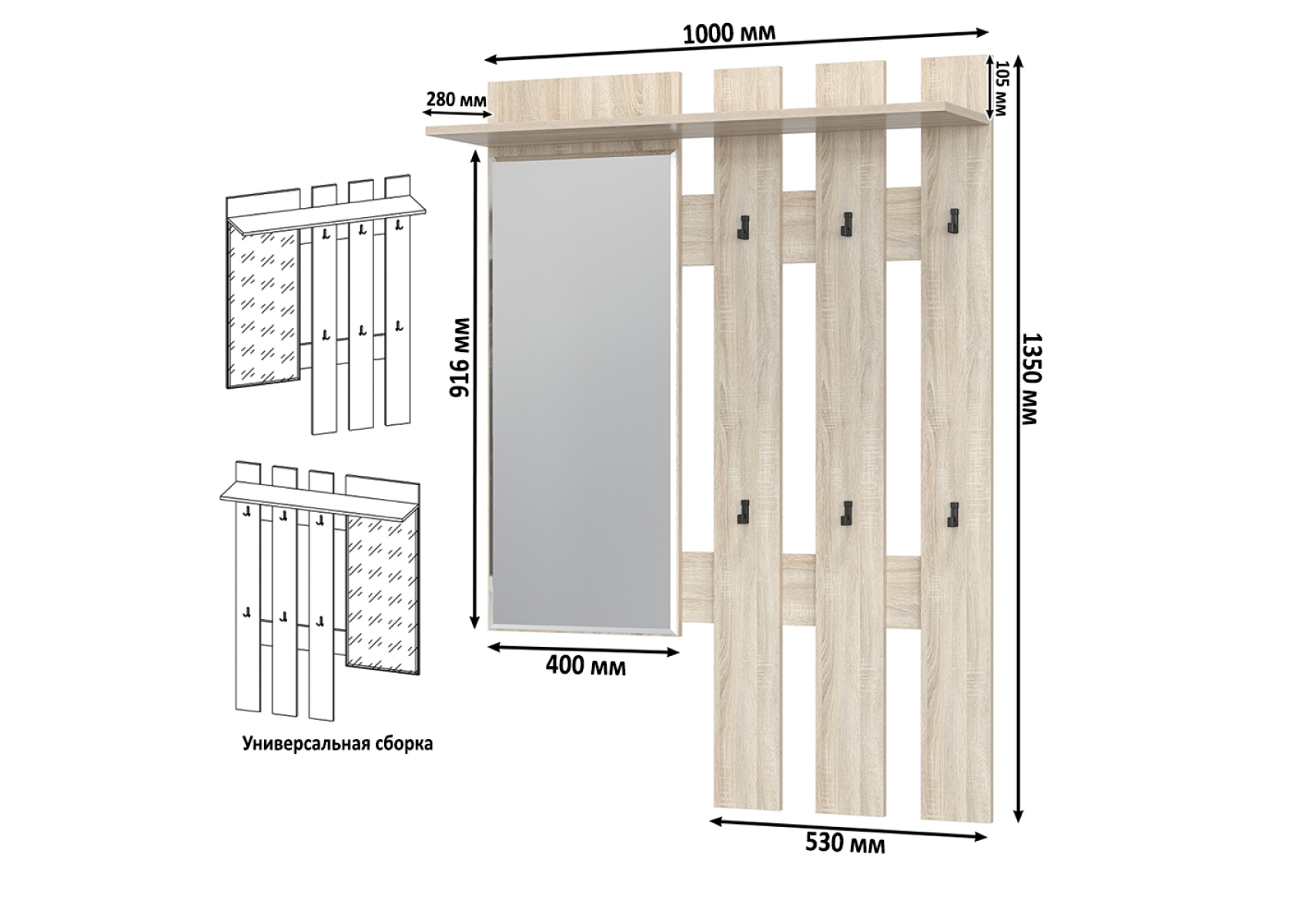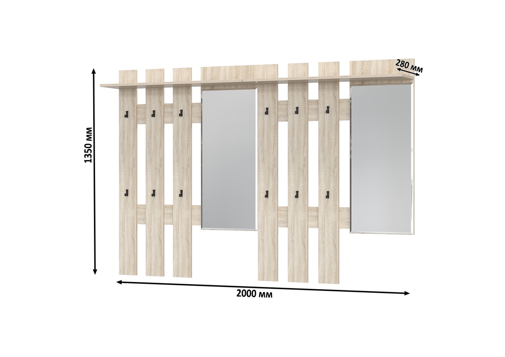 Лира ГК 2-3814+2-3814дубсон Вешалка с зеркалом, цвет дуб сонома, ШхГхВ 200х28х135 см., универсальная сборка