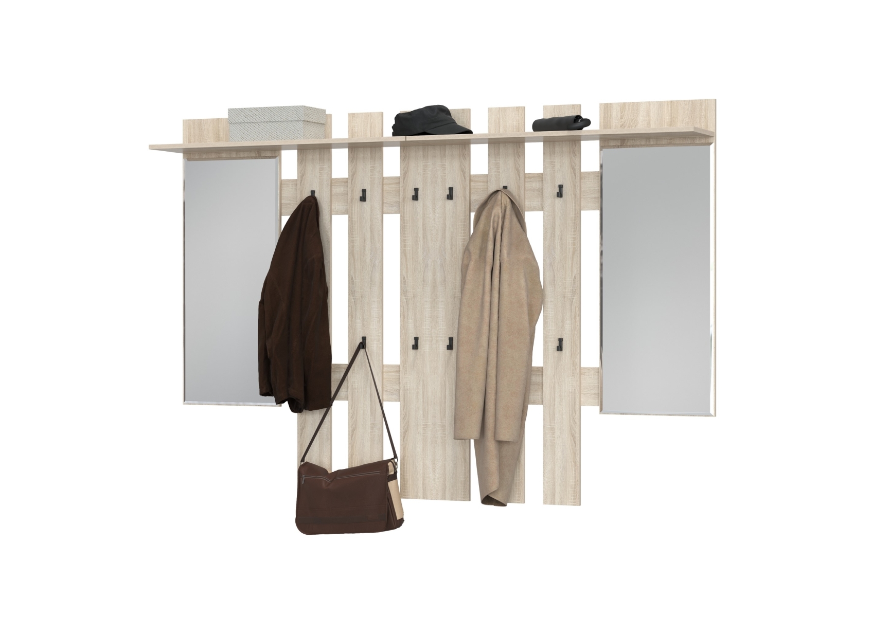 Две вешалки для верхней одежды с зеркалом Лира 2-3814. Цвет - дуб сонома. Габариты (ШхГхВ) 200х28х135 см. Универсальная сборка. Универсальная сборка. В комплект входят две стильные вешалки с зеркалами, которые не только украсят ваш интерьер, но и обеспечат удобное хранение верхней одежды.