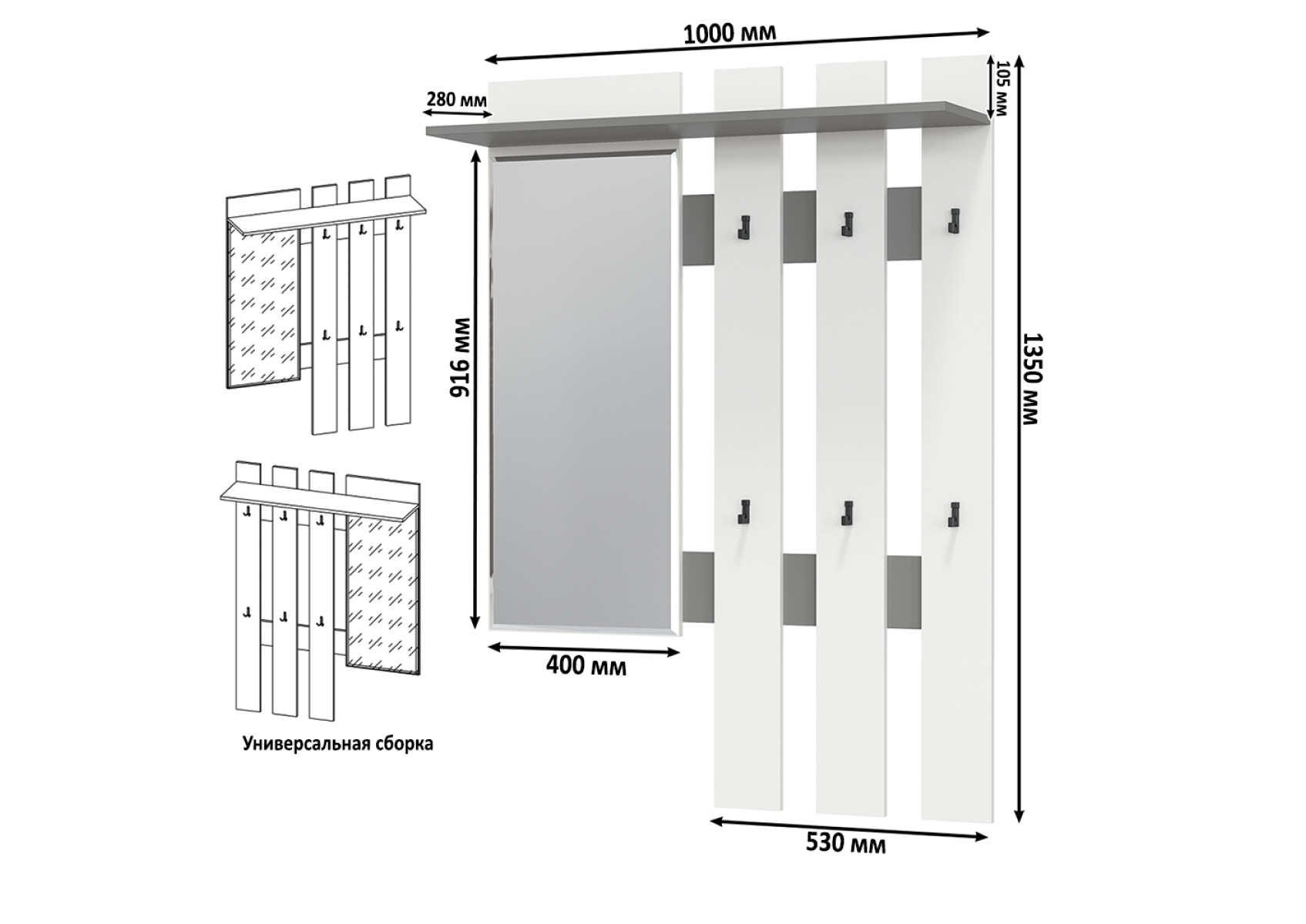 Вешалка с зеркалом Лира 2-3814. Цвет - графит/белый. Габариты (ШхГхВ) 100х28х135 см. Универсальная сборка. Удобная открытая вешалка - идеальный вариант хранения сезонной верхней одежды в ненастную погоду. Оборудована шестью дизайнерскими крючками в стиле минимализм, антресольной полкой для головных уборов и зеркалом.