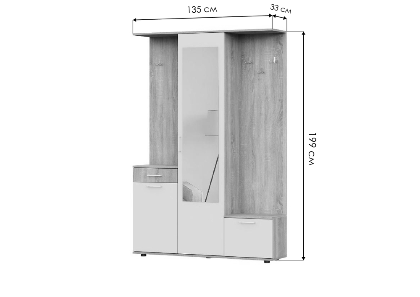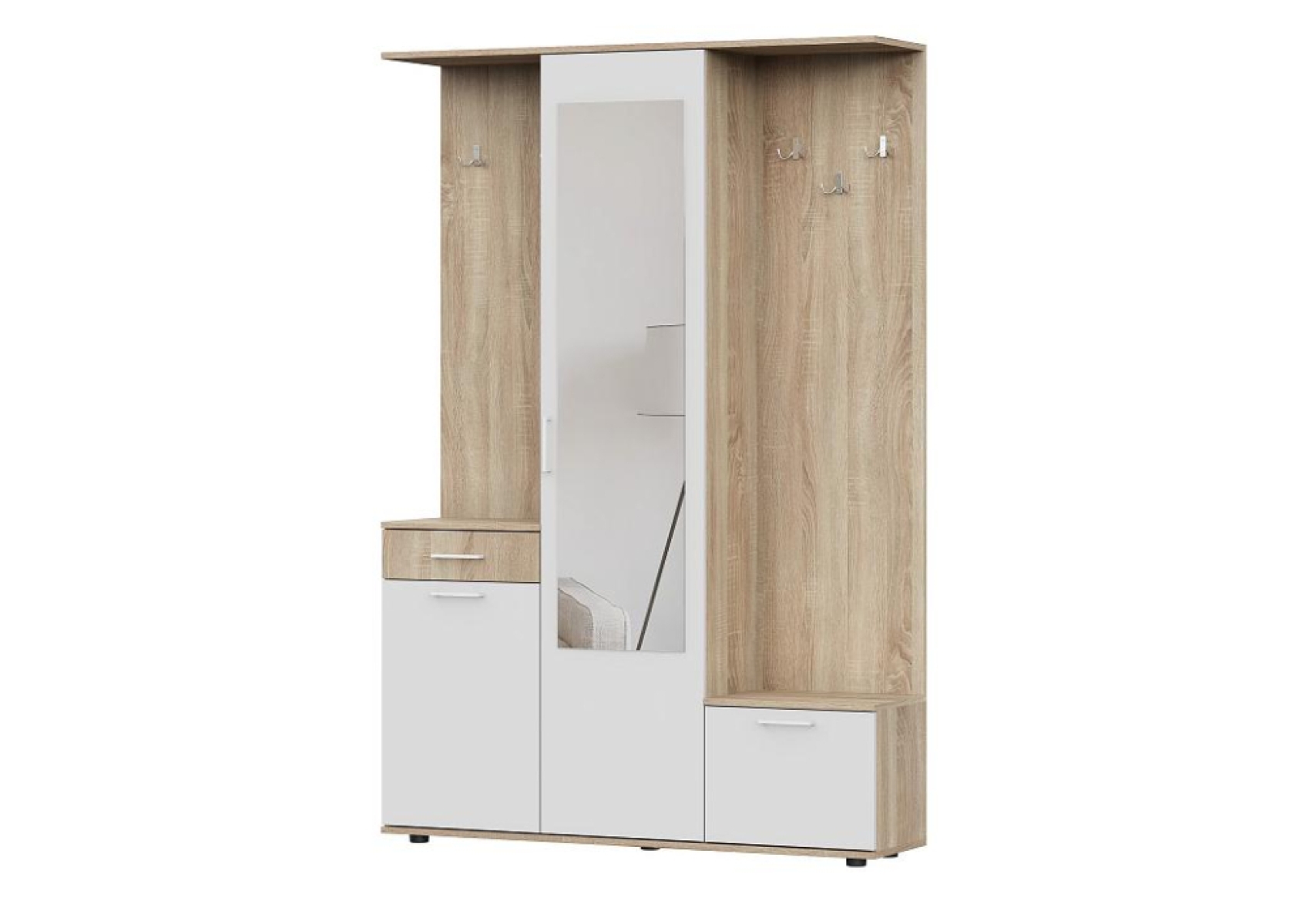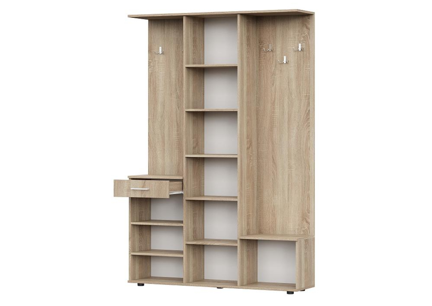 Готовая прихожая Пети - это функциональное и удобное решение для обустройства прихожей. Зеркало расположено на дверце шкафа, что позволяет сэкономить место в прихожей. В шкафу имеется 5 полок, два небольших шкафчика и выдвижной ящик, что обеспечивает достаточное пространство для хранения верхней одежды, обуви и других мелочей.