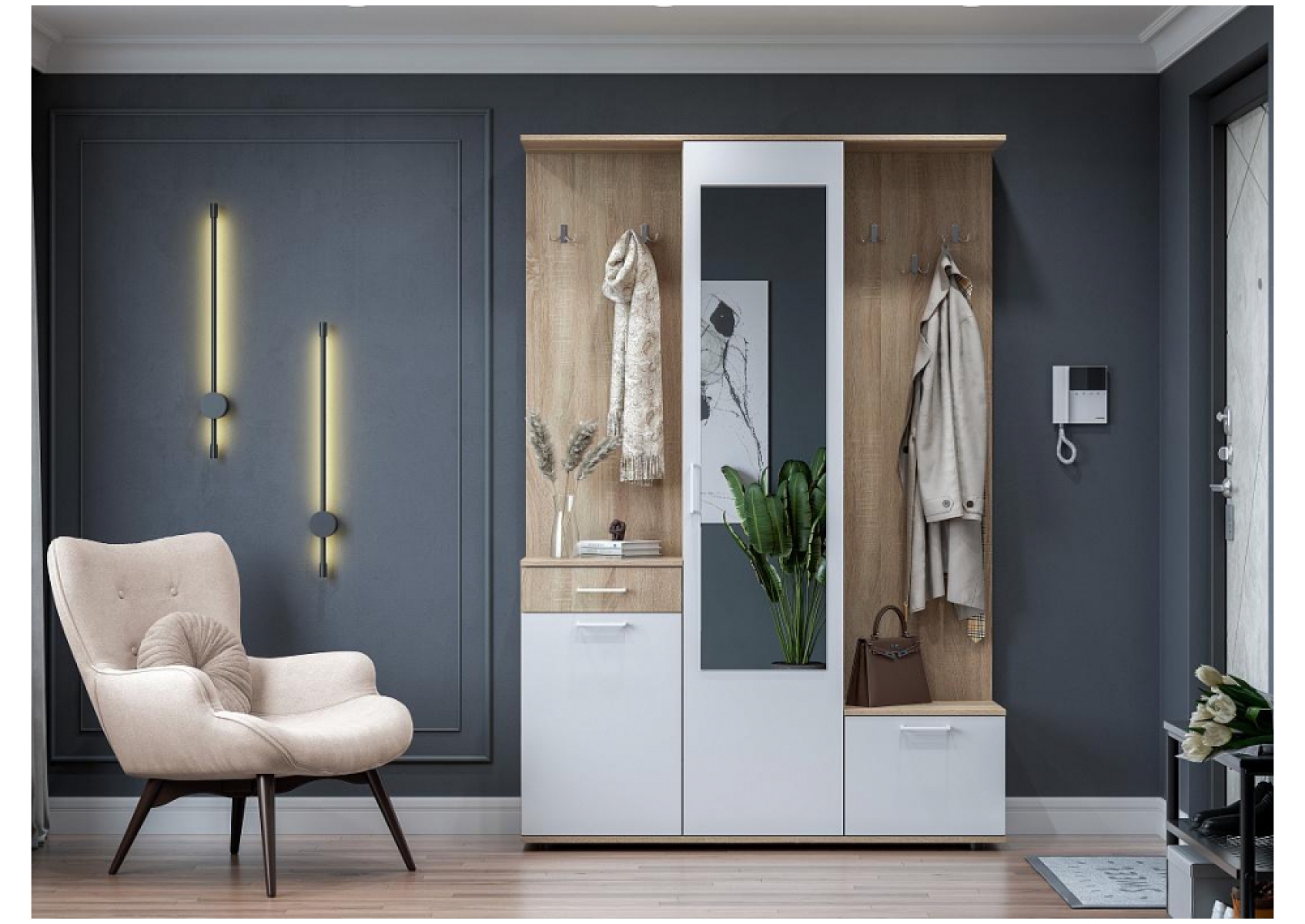Несколько крючков для верхней одежды размещены с обоих сторон прихожей, что делает ее удобной и практичной для хранения верхней одежды.