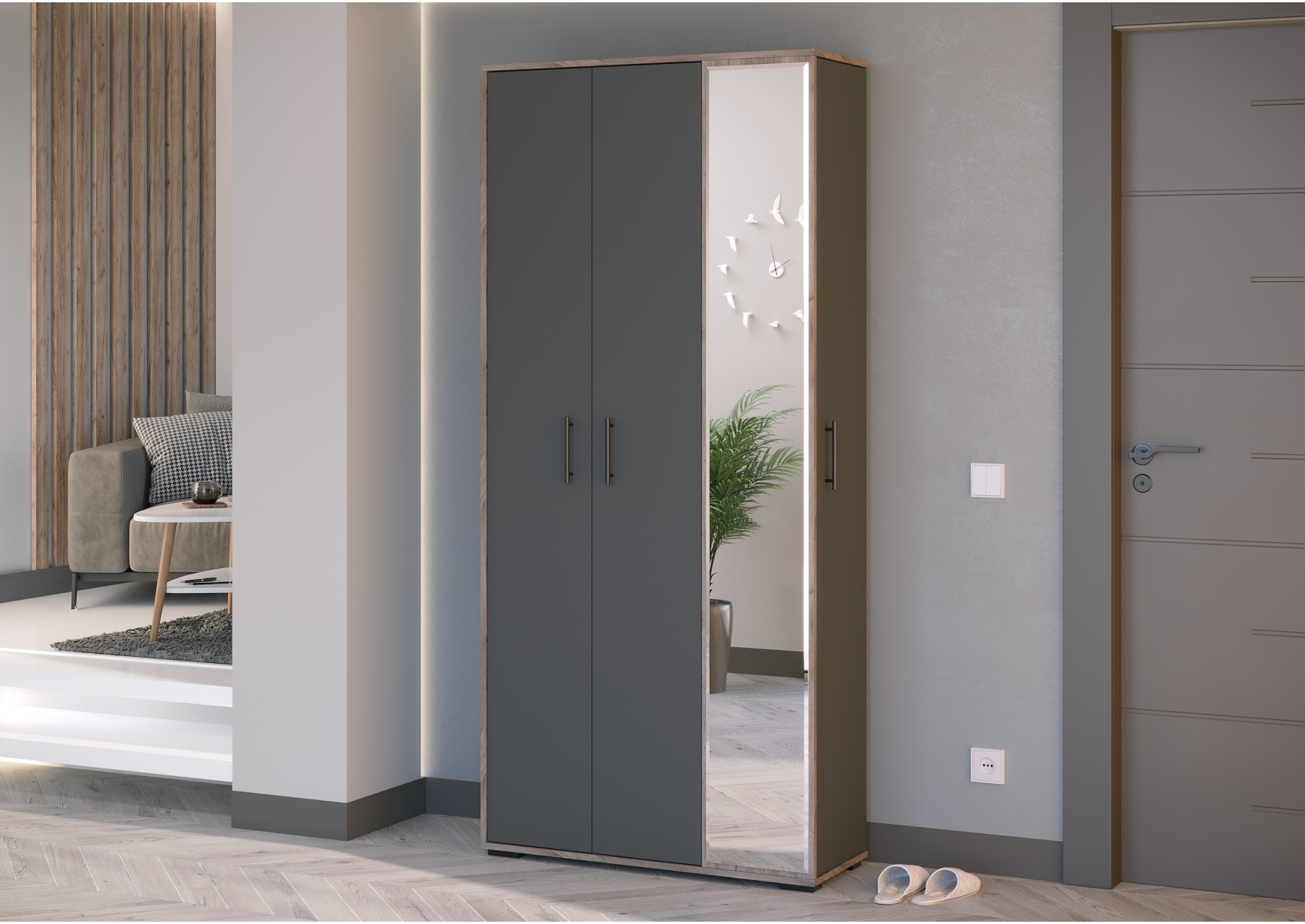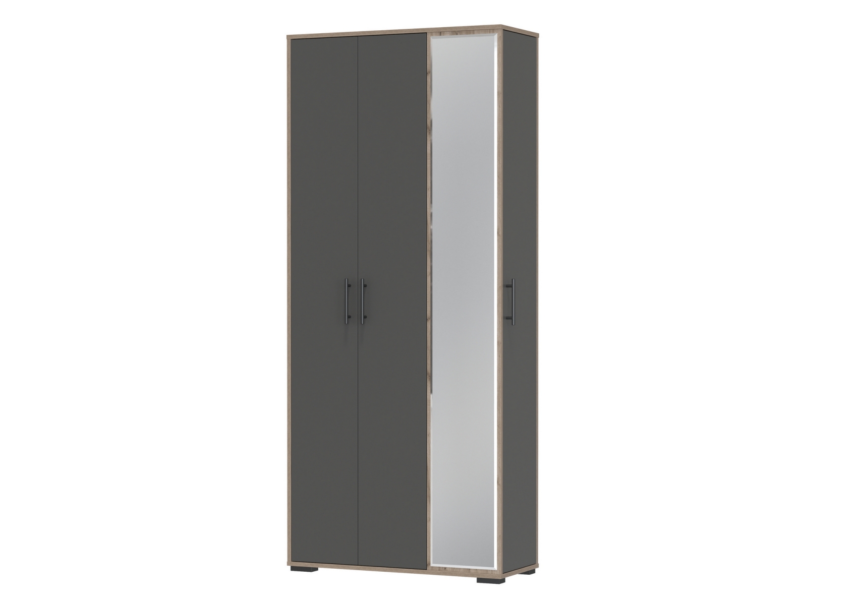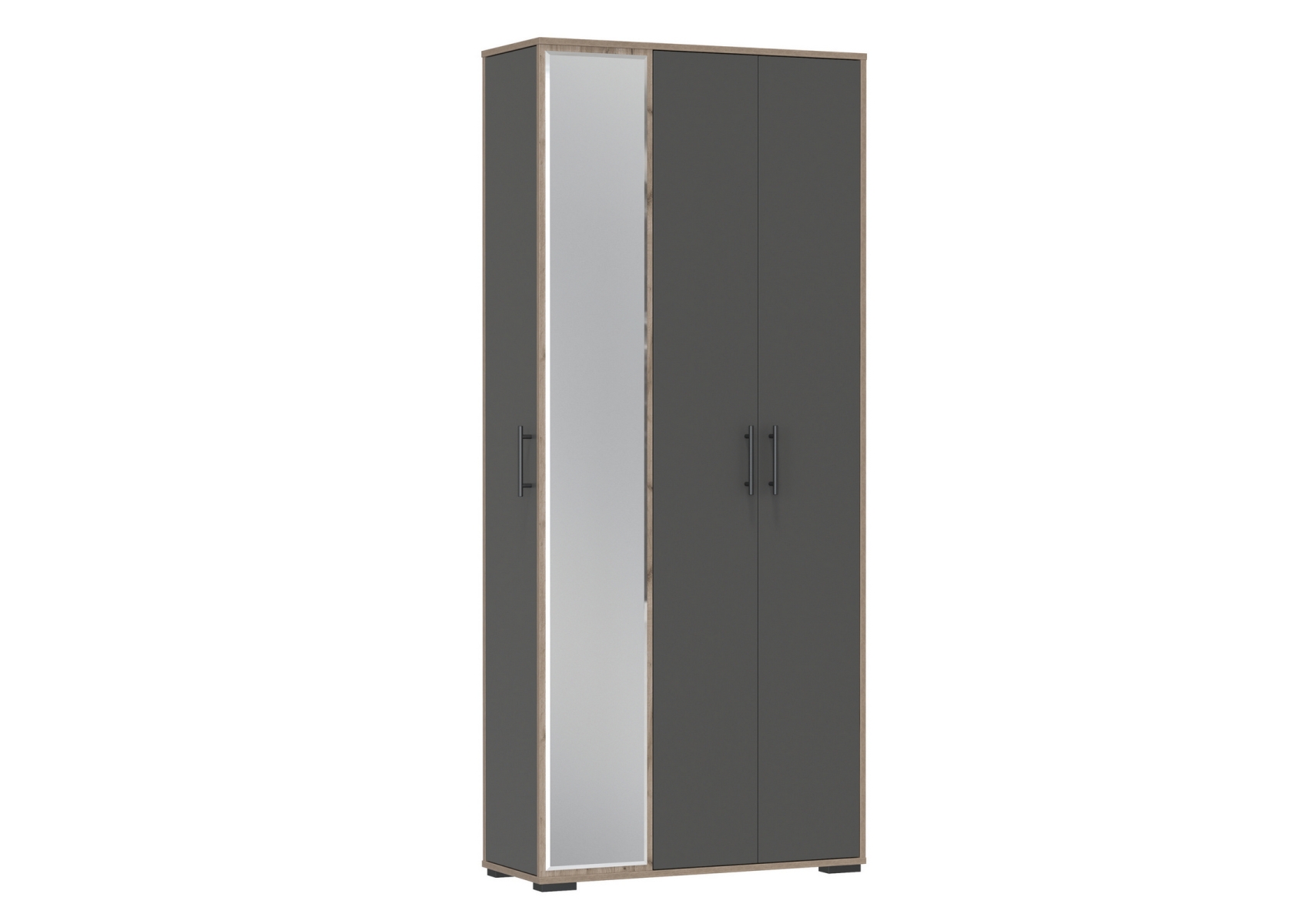 Прихожая-шкаф Домино-мини 2-3421. Цвет - дуб крафт табачный/графит. Габариты (ШхГхВ) 88х36х202 см. Компактная и вместительная прихожая состоит из шкафа для одежды, шкафа с полками и большого зеркала, украшающего фасад. Шкаф для одежды оборудован НЕ выдвижной штангой для вешалок, антресольной полкой и нижней полкой. Торцевой шкаф с 7 полками.